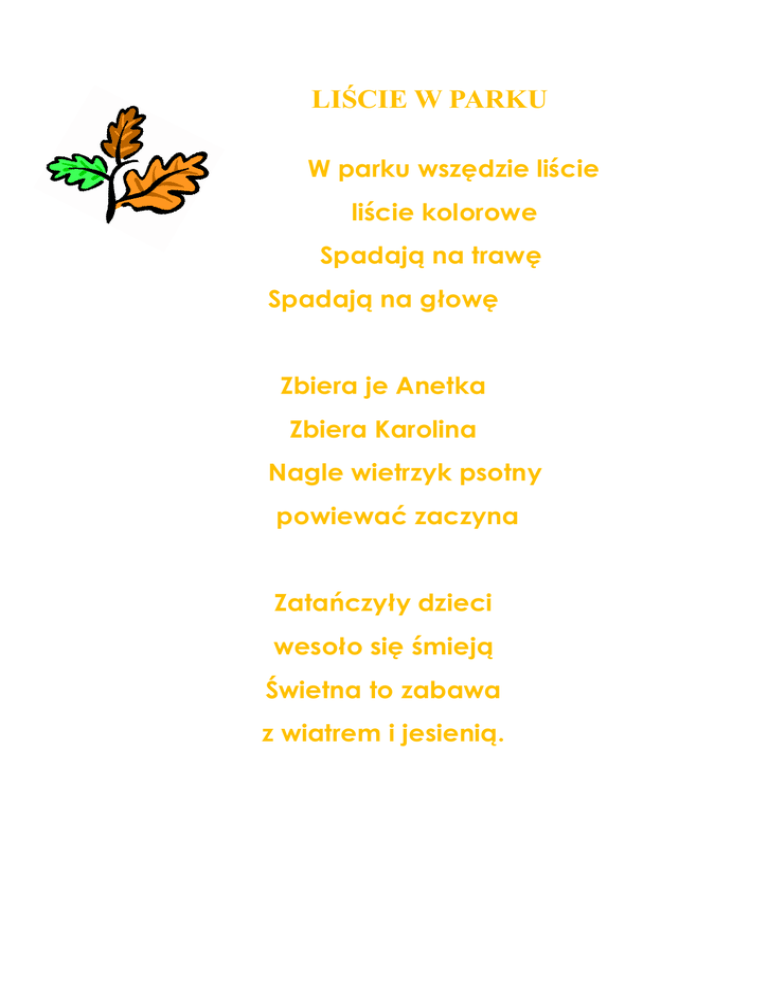 LIŚCIE W PARKU W parku wszędzie liście liście kolorowe Spadają na trawę Spadają na głowę Zbiera je Anetka Zbiera Karolina Nagle wietrzyk psotny powiewać zaczyna Zatańczyły dzieci wesoło się śmieją Świetna to zabawa z wiatrem i jesienią.