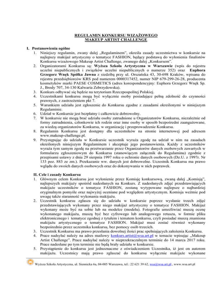 REGULAMIN KONKURSU WIZAŻOWEGO MAKEUP ARTIST CHALLENGE I. Postanowienia ogólne 1. Niniejszy regulamin, zwany dalej „Regulaminem”, określa zasady uczestnictwa w konkursie na najlepszy makijaż artystyczny o tematyce FASHION, będący podstawą do wyłonienia finalistów Konkursu wizażowego Makeup Artist Challenge, zwanego dalej „Konkursem”. 2. Organizatorami Konkursu są: Wyższa Szkoła Artystyczna w Warszawie (wpis do rejestru uczelni niepublicznych i związków uczelni niepublicznych o numerze 352) oraz Euphora Grzegorz Wnęk Spółka Jawna z siedzibą przy ul. Orszańska 43, 30-698 Kraków, wpisana do rejestru przedsiębiorców KRS pod numerem 0000317452, numer NIP 679-299-26-28, producenta kosmetyków marki PAESE COSMETICS (adres korespondencyjny: Euphora Grzegorz Wnęk Sp. J., Brody 707, 34-130 Kalwaria Zebrzydowska). 3. Konkurs odbywać się będzie na terytorium Rzeczpospolitej Polskiej. 4. Uczestnikami konkursu mogą być wyłącznie osoby posiadające pełną zdolność do czynności prawnych, z zastrzeżeniem pkt 7. 5. Warunkiem udziału jest zgłoszenie do Konkursu zgodne z zasadami określonymi w niniejszym Regulaminie. 6. Udział w Konkursie jest bezpłatny i całkowicie dobrowolny. 7. W konkursie nie mogą brać udziału osoby zatrudnione u Organizatorów Konkursu, niezależnie od formy zatrudnienia, członkowie ich rodzin oraz inne osoby w sposób bezpośredni zaangażowane, za wiedzą organizatorów Konkursu, w organizację i przeprowadzenie Konkursu. 8. Regulamin Konkursu jest dostępny dla uczestników na stronie internetowej pod adresem www.makeup-challenge.pl. 9. Przystępując do udziału w Konkursie uczestnik wyraża zgodę na udział w nim na zasadach określonych niniejszym Regulaminem i akceptuje jego postanowienia. Każdy z uczestników wyraża tym samym zgodę na przetwarzanie przez Organizatorów danych osobowych zawartych w formularzu zgłoszeniowym do Konkursu (stanowiącym załącznik do Regulaminu) zgodnie z przepisami ustawy z dnia 29 sierpnia 1997 roku o ochronie danych osobowych (Dz.U. z 1997r. Nr 133 poz. 883 ze zm.). Przekazanie ww. danych jest dobrowolne. Uczestnik Konkursu ma prawo wglądu do swoich danych osobowych oraz do dokonywania w nich poprawek. II. Cele i zasady Konkursu 1. Głównym celem Konkursu jest wyłonienie przez Komisję konkursową, zwaną dalej „Komisją”, najlepszych makijaży spośród nadesłanych na Konkurs. Z nadesłanych zdjęć przedstawiających makijaże uczestników o tematyce FASHION, zostaną wytypowane najlepsze o najbardziej oryginalnym pomyśle oraz najwyżej oceniane pod względem artystycznym. Komisja weźmie pod uwagę także staranność wykonania makijażu. 2. Uczestnik konkursu zgłasza się do udziału w konkursie poprzez wysłanie trzech zdjęć przedstawiających wykonany przez niego makijaż artystyczny o tematyce FASHION. Makijaż wykonany może być na sobie lub na modelce (modelu). Fotografie umożliwiać muszą ocenę wykonanego makijażu, muszą być bez cyfrowego lub analogowego retuszu, w formie pliku elektronicznego i tematyce zgodnej z tytułem i tematem konkursu, czyli posiadać muszą znamiona makijażu artystycznego o tematyce FASHION. Makijaż musi zostać również wykonany bezpośrednio przez uczestnika konkursu, bez pomocy osób trzecich. 3. Uczestnik Konkursu ma prawo przesłania dowolnej ilości prac spełniających założenia Konkursu. 4. Prace nadsyłać należy na adres mailowy [email protected] w temacie wpisując „Makeup Artist Challenge”. Prace nadsyłać należy w nieprzekraczalnym terminie do 14 marca 2017 roku. Prace nadesłane po tym terminie nie będą brały udziału w konkursie. 5. Przystąpienie do konkursu jest jednoznaczne z oświadczeniem Uczestnika, iż jest on autorem makijażu. Uczestnicy mają prawo zgłaszać do konkursu wyłącznie makijaże wykonane Wyższa Szkoła Artystyczna, ul. Siennicka 6a, 04-005 Warszawa, tel.: 22 621 39 62, [email protected]., www.wsa.art.pl samodzielnie. 6. Do zgłaszanych zdjęć należy dołączyć w wiadomości mailowej skan wypełnionego i podpisanego formularza zgłoszeniowego zamieszczonego na stronie internetowej konkursu. Formularz zgłoszeniowy, o którym mowa wyżej można również przesłać lub dostarczyć osobiście w Wyższej Szkole Artystycznej w Warszawie (adres ul. Siennicka 6a, 04-005 Warszawa). 7. Komisja konkursowa wyłoni 6 osób będących autorami najlepszych makijaży.. Sześciu finalistów zaproszonych zostanie na ostatni etap konkursu – Wielki Finał, który odbędzie się w dniu 27 marca 2017 roku w siedzibie Wyższej Szkole Artystycznej w Warszawie. Nazwiska finalistów zostaną opublikowane na stronie www.makeup-challenge.pl. Podczas Finału na podstawie makijażu przygotowanego na żywo na modelce (modelu), wyłoniony zostanie poprzez Jury (skład Jury podany zostanie minimum tydzień przed Finałem) zwycięzca oraz zdobywca drugiego i trzeciego miejsca. 8. Organizatorzy zastrzegają sobie prawo wykorzystania nadesłanych prac w sposób opisany w pkt. VII niniejszego Regulaminu. 9. Uczestnicy Konkursu wyrażają zgodę na bezpłatne wykorzystanie nadesłanych zdjęć przez Organizatorów w sposób opisany w pkt. VII niniejszego regulaminu. III. Wybór finalistów w drodze głosowania. 1. Przesłane na Konkurs prace zostaną ocenione przez Komisję, która wybierze 6 finalistów. 2. Finaliści ogłoszeni zostaną na stronie Konkursu do dnia 17.03.2017. IV. Czas trwania konkursu 1. Konkurs zostanie przeprowadzony w okresie od 23 stycznia 2017 r. do 27 marca 2017r. V. Komisja konkursowa W celu zapewnienia prawidłowej organizacji i przebiegu konkursu, a w szczególności w celu dokonania oceny prawidłowości zgłoszeń konkursowych, dokonania wyboru zwycięzców konkursu oraz finalistów w głosowaniu, Organizatorzy powołają komisję konkursową. W skład Komisji wejdą osoby delegowane przez Rektora Wyższej Szkoły Artystycznej oraz Euphora Grzegorz Wnęk Spółka Jawna – w równej l
