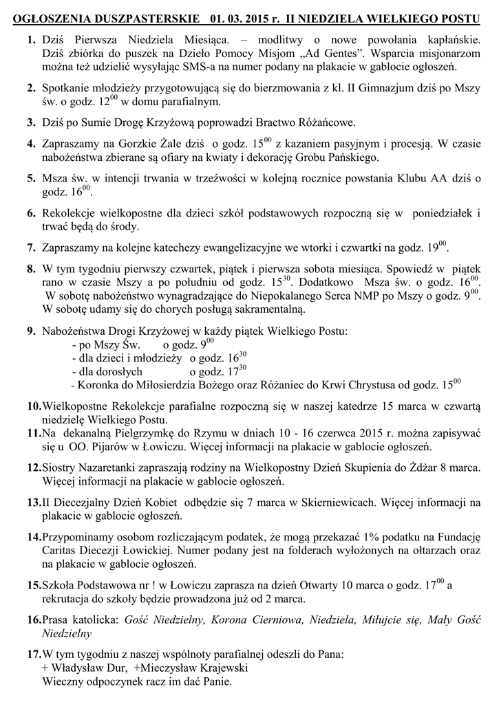 OGŁOSZENIA DUSZPASTERSKIE 01. 03. 2015 r. II NIEDZIELA