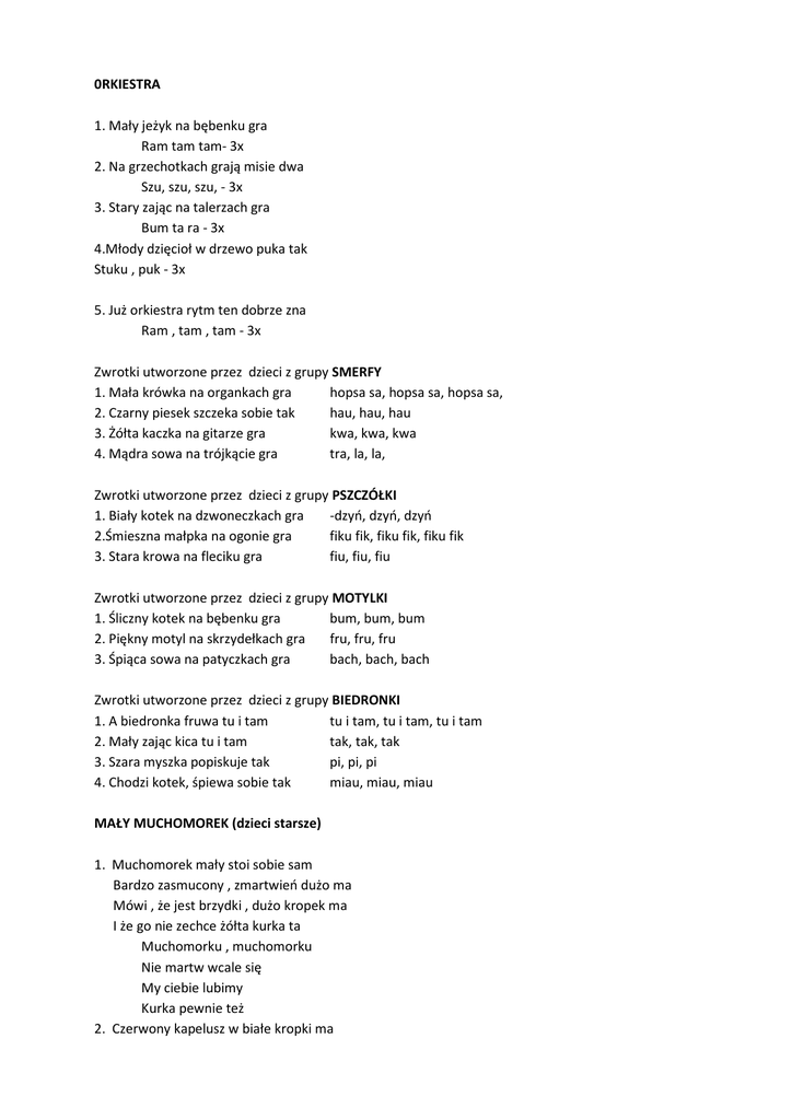 0RKIESTRA 1. Mały jeżyk na bębenku gra Ram tam tam- 3x 2. Na grzechotkach grają misie dwa Szu, szu, szu, - 3x 3. Stary zając na talerzach gra Bum ta ra - 3x 4.Młody dzięcioł w drzewo puka tak Stuku , puk - 3x 5. Już orkiestra rytm ten dobrze zna Ram , tam , tam - 3x Zwrotki utworzone przez dzieci z grupy SMERFY 1. Mała krówka na organkach gra hopsa sa, hopsa sa, hopsa sa, 2. Czarny piesek szczeka sobie tak hau, hau, hau 3. Żółta kaczka na gitarze gra kwa, kwa, kwa 4. Mądra sowa na trójkącie gra tra, la, la, Zwrotki utworzone przez dzieci z grupy PSZCZÓŁKI 1. Biały kotek na dzwoneczkach gra -dzyń, dzyń, dzyń 2.Śmieszna małpka na ogonie gra fiku fik, fiku fik, fiku fik 3. Stara krowa na fleciku gra fiu, fiu, fiu Zwrotki utworzone przez dzieci z grupy MOTYLKI 1. Śliczny kotek na bębenku gra bum, bum, bum 2. Piękny motyl na skrzydełkach gra fru, fru, fru 3. Śpiąca sowa na patyczkach gra bach, bach, bach Zwrotki utworzone przez dzieci z grupy BIEDRONKI 1. A biedronka fruwa tu i tam tu i tam, tu i tam, tu i tam 2. Mały zając kica tu i tam tak, tak, tak 3. Szara myszka popiskuje tak pi, pi, pi 4. Chodzi kotek, śpiewa sobie tak miau, miau, miau MAŁY MUCHOMOREK (dzieci starsze) 1. Muchomorek mały stoi sobie sam Bardzo zasmucony , zmartwień dużo ma Mówi , że jest brzydki , dużo kropek ma I że go nie zechce żółta kurka ta Muchomorku , muchomorku Nie martw wcale się My ciebie lubimy Kurka pewnie też 2. Czerwony kapelusz w białe kropki ma Na swej nodze stoi, grzecznie prosi tak Kurko moja miła zechciej dzisiaj mnie Jestem grzyb trujący, lecz tańcować chcę. Muchomorku , muchomorku Nie martw wcale się My ciebie lubimy Kurka pewnie też. JESIEŃ 1. Jesienna pogoda, pada deszcz Parasol więc na spacer weź Jesienna pogoda, lata szkoda Które odeszło gdzieś Kap, kap, kap Deszcz z nieba pada, Kap, kap, kap Szkoda, że nie czekolada 2. Jesienny wicherek liście gna, W prawo i w lewo, raz i dwa Jesienny wicherek ma rowerek Którym objeżdża świat. Kap, kap, kap Deszcz z nieba pada, Kap, kap, kap Szkoda, że nie czekolada KTO TO TAKI ? (dzieci młodsze) Kto to ? Kto to ? Kto to taki ? To wesołe przedszkolaki Ty mnie znasz, ja Cię znam, A na imię mam ….. GDY BRZMI PIOSNKA (dzieci młodsze) - taniec ze śpiewem 1. Gdy brzmi piosnka tańczyć chcę Daj mi obie rączki swe Jedna ta , druga ta Dookoła raz i dwa 2. Gdy brzmi piosnka tańczyć chcę tupnij nogą , poklep mnie Tańczysz ty, tańczę ja Dookoła raz i dwa SIEDMIOKROCZEK - zabawa ruchowa ze śpiewem (dzieci starsze) 1. Najpierw siedem kroków w przód Potem siedem kroków w tył Trala la, trala la I już każdy taniec zna. 2. Potem ręce weź pod bok Podskocz siedem razy, hop Hop, hop, hop, hop, hop, hop Jaki łatwy ten podskok. 3. Do kolegi odwróć się Klepnij w rękę albo dwie Hejże ha, hejże ha I już tańczysz tak jak ja. 4. W kole stańmy wszyscy wraz I zatańczmy jeszcze raz Trala la, trala la I zabawa dalej trwa.