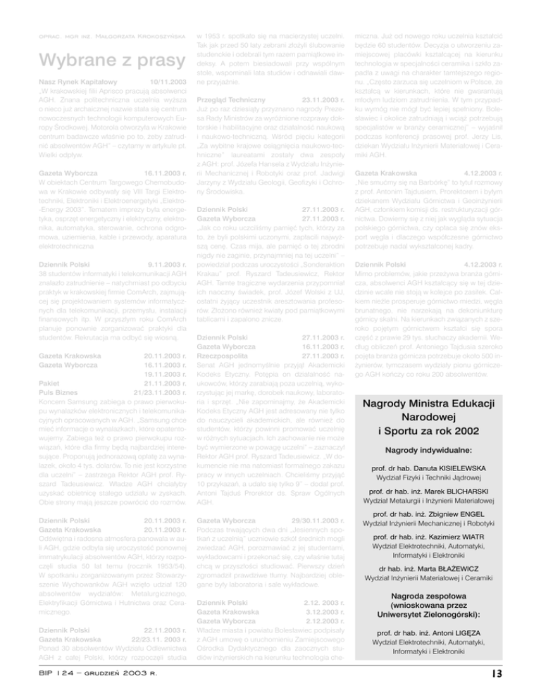 oprac. mgr in¿. Ma³gorzata Krokoszyñska Wybrane z prasy Nasz Rynek Kapita³owy 10/11.2003 „W krakowskiej filii Aprisco pracuj¹ absolwenci AGH. Znana politechniczna uczelnia wy¿sza o nieco ju¿ archaicznej nazwie sta³a siê centrum nowoczesnych technologii komputerowych Europy Œrodkowej. Motorola otworzy³a w Krakowie centrum badawcze w³aœnie po to, ¿eby zatrudniæ absolwentów AGH” – czytamy w artykule pt. Wielki odp³yw. Gazeta Wyborcza 16.11.2003 r. W obiektach Centrum Targowego Chemobudowa w Krakowie odbywa³y siê VIII Targi Elektrotechniki, Elektroniki i Elektroenergetyki „Elektro-Energy 2003”. Tematem imprezy by³a energetyka, osprzêt energetyczny i elektryczny, elektronika, automatyka, sterowanie, ochrona odgromowa, uziemienia, kable i przewody, aparatura elektrotechniczna Dziennik Polski 9.11.2003 r. 38 studentów informatyki i telekomunikacji AGH znalaz³o zatrudnienie – natychmiast po odbyciu praktyk w krakowskiej firmie ComArch, zajmuj¹cej siê projektowaniem systemów informatycznych dla telekomunikacji, przemys³u, instalacji finansowych itp. W przysz³ym roku ComArch planuje ponownie zorganizowaæ praktyki dla studentów. Rekrutacja ma odbyæ siê wiosn¹. Gazeta Krakowska Gazeta Wyborcza 20.11.2003 r. 16.11.2003 r. 19.11.2003 r. Pakiet 21.11.2003 r. Puls Biznes 21/23.11.2003 r. Koncern Samsung zabiega o prawo pierwokupu wynalazków elektronicznych i telekomunikacyjnych opracowanych w AGH. „Samsung chce mieæ informacje o wynalazkach, które opatentowujemy. Zabiega te¿ o prawo pierwokupu rozwi¹zañ, które dla firmy bêd¹ najbardziej interesuj¹ce. Proponuj¹ jednorazow¹ op³atê za wynalazek, oko³o 4 tys. dolarów. To nie jest korzystne dla uczelni” – zastrzega Rektor AGH prof. Ryszard Tadeusiewicz. W³adze AGH chcia³yby uzyskaæ obietnicê sta³ego udzia³u w zyskach. Obie strony maj¹ jeszcze powróciæ do rozmów. Dziennik Polski 20.11.2003 r. Gazeta Krakowska 20.11.2003 r. Odœwiêtna i radosna atmosfera panowa³a w auli AGH, gdzie odby³a siê uroczystoœæ ponownej immatrykulacji absolwentów AGH, którzy rozpoczêli studia 50 lat temu (rocznik 1953/54). W spotkaniu zorganizowanym przez Stowarzyszenie Wychowanków AGH wziê³o udzia³ 120 absolwentów wydzia³ów: Metalurgicznego, Elektryfikacji Górnictwa i Hutnictwa oraz Ceramicznego. Dziennik Polski 22.11.2003 r. Gazeta Krakowska 22/23.11. 2003 r. Ponad 30 absolwentów Wydzia³u Odlewnictwa AGH z ca³ej Polski, którzy rozpoczêli studia BIP 124 – grudzieñ 2003 r. w 1953 r. spotka³o siê na macierzystej uczelni. Tak jak przed 50 laty zebrani z³o¿yli œlubowanie studenckie i odebrali tym razem pami¹tkowe indeksy. A potem biesiadowali przy wspólnym stole, wspominali lata studiów i odnawiali dawne przyjaŸnie. Przegl¹d Techniczny 23.11.2003 r. Ju¿ po raz dziesi¹ty przyznano nagrody Prezesa Rady Ministrów za wyró¿nione rozprawy doktorskie i habilitacyjne oraz dzia³alnoœæ naukow¹ i naukowo-techniczn¹. Wœród piêciu kategorii „Za wybitne krajowe osi¹gniêcia naukowo-techniczne” laureatami zosta³y dwa zespo³y z AGH: prof. Józefa Hansela z Wydzia³u In¿ynierii Mechanicznej i Robotyki oraz prof. Jadwigi Jarzyny z Wydzia³u Geologii, Geofizyki i Ochrony Œrodowiska. Dziennik Polski 27.11.2003 r. Gazeta Wyborcza 27.11.2003 r. „Jak co roku uczciliœmy pamiêæ tych, którzy za to, ¿e byli polskimi uczonymi, zap³acili najwy¿sz¹ cenê. Czas mija, ale pamiêæ o tej zbrodni nigdy nie zaginie, przynajmniej na tej uczelni” – powiedzia³ podczas uroczystoœci „Sonderaktion Krakau” prof. Ryszard Tadeusiewicz, Rektor AGH. Tamte tragiczne wydarzenia przypomnia³ ich naoczny œwiadek, prof. Józef Wolski z UJ, ostatni ¿yj¹cy uczestnik aresztowania profesorów. Z³o¿ono równie¿ kwiaty pod pami¹tkowymi tablicami i zapalono znicze. Dziennik Polski 27.11.2003 r. Gazeta Wyborcza 16.11.2003 r. Rzeczpospolita 27.11.2003 r. Senat AGH jednomyœlnie przyj¹³ Akademicki Kodeks Etyczny. Potêpia on dzia³alnoœæ naukowców, którzy zarabiaj¹ poza uczelni¹, wykorzystuj¹c jej markê, dorobek naukowy, laboratoria i sprzêt. „Nie zapominajmy, ¿e Akademicki Kodeks Etyczny AGH jest adresowany nie tylko do nauczycieli akademickich, ale równie¿ do studentów, którzy powinni promowaæ uczelniê w ró¿nych sytuacjach. Ich zachowanie nie mo¿e byæ wymierzone w powagê uczelni” – zaznaczy³ Rektor AGH prof. Ryszard Tadeusiewicz. „W dokumencie nie ma natomiast formalnego zakazu pracy w innych uczelniach. Chcieliœmy przyj¹æ 10 przykazañ, a uda³o siê tylko 9” – doda³ prof. Antoni Tajduœ Prorektor ds. Spraw Ogólnych AGH. Gazeta Wyborcza 29/30.11.2003 r. Podczas trwaj¹cych dwa dni „Jesiennych spotkañ z uczelni¹” uczniowie szkó³ œrednich mogli zwiedzaæ AGH, porozmawiaæ z jej studentami, wyk³adowcami i przekonaæ siê, czy w³aœnie tutaj chc¹ w przysz³oœci studiowaæ. Pierwszy dzieñ zgromadzi³ prawdziwe t³umy. Najbardziej oblegane by³y laboratoria i sale wyk³adowe. Dziennik Polski 2.12. 2003 r. Gazeta Krakowska 3.12.2003 r. Gazeta Wyborcza 2.12.2003 r. W³adze miasta i powiatu Boles³awiec podpisa³y z AGH umowê o uruchomieniu Zamiejscowego Oœrodka Dydaktycznego dla zaocznych studiów in¿ynierskich na kierunku technologia che- miczna. Ju¿ od nowego roku uczelnia kszta³ciæ bêdzie 60 studentów. Decyzja o utworzeniu zamiejscowej placówki kszta³c¹cej na kierunku technologia w specjalnoœci ceramika i szk³o zapad³a z uwagi na charakter tamtejszego regionu. „Czêsto zarzuca siê uczelniom w Polsce, ¿e kszta³c¹ w kierunkach, które nie gwarantuj¹ m³odym ludziom zatrudnienia. W tym przypadku wymóg nie móg³ byæ lepiej spe³niony. Boles³awiec i okolice zatrudniaj¹ i wci¹¿ potrzebuj¹ specjalistów w bran¿y ceramicznej” – wyjaœni³ podczas konferencji prasowej prof. Jerzy Lis, dziekan Wydzia³u In¿ynierii Materia³owej i Ceramiki AGH. Gazeta Krakowska 4.12.2003 r. „Nie smuæmy siê na Barbórkê” to 