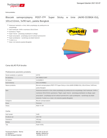 Starogard Gdański 2017-03-07 Karta produktu: Bloczek samoprzylepny POST-IT® Super Sticky w linie (4690-SS3BGK-EU), 101x152mm, 3x90 kart., paleta Bangkok Kolorowe karteczki w linie, które przyklejają się praktycznie do wszystkiego Ilość karteczek: 3x90 w rozmiarze 101x152mm Gramatura: 74gsm Super mocne - pozostają przyklejone na długo Super przyczepne - przyklejają się do trudnych powierzchni Super przebojowe - wyróżniają się dzięki kolorom 3 sztuk w j.s. Kolor: mix kolorów (paleta Bangkok) Cena 66,40 PLN brutto Podstawowe parametry produktu Numer produktu w systemie 63735 Nr dostawcy 3M-70005271997 Nr Celcen 14-01090-9 Kod kreskowy 0051141998862 Nazwa produktu Bloczek samoprzylepny POST-IT® Super Sticky w linie (4690-SS3BGK-EU), 101x152mm, 3x90 kart., paleta Bangkok Opis Kolorowe karteczki w linie, które przyklejają się praktycznie do wszystkiego; ilość karteczek: 3x90 w rozmiarze 101x152mm; gramatura: 74gsm; super mocne - pozostają przyklejone na długo; super przyczepne - przyklejają się do trudnych powierzchni; super przebojowe - wyróżniają się dzięki kolorom; 3 sztuk w j.s.; kolor: mix kolorów (paleta Bangkok) Kategoria Bloczki samoprzylepne Klasa Premium Marka POST-IT-3M Cecha Ilość kartek 3x90 W ofercie od 2017-02 Gramatura 182.png Rodzaj W linie Typ Super sticky Hurtowania Papieru - Borma ul. Sambora 3 83-200 Starogard Gdański NIP: 592 10 36 627 REGON: 190916154 +48 (58) 56 221 37 Starogard Gdański 2017-03-07 Karta katalogowa produktu cd. Bloczek samoprzylepny POST-IT® Super Sticky w linie 101x152mm, 3x90 kart., paleta Bangkok Produkt Bloczek Materiał Papier Kształt Standard Wymiary Wymiary (mm) 101x152 Gramatura (g/m2) 74 Wspólny słownik zamówień CPV 22816300-6 Bloczki samoprzylepnych karteczek na notatki Certyfikaty Hit Standard Nowy produkt w ofercie Nowość Kolor Kolor Mix kolorów Pozostałe zdjęcia produktu Serdecznie zapraszamy do współpracy Hurtowania Papieru - Borma zespół. Hurtowania Papieru - Borma ul. Sambora 3 83-200 Starogard Gdański NIP: 592 10 36 627 REGON: 190916154 +48 (58) 56 221 37 (4690-SS3BGK-EU),