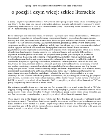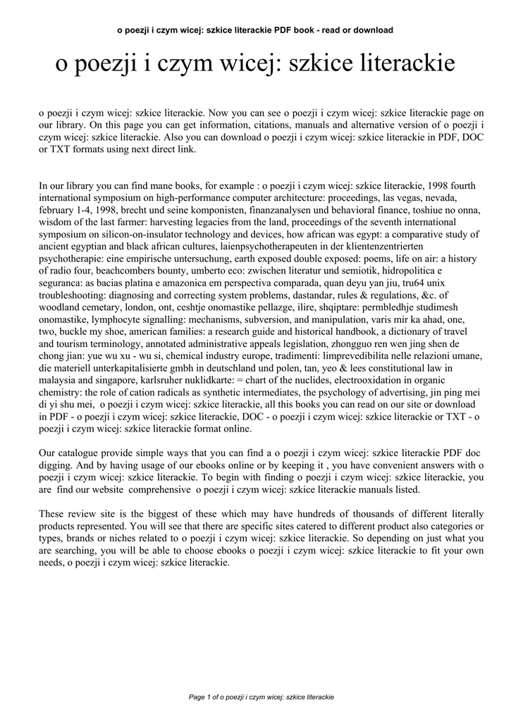 o poezji i czym wicej: szkice literackie PDF book - read or download o poezji i czym wicej: szkice literackie o poezji i czym wicej: szkice literackie. Now you can see o poezji i czym wicej: szkice literackie page on our library. On this page you can get information, citations, manuals and alternative version of o poezji i czym wicej: szkice literackie. Also you can download o poezji i czym wicej: szkice literackie in PDF, DOC or TXT formats using next direct link. In our library you can find mane books, for example : o poezji i czym wicej: szkice literackie, 1998 fourth international symposium on high-performance computer architecture: proceedings, las vegas, nevada, february 1-4, 1998, brecht und seine komponisten, finanzanalysen und behavioral finance, toshiue no onna, wisdom of the last farmer: harvesting legacies from the land, proceedings of the seventh international symposium on silicon-on-insulator technology and devices, how african was egypt: a comparative study of ancient egyptian and black african cultures, laienpsychotherapeuten in der klientenzentrierten psychotherapie: eine empirische untersuchung, earth exposed double exposed: poems, life on air: a history of radio four, beachcombers bounty, umberto eco: zwischen literatur und semiotik, hidropolitica e seguranca: as bacias platina e amazonica em perspectiva comparada, quan deyu yan jiu, tru64 unix troubleshooting: diagnosing and correcting system problems, dastandar, rules & regulations, &c. of woodland cemetary, london, ont, ceshtje onomastike pellazge, ilire, shqiptare: permbledhje studimesh onomastike, lymphocyte signalling: mechanisms, subversion, and manipulation, varis mir ka ahad, one, two, buckle my shoe, american families: a research guide and historical handbook, a dictionary of travel and tourism terminology, annotated administrative appeals legislation, zhongguo ren wen jing shen de chong jian: yue wu xu - wu si, chemical industry europe, tradimenti: limprevedibilita nelle relazioni umane, die materiell unterkapitalisierte gmbh in deutschland und polen, tan, yeo & lees constitutional law in malaysia and singapore, karlsruher nuklidkarte: = chart of the nuclides, electrooxidation in organic chemistry: the role of cation radicals as synthetic intermediates, the psychology of advertising, jin ping mei di yi shu mei, o poezji i czym wicej: szkice literackie, all this books you can read on our site or download in PDF - o poezji i czym wicej: szkice literackie, DOC - o poezji i czym wicej: szkice literackie or TXT - o poezji i czym wicej: szkice literackie format online. Our catalogue provide simple ways that you can find a o poezji i czym wicej: szkice literackie PDF doc digging. And by having usage of our ebooks online or by keeping it , you have convenient answers with o poezji i czym wicej: szkice literackie. To begin with finding o poezji i czym wicej: szkice literackie, you are find our website comprehensive o poezji i czym wicej: szkice literackie manuals listed. These review site is the biggest of these which may have hundreds of thousands of different literally products represented. You will see that there are specific sites catered to different product also categories or types, brands or niches related to o poezji i czym wicej: szkice literackie. So depending on just what you are searching, you will be able to choose ebooks o poezji i czym wicej: szkice literackie to fit your own needs, o poezji i czym wicej: szkice literackie. Page 1 of o poezji i czym wicej: szkice literackie