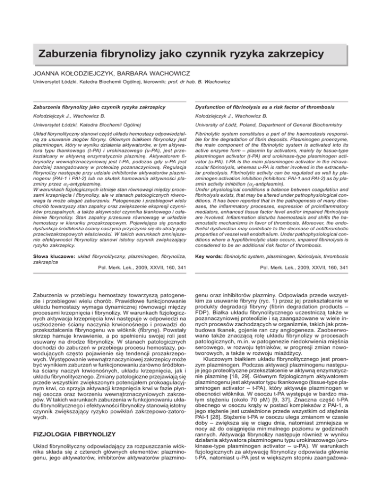 Zaburzenia fibrynolizy jako czynnik ryzyka zakrzepicy 341 Zaburzenia fibrynolizy jako czynnik ryzyka zakrzepicy JOANNA KOŁODZIEJCZYK, BARBARA WACHOWICZ Uniwersytet Łódzki, Katedra Biochemii Ogólnej, kierownik: prof. dr hab. B. Wachowicz Zaburzenia fibrynolizy jako czynnik ryzyka zakrzepicy Dysfunction of fibrinolysis as a risk factor of thrombosis Kołodziejczyk J., Wachowicz B. Kołodziejczyk J., Wachowicz B. Uniwersytet Łódzki, Katedra Biochemii Ogólnej University of Łódź, Poland, Department of General Biochemistry Układ fibrynolityczny stanowi część układu hemostazy odpowiedzialną za usuwanie złogów fibryny. Głównym białkiem fibrynolizy jest plazminogen, który w wyniku działania aktywatorów, w tym aktywatora typu tkankowego (t-PA) i urokinazowego (u-PA), jest przekształcany w aktywną enzymatycznie plazminę. Aktywatorem fibrynolizy wewnątrznaczyniowej jest t-PA, podczas gdy u-PA jest bardziej zaangażowany w proteolizę pozanaczyniową. Regulacja fibrynolizy następuje przy udziale inhibitorów aktywatorów plazminogenu (PAI-1 i PAI-2) lub na skutek hamowania aktywności plazminy przez a2-antyplazminę. W warunkach fizjologicznych istnieje stan równowagi między procesami krzepnięcia i fibrynolizy, ale w stanach patologicznych równowaga ta może ulegać zaburzeniu. Patogenezie i przebiegowi wielu chorób towarzyszy stan zapalny oraz zwiększenie ekspresji czynników prozapalnych, a także aktywności czynnika tkankowego i osłabienie fibrynolizy. Stan zapalny przesuwa równowagę w układzie hemostazy w kierunku prozakrzepowym. Pojawiająca się ponadto dysfunkcja śródbłonka ściany naczynia przyczynia się do utraty jego przeciwzakrzepowych właściwości. W takich warunkach zmniejszenie efektywności fibrynolizy stanowi istotny czynnik zwiększający ryzyko zakrzepicy. Fibrinolytic system constitutes a part of the haemostasis responsible for the degradation of fibrin deposits. Plasminogen proenzyme, the main component of the fibrinolytic system is activated into its active enzyme form – plasmin by activators, mainly by tissue-type plasminogen activator (t-PA) and urokinase-type plasminogen activator (u-PA). t-PA is the main plasminogen activator in the intravascular fibrinolysis, whereas u-PA is rather involved in the extracellular proteolysis. Fibrinolytic activity can be regulated as well by plasminogen activation inhibition (inhibitors: PAI-1 and PAI-2) as by plasmin activity inhibition (a2-antiplasmin). Under physiological conditions a balance between coagulation and fibrinolysis exists, that may be altered under pathophysiological conditions. It has been reported that in the pathogenesis of many diseases, the inflammatory processes, expression of proinflammatory mediators, enhanced tissue factor level and/or impaired fibrinolysis are involved. Inflammation disturbs haemostasis and shifts the haemostatic mechanisms in favor of thrombosis. Moreover, the endothelial dysfunction may contribute to the decrease of antithrombotic properties of vessel wall endothelium. Under pathophysiological conditions where a hypofibrinolytic state occurs, impaired fibrinolysis is considered to be an additional risk factor of thrombosis. Słowa kluczowe: układ fibrynolityczny, plazminogen, fibrynoliza, zakrzepica Pol. Merk. Lek., 2009, XXVII, 160, 341 Key words: fibrinolytic system, plasminogen, fibrinolysis, thrombosis Zaburzenia w przebiegu hemostazy towarzyszą patogenezie i przebiegowi wielu chorób. Prawidłowe funkcjonowanie układu hemostazy wymaga dynamicznej równowagi między procesami krzepnięcia i fibrynolizy. W warunkach fizjologicznych aktywacja krzepnięcia krwi następuje w odpowiedzi na uszkodzenie ściany naczynia krwionośnego i prowadzi do przekształcenia fibrynogenu we włóknik (fibrynę). Powstały skrzep hamuje krwawienie, a po spełnieniu swojej roli jest usuwany na drodze fibrynolizy. W stanach patologicznych dochodzi do zaburzeń w przebiegu procesu hemostazy, powodujących często pojawienie się tendencji prozakrzepowych. Występowanie wewnątrznaczyniowej zakrzepicy może być wynikiem zaburzeń w funkcjonowaniu zarówno śródbłonka ściany naczyń krwionośnych, układu krzepnięcia, jak i układu fibrynolitycznego. Zmiany patologiczne przejawiają się przede wszystkim zwiększonym potencjałem prokoagulacyjnym krwi, co sprzyja aktywacji krzepnięcia krwi w fazie płynnej osocza oraz tworzeniu wewnątrznaczyniowych zakrzepów. W takich warunkach zaburzenia w funkcjonowaniu układu fibrynolitycznego i efektywności fibrynolizy stanowią istotny czynnik zwiększający ryzyko powikłań zakrzepowo-zatorowych. genu oraz inhibitorów plazminy. Odpowiada przede wszystkim za usuwanie fibryny (ryc. 1) przez jej przekształcanie w produkty degradacji fibryny (fibrin degradation products – FDP). Białka układu fibrynolitycznego uczestniczą także w pozanaczyniowej proteolizie i są zaangażowane w wiele innych procesów zachodzących w organizmie, takich jak przebudowa tkanek, gojenie ran czy angiogeneza. Zaobserwowano także znaczącą rolę układu fibrynolizy w procesach patologicznych, m.in. w patogenezie niedokrwienia mięśnia sercowego, w rozwoju tętniaków, w progresji zmian nowotworowych, a także w rozwoju miażdżycy. Kluczowym białkiem układu fibrynolitycznego jest proenzym plazminogen. Podczas aktywacji plazminogenu następuje jego proteolityczne przekształcenie w aktywną enzymatycznie plazminę [18, 29]. Głównym fizjologicznym aktywatorem plazminogenu jest aktywator typu tkankowego (tissue-type plasminogen activator – t-PA), który aktywuje plazminogen w obecności włóknika. W osoczu t-PA występuje w bardzo małym stężeniu (około 70 pM) [9, 37]. Znaczna część t-PA obecnego w osoczu krąży w postaci kompleksów z PAI-1, a jego stężenie jest uzależnione przede wszystkim od stężenia PAI-1 [28]. Stężenie t-PA w osoczu ulega zmianom w czasie doby – zwiększa się w ciągu dnia, natomiast zmniejsza 