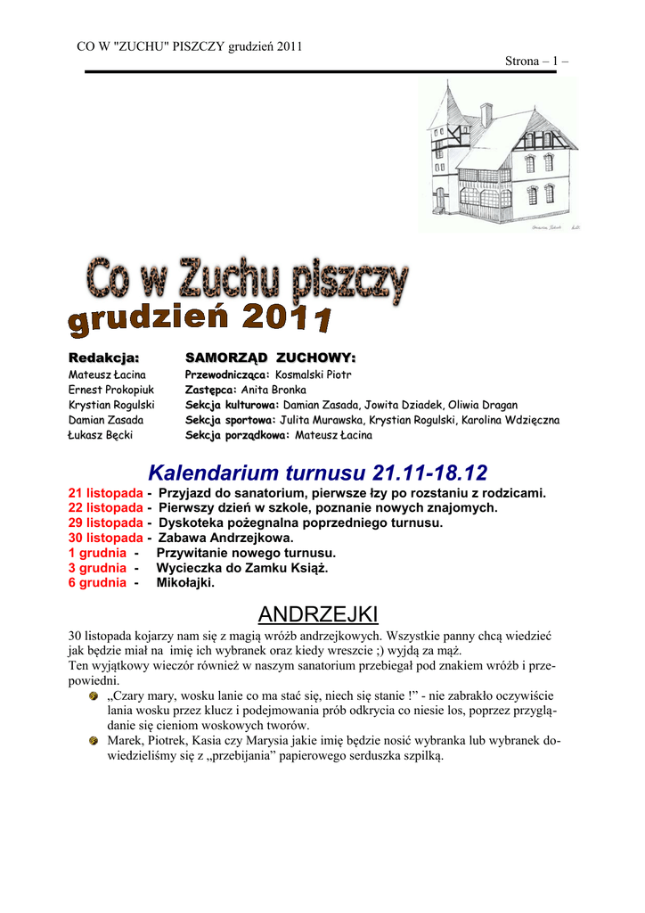 CO W "ZUCHU" PISZCZY grudzień 2011 Strona – 1 – Redakcja: Mateusz Łacina Ernest Prokopiuk Krystian Rogulski Damian Zasada Łukasz Bęcki SAMORZĄD ZUCHOWY: Przewodnicząca: Kosmalski Piotr Zastępca: Anita Bronka Sekcja kulturowa: Damian Zasada, Jowita Dziadek, Oliwia Dragan Sekcja sportowa: Julita Murawska, Krystian Rogulski, Karolina Wdzięczna Sekcja porządkowa: Mateusz Łacina Kalendarium turnusu 21.11-18.12 21 listopada 22 listopada 29 listopada 30 listopada 1 grudnia 3 grudnia 6 grudnia - Przyjazd do sanatorium, pierwsze łzy po rozstaniu z rodzicami. Pierwszy dzień w szkole, poznanie nowych znajomych. Dyskoteka pożegnalna poprzedniego turnusu. Zabawa Andrzejkowa. Przywitanie nowego turnusu. Wycieczka do Zamku Książ. Mikołajki. ANDRZEJKI 30 listopada kojarzy nam się z magią wróżb andrzejkowych. Wszystkie panny chcą wiedzieć jak będzie miał na imię ich wybranek oraz kiedy wreszcie ;) wyjdą za mąż. Ten wyjątkowy wieczór również w naszym sanatorium przebiegał pod znakiem wróżb i przepowiedni. „Czary mary, wosku lanie co ma stać się, niech się stanie !” - nie zabrakło oczywiście lania wosku przez klucz i podejmowania prób odkrycia co niesie los, poprzez przyglądanie się cieniom woskowych tworów. Marek, Piotrek, Kasia czy Marysia jakie imię będzie nosić wybranka lub wybranek dowiedzieliśmy się z „przebijania” papierowego serduszka szpilką. CO W "ZUCHU" PISZCZY grudzień 2011 Strona – 2 – Kolejna przepowiednia dotyczyła zawodu wykonywanego w przyszłości i tutaj tajemnice ukryte były na kartkach w kopertach. Ostatnią atrakcją wieczoru była wróżba z „butami” tzn. wszystkie panienki ustawiły buty z lewej nogi rzędem w kącie pokoju. Ostatni w kolejce przestawiam na początek i tak dalej. Właścicielka buta, który pierwszy dotknie czubkiem progu, może liczyć na błyskawiczną zmianę stanu cywilnego. Szczęściarą naszego sanatorium została Karolina Wencewicz, więc czekamy na zaproszenie ;). Tradycje Mikołajkowe: Mikołajki – zeświecczona nazwa dnia Świętego Mikołaja obchodzonego 6 grudnia w Polsce, obchodzona na cześć świętego biskupa Mikołaja z Miry. Jeden dzień w roku: Mikołajki to szczególny dzień w roku. Obchodzone w Polsce 6 grudnia angażują siły wszystkich dorosłych w to, aby dzieciom sprawić odrobinę radości. W bardzo szczególny sposób, bo nawet prezenty urodzinowe nie są już wtedy tak istotne, jak wizyta tego staruszka, na którą wszystkie dzieci wyczekują z dużą niecierpliwością. To św. Mikołaj jest dla nich tak ważny. Bardziej niż prezenty, które im przynosi. Dlatego dzień św. Mikołaja to czas, gdy na twarzy każdego dziecka i każdego dorosłego widnieją szerokie uśmiechy. Zwyczaje : W nocy z 5 grudnia na 6 grudnia podkłada się prezenty pod poduszkę, w buciku lub umieszcza się je w dużej skarpecie. Istnieje wiele legend związanych z tym zwyczajem. Jedna z nich, zapewne o anglosaskim rodowodzie, mówi, że 6 grudnia wczesnym rankiem, kiedy jeszcze wszystkie dzieci śpią, Święty Mikołaj zagląda przez szybkę do domu. Gdy zobaczy wyczyszczone buty, zostawia upominek dla domowników. Jeżeli zaś nie zobaczy żadnych butów lub będą one brudne, zamiast prezentu zostawi tylko zgniłą pyrę (pozn. zgniły ziemniak). 6 GRUDNIA – MIKOŁAJKI Ten szczególny dzień, również dla nas zapowiadał się niesamowicie, już od samego rana. Po śniadaniu jak zawsze poszliśmy na zabiegi. Wróciliśmy wcześniej, aby mieć trochę czasu dla siebie. Później było drugie śniadanie. Następnie poszliśmy do szkoły. Gdzie oglądaliśmy film pt; „Mikołajek”. Po szkole wróciliśmy do sanatorium, gdzie zjedliśmy obiad. Na ciszy poobiedniej stroiliśmy świetlicę i ubieraliśmy choinkę w przepiękne bombki i ozdoby. Panie wychowawczynie uczyły nas piosenek. Potem dostaliśmy podwieczorek i … Wreszcie dotarł On – Starszy CO W "ZUCHU" PISZCZY grudzień 2011 Strona – 3 – siwy Pan z długą brodą i saniami na, których miał prezenty. Dzieci recytowały wierszyki, za które otrzymy wały niespodzianki. Reszta dzieci musiała w chórku zaśpiewać piosenkę pt; „Ding Dong – spadł już śnieg”, aby otrzymać prezent – w końcu nie ma nic za darmo . Dzieci były bardzo zadowolone z niespodzianek, które dostały od Mikołaja. Później była kolacja, dzieci mało jadły ponieważ wcześniej za pchały się słodyczami. Wieczorem mieliśmy mikołajkową dyskotekę. Tradycje Bożonarodzeniowe: DZIELNIE SIĘ OPŁATKIEM Najważniejszym i najbardziej wzruszającym momentem było i jest dzielenie się poświęconym opłatkiem. Staropolskie opłatki były różnokolorowe i bardzo ozdobne. Dziś opłatki są białe i ozdobnie wytłaczane. Nazwa "opłatek" pochodzi od łacińskiego słowa "oblatum", czyli dar ofiarny. KOLĘDA Nierozłącznym elementem Świąt Bożego Narodzenia jest kolęda. Nazwa kolęda pojawiła się dawno temu. Wywodzi się ona od słowa "calendae", tak bowiem Rzymianie nazywali początek każdego miesiąca. Owe kalendy, szczególnie styczniowe, czyli noworoczne, obchodzili bardzo radośnie, bawili się, śpiewali, składali sobie życzenia i obdarowywali prezentami. Kościół katolicki zniósł stary, pogański zwyczaj obchodzenia kalend, zachowała się jednak tradycja śpiewania pobożnych pieśni, sławiących narodziny Chrystusa, odwiedzania się w domach, kupowania świątecznych podarunków. CHOINKA Na wigilie Bożego Narodzenia niemal każda polska rodzina umieszcza w swoim mieszkaniu i dekoruje choinkę. Jest to jedna z najmłodszych tradycji wigilijnych. Początkowo, w tym również na ziemiach polskich, popularna była "jodełka", czyli wierzchołek sosny, jodły lub świerku zawieszony u pułapu. Drzewko to miało chronić dom i jego mieszkańców od złych mocy. PREZENTY Wigilijny zwyczaj obdarowywania się prezentami początek swój bierze jeszcze z rzymskich Saturnaliów. W późniejszych wiekach przez Kościół z