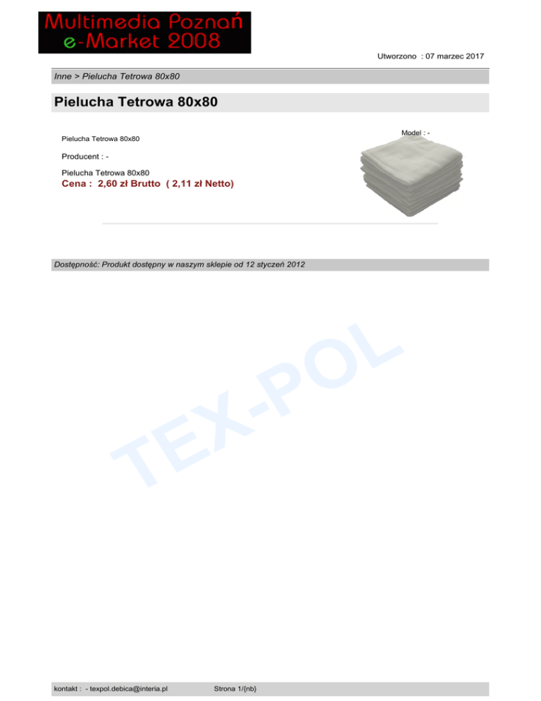 Utworzono : 07 marzec 2017 Inne > Pielucha Tetrowa 80x80 Pielucha Tetrowa 80x80 Model : - Pielucha Tetrowa 80x80 Producent : Pielucha Tetrowa 80x80 Cena : 2,60 zł Brutto ( 2,11 zł Netto) Dostępność: Produkt dostępny w naszym sklepie od 12 styczeń 2012 L O E T kontakt : - [email protected] P X Strona 1/{nb}
