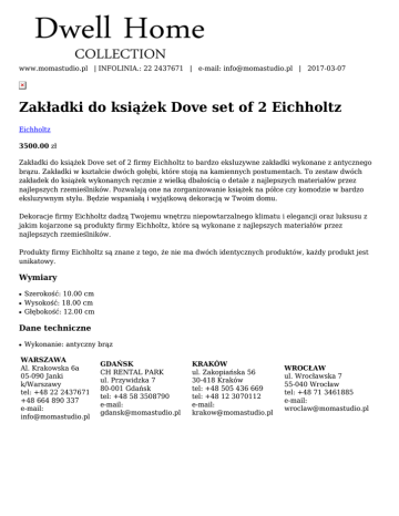 www.momastudio.pl | INFOLINIA.: 22 2437671 | e-mail: [email protected] | 2017-03-07 Zakładki do książek Dove set of 2 Eichholtz Eichholtz 3500.00 zł Zakładki do książek Dove set of 2 firmy Eichholtz to bardzo eksluzywne zakładki wykonane z antycznego brązu. Zakładki w kształcie dwóch gołębi, które stoją na kamiennych postumentach. To zestaw dwóch zakładek do książek wykonanych ręcznie z wielką dbałością o detale z najlepszych materiałów przez najlepszych rzemieślników. Pozwalają one na zorganizowanie książek na półce czy komodzie w bardzo eksluzywnym stylu. Będzie wspaniałą i wyjątkową dekoracją w Twoim domu. Dekoracje firmy Eichholtz dadzą Twojemu wnętrzu niepowtarzalnego klimatu i elegancji oraz luksusu z jakim kojarzone są produkty firmy Eichholtz, które są wykonane z najlepszych materiałów przez najlepszych rzemieślników. Produkty firmy Eichholtz są znane z tego, że nie ma dwóch identycznych produktów, każdy produkt jest unikatowy. Wymiary ● ● ● Szerokość: 10.00 cm Wysokość: 18.00 cm Głębokość: 12.00 cm Dane techniczne ● Wykonanie: antyczny brąz WARSZAWA Al. Krakowska 6a 05-090 Janki k/Warszawy tel: +48 22 2437671 +48 664 890 337 e-mail: [email protected] GDAŃSK CH RENTAL PARK ul. Przywidzka 7 80-001 Gdańsk tel: +48 58 3508790 e-mail: [email protected] KRAKÓW ul. Zakopiańska 56 30-418 Kraków tel: +48 505 436 669 tel: +48 12 3070112 e-mail: [email protected] WROCŁAW ul. Wrocławska 7 55-040 Wrocław tel: +48 71 3461885 e-mail: [email protected]