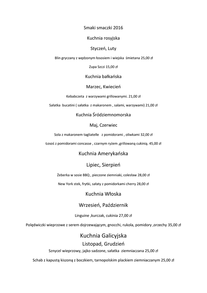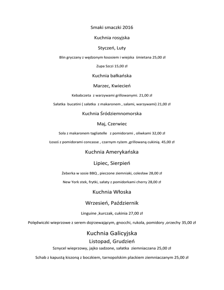 Smaki smaczki 2016 Kuchnia rosyjska Styczeń, Luty Blin gryczany z wędzonym łososiem i wiejska śmietana 25,00 zł Zupa Szczi 15,00 zł Kuchnia bałkańska Marzec, Kwiecień Kebabczeta z warzywami grillowanymi. 21,00 zł Sałatka bucatini ( sałatka z makaronem , salami, warzywami) 21,00 zł Kuchnia Śródziemnomorska Maj, Czerwiec Sola z makaronem tagliatelle z pomidorami , oliwkami 32,00 zł Łosoś z pomidorami concasse , czarnym ryżem ,grillowaną cukinią. 45,00 zł Kuchnia Amerykańska Lipiec, Sierpień Żeberka w sosie BBQ , pieczone ziemniaki, colesław 28,00 zł New York stek, frytki, sałaty z pomidorkami cherry 28,00 zł Kuchnia Włoska Wrzesień, Październik Linguine ,kurczak, cukinia 27,00 zł Polędwiczki wieprzowe z serem dojrzewającym, gnocchi, rukola, pomidory ,orzechy 35,00 zł Kuchnia Galicyjska Listopad, Grudzień Sznycel wieprzowy, jajko sadzone, sałatka ziemniaczana 25,00 zł Schab z kapustą kiszoną z boczkiem, tarnopolskim plackiem ziemniaczanym 25,00 zł
