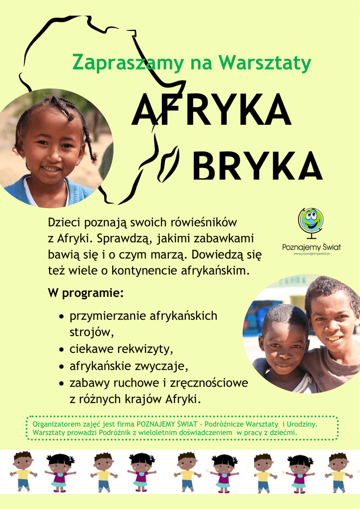 Zapraszamy na Warsztaty AFRYKA BRYKA Dzieci poznają swoich rówieśników z Afryki. Sprawdzą, jakimi zabawkami bawią się i o czym marzą. Dowiedzą się też wiele o kontynencie afrykańskim. W programie: przymierzanie afrykańskich strojów, ciekawe rekwizyty, afrykańskie zwyczaje, zabawy ruchowe i zręcznościowe z różnych krajów Afryki. Organizatorem zajęć jest firma POZNAJEMY ŚWIAT - Podróżnicze Warsztaty i Urodziny. Warsztaty prowadzi Podróżnik z wieloletnim doświadczeniem w pracy z dziećmi.