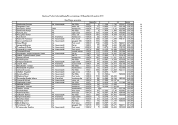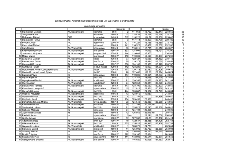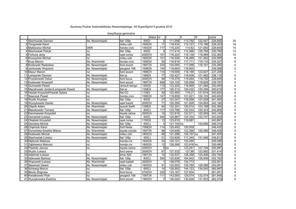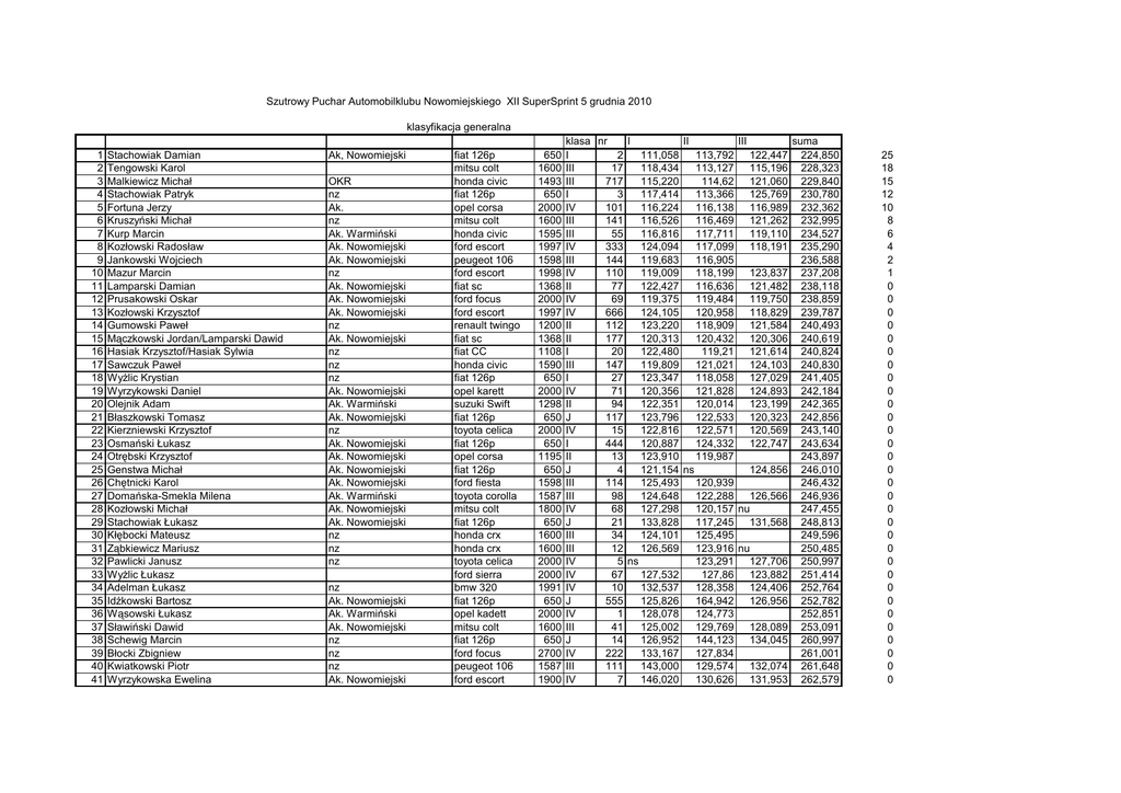 Szutrowy Puchar Automobilklubu Nowomiejskiego XII SuperSprint 5 grudnia 2010 klasyfikacja generalna 1 2 3 4 5 6 7 8 9 10 11 12 13 14 15 16 17 18 19 20 21 22 23 24 25 26 27 28 29 30 31 32 33 34 35 36 37 38 39 40 41 Stachowiak Damian Tengowski Karol Malkiewicz Michał Stachowiak Patryk Fortuna Jerzy Kruszyński Michał Kurp Marcin Kozłowski Radosław Jankowski Wojciech Mazur Marcin Lamparski Damian Prusakowski Oskar Kozłowski Krzysztof Gumowski Paweł Mączkowski Jordan/Lamparski Dawid Hasiak Krzysztof/Hasiak Sylwia Sawczuk Paweł WyŜlic Krystian Wyrzykowski Daniel Olejnik Adam Błaszkowski Tomasz Kierzniewski Krzysztof Osmański Łukasz Otrębski Krzysztof Genstwa Michał Chętnicki Karol Domańska-Smekla Milena Kozłowski Michał Stachowiak Łukasz Kłębocki Mateusz Ząbkiewicz Mariusz Pawlicki Janusz WyŜlic Łukasz Adelman Łukasz Idźkowski Bartosz Wąsowski Łukasz Sławiński Dawid Schewig Marcin Błocki Zbigniew Kwiatkowski Piotr Wyrzykowska Ewelina Ak, Nowomiejski OKR nz Ak. nz Ak. Warmiński Ak. Nowomiejski Ak. Nowomiejski nz Ak. Nowomiejski Ak. Nowomiejski Ak. Nowomiejski nz Ak. Nowomiejski nz nz nz Ak. Nowomiejski Ak. Warmiński Ak. Nowomiejski nz Ak. Nowomiejski Ak. Nowomiejski Ak. Nowomiejski Ak. Nowomiejski Ak. Warmiński Ak. Nowomiejski Ak. Nowomiejski nz nz nz nz Ak. Nowomiejski Ak. Warmiński Ak. Nowomiejski nz nz nz Ak. Nowomiejski fiat 126p mitsu colt honda civic fiat 126p opel corsa mitsu colt honda civic ford escort peugeot 106 ford escort fiat sc ford focus ford escort renault twingo fiat sc fiat CC honda civic fiat 126p opel karett suzuki Swift fiat 126p toyota celica fiat 126p opel corsa fiat 126p ford fiesta toyota corolla mitsu colt fiat 126p honda crx honda crx toyota celica ford sierra bmw 320 fiat 126p opel kadett mitsu colt fiat 126p ford focus peugeot 106 ford escort 650 1600 1493 650 2000 1600 1595 1997 1598 1998 1368 2000 1997 1200 1368 1108 1590 650 2000 1298 650 2000 650 1195 650 1598 1587 1800 650 1600 1600 2000 2000 1991 650 2000 1600 650 2700 1587 1900 klasa nr I II III suma I 2 111,058 113,792 122,447 224,850 III 17 118,434 113,127 115,196 228,323 III 717 115,220 114,62 121,060 229,840 I 3 117,414 113,366 125,769 230,780 IV 101 116,224 116,138 116,989 232,362 III 141 116,526 116,469 121,262 232,995 III 55 116,816 117,711 119,110 234,527 IV 333 124,094 117,099 118,191 235,290 III 144 119,683 116,905 236,588 IV 110 119,009 118,199 123,837 237,208 II 77 122,427 116,636 121,482 238,118 IV 69 119,375 119,484 119,750 238,859 IV 666 124,105 120,958 118,829 239,787 II 112 123,220 118,909 121,584 240,493 II 177 120,313 120,432 120,306 240,619 I 20 122,480 119,21 121,614 240,824 III 147 119,809 121,021 124,103 240,830 I 27 123,347 118,058 127,029 241,405 IV 71 120,356 121,828 124,893 242,184 II 94 122,351 120,014 123,199 242,365 J 117 123,796 122,533 120,323 242,856 IV 15 122,816 122,571 120,569 243,140 I 444 120,887 124,332 122,747 243,634 II 13 123,910 119,987 243,897 J 4 121,154 ns 124,856 246,010 III 114 125,493 120,939 246,432 III 98 124,648 122,288 126,566 246,936 IV 68 127,298 120,157 nu 247,455 J 21 133,828 117,245 131,568 248,813 III 34 124,101 125,495 249,596 III 12 126,569 123,916 nu 250,485 IV 5 ns 123,291 127,706 250,997 IV 67 127,532 127,86 123,882 251,414 IV 10 132,537 128,358 124,406 252,764 J 555 125,826 164,942 126,956 252,782 IV 1 128,078 124,773 252,851 III 41 125,002 129,769 128,089 253,091 J 14 126,952 144,123 134,045 260,997 IV 222 133,167 127,834 261,001 III 111 143,000 129,574 132,074 261,648 IV 7 146,020 130,626 131,953 262,579 25 18 15 12 10 8 6 4 2 1 0 0 0 0 0 0 0 0 0 0 0 0 0 0 0 0 0 0 0 0 0 0 0 0 0 0 0 0 0 0 0 42 43 44 45 46 47 48 49 Graszek Mikołaj Dworak Rafał Adelman Przemysław Abramowski Damian Kubasik Włodzimierz Czepek Krzysztof Graszek Paweł Kurlikowski Eugeniusz Ak. Nowomiejski nz nz Ak. Nowomiejski Ak. Warmiński nz Ak. Nowomiejski Ak. Nowomiejski fiat 126p fiat 126p bmw 320 fiat bravo rurak fiat 126p fiat 126p citroen ax 650 650 1991 1600 600 650 650 1300 J I IV III I J I II 97 128,975 ns 133,620 262,595 44 137,197 130,346 132,943 263,289 11 156,582 131,177 132,556 263,733 66 130,925 140,51 133,781 264,706 103 140,411 143,331 128,745 269,156 133 142,473 144,813 131,765 274,238 9 nu 119,538 155,535 275,073 55 nu ns ns nkl 1 2 3 4 Mączkowski Wiktor Kulka Tadeusz Kowalkowski Tomasz Kowalkowski Robert Ak. Nowomiejski Ak. Toruński Ak. Nowomiejski Ak. Nowomiejski subaru impreza audi coupe subaru impreza subaru impreza 2000 2000 2000 2000 G G G G 999 37 16 441 115,188 120,558 124,798 124,360 115,157 119,77 119,878 121,487 115,119 121,049 121,796 122,012 230,276 240,328 241,674 243,499 0 0 0 0 0 0 0 6,000 4,000 2,000 1,000