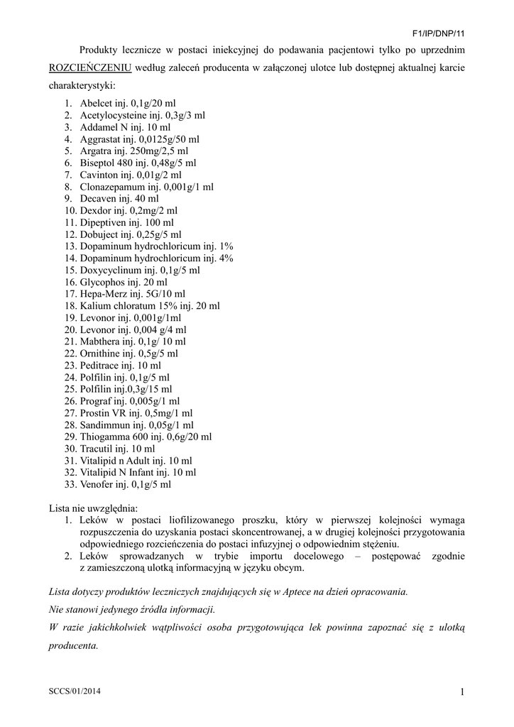 F1/IP/DNP/11 Produkty lecznicze w postaci iniekcyjnej do podawania pacjentowi tylko po uprzednim ROZCIEŃCZENIU według zaleceń producenta w załączonej ulotce lub dostępnej aktualnej karcie charakterystyki: 1. Abelcet inj. 0,1g/20 ml 2. Acetylocysteine inj. 0,3g/3 ml 3. Addamel N inj. 10 ml 4. Aggrastat inj. 0,0125g/50 ml 5. Argatra inj. 250mg/2,5 ml 6. Biseptol 480 inj. 0,48g/5 ml 7. Cavinton inj. 0,01g/2 ml 8. Clonazepamum inj. 0,001g/1 ml 9. Decaven inj. 40 ml 10. Dexdor inj. 0,2mg/2 ml 11. Dipeptiven inj. 100 ml 12. Dobuject inj. 0,25g/5 ml 13. Dopaminum hydrochloricum inj. 1% 14. Dopaminum hydrochloricum inj. 4% 15. Doxycyclinum inj. 0,1g/5 ml 16. Glycophos inj. 20 ml 17. Hepa-Merz inj. 5G/10 ml 18. Kalium chloratum 15% inj. 20 ml 19. Levonor inj. 0,001g/1ml 20. Levonor inj. 0,004 g/4 ml 21. Mabthera inj. 0,1g/ 10 ml 22. Ornithine inj. 0,5g/5 ml 23. Peditrace inj. 10 ml 24. Polfilin inj. 0,1g/5 ml 25. Polfilin inj.0,3g/15 ml 26. Prograf inj. 0,005g/1 ml 27. Prostin VR inj. 0,5mg/1 ml 28. Sandimmun inj. 0,05g/1 ml 29. Thiogamma 600 inj. 0,6g/20 ml 30. Tracutil inj. 10 ml 31. Vitalipid n Adult inj. 10 ml 32. Vitalipid N Infant inj. 10 ml 33. Venofer inj. 0,1g/5 ml Lista nie uwzględnia: 1. Leków w postaci liofilizowanego proszku, który w pierwszej kolejności wymaga rozpuszczenia do uzyskania postaci skoncentrowanej, a w drugiej kolejności przygotowania odpowiedniego rozcieńczenia do postaci infuzyjnej o odpowiednim stężeniu. 2. Leków sprowadzanych w trybie importu docelowego – postępować zgodnie z zamieszczoną ulotką informacyjną w języku obcym. Lista dotyczy produktów leczniczych znajdujących się w Aptece na dzień opracowania. Nie stanowi jedynego źródła informacji. W razie jakichkolwiek wątpliwości osoba przygotowująca lek powinna zapoznać się z ulotką producenta. SCCS/01/2014 1
