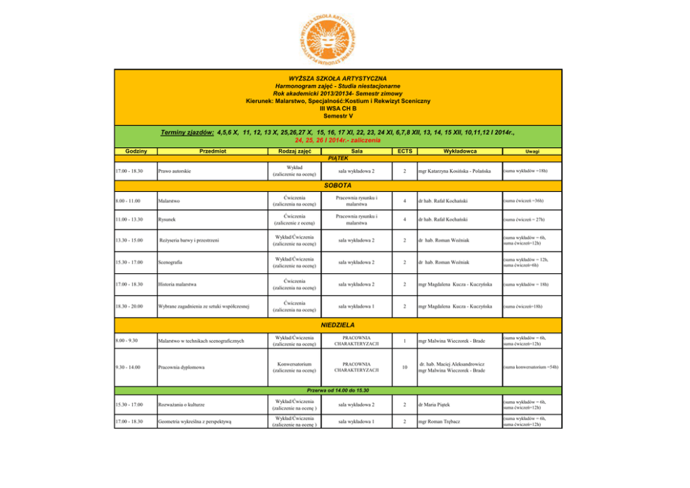 WYŻSZA SZKOŁA ARTYSTYCZNA Harmonogram zajęć - Studia niestacjonarne Rok akademicki 2013/20134- Semestr zimowy Kierunek: Malarstwo, Specjalność:Kostium i Rekwizyt Sceniczny III WSA CH B Semestr V Terminy zjazdów: 4,5,6 X, 11, 12, 13 X, 25,26,27 X, 15, 16, 17 XI, 22, 23, 24 XI, 6,7,8 XII, 13, 14, 15 XII, 10,11,12 I 2014r., 24, 25, 26 I 2014r.- zaliczenia Godziny Przedmiot Rodzaj zajęć Wykładowca Sala ECTS sala wykładowa 2 2 mgr Katarzyna Kosińska - Polańska (suma wykładów =18h) Uwagi PIĄTEK Prawo autorskie Wykład (zaliczenie na ocenę) 8.00 - 11.00 Malarstwo Ćwiczenia (zaliczenia na ocenę) Pracownia rysunku i malarstwa 4 dr hab. Rafał Kochański (suma ćwiczeń =36h) 11.00 - 13.30 Rysunek Ćwiczenia (zaliczenie z oceną) Pracownia rysunku i malarstwa 4 dr hab. Rafał Kochański (suma ćwiczeń = 27h) 13.30 - 15.00 Reżyseria barwy i przestrzeni Wykład/Ćwiczenia (zaliczenie na ocenę) sala wykładowa 2 2 dr hab. Roman Woźniak (suma wykładów = 6h, suma ćwiczeń=12h) 15.30 - 17.00 Scenografia Wykład/Ćwiczenia (zaliczenie na ocenę) sala wykładowa 2 2 dr hab. Roman Woźniak (suma wykładów = 12h, suma ćwiczeń=6h) 17.00 - 18.30 Historia malarstwa Ćwiczenia (zaliczenia na ocenę) sala wykładowa 2 2 mgr Magdalena Kucza - Kuczyńska (suma wykładów = 18h) 18.30 - 20.00 Wybrane zagadnienia ze sztuki współczesnej Ćwiczenia (zaliczenia na ocenę) sala wykładowa 1 2 mgr Magdalena Kucza - Kuczyńska (suma ćwiczeń=18h) 17.00 - 18.30 SOBOTA NIEDZIELA 8.00 - 9.30 Malarstwo w technikach scenograficznych Wykład/Ćwiczenia (zaliczenie na ocenę) PRACOWNIA CHARAKTERYZACJI 1 mgr Malwina Wieczorek - Brade (suma wykładów = 6h, suma ćwiczeń=12h) 9.30 - 14.00 Pracownia dyplomowa Konwersatorium (zaliczenie na ocenę) PRACOWNIA CHARAKTERYZACJI 10 dr. hab. Maciej Aleksandrowicz mgr Malwina Wieczorek - Brade (suma konwersatorium =54h) Przerwa od 14.00 do 15.30 15.30 - 17.00 Rozważania o kulturze Wykład/Ćwiczenia (zaliczenie na ocenę ) sala wykładowa 2 2 dr Maria Piątek (suma wykładów = 6h, suma ćwiczeń=12h) 17.00 - 18.30 Geometria wykreślna z perspektywą Wykład/Ćwiczenia (zaliczenie na ocenę ) sala wykładowa 1 2 mgr Roman Trębacz (suma wykładów = 6h, suma ćwiczeń=12h)