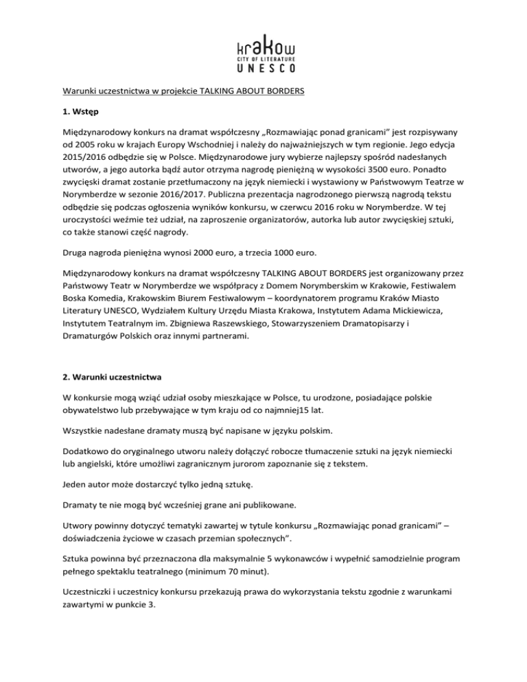 Warunki uczestnictwa w projekcie TALKING ABOUT BORDERS 1. Wstęp Międzynarodowy konkurs na dramat współczesny „Rozmawiając ponad granicami” jest rozpisywany od 2005 roku w krajach Europy Wschodniej i należy do najważniejszych w tym regionie. Jego edycja 2015/2016 odbędzie się w Polsce. Międzynarodowe jury wybierze najlepszy spośród nadesłanych utworów, a jego autorka bądź autor otrzyma nagrodę pieniężną w wysokości 3500 euro. Ponadto zwycięski dramat zostanie przetłumaczony na język niemiecki i wystawiony w Państwowym Teatrze w Norymberdze w sezonie 2016/2017. Publiczna prezentacja nagrodzonego pierwszą nagrodą tekstu odbędzie się podczas ogłoszenia wyników konkursu, w czerwcu 2016 roku w Norymberdze. W tej uroczystości weźmie też udział, na zaproszenie organizatorów, autorka lub autor zwycięskiej sztuki, co także stanowi część nagrody. Druga nagroda pieniężna wynosi 2000 euro, a trzecia 1000 euro. Międzynarodowy konkurs na dramat współczesny TALKING ABOUT BORDERS jest organizowany przez Państwowy Teatr w Norymberdze we współpracy z Domem Norymberskim w Krakowie, Festiwalem Boska Komedia, Krakowskim Biurem Festiwalowym – koordynatorem programu Kraków Miasto Literatury UNESCO, Wydziałem Kultury Urzędu Miasta Krakowa, Instytutem Adama Mickiewicza, Instytutem Teatralnym im. Zbigniewa Raszewskiego, Stowarzyszeniem Dramatopisarzy i Dramaturgów Polskich oraz innymi partnerami. 2. Warunki uczestnictwa W konkursie mogą wziąć udział osoby mieszkające w Polsce, tu urodzone, posiadające polskie obywatelstwo lub przebywające w tym kraju od co najmniej15 lat. Wszystkie nadesłane dramaty muszą być napisane w języku polskim. Dodatkowo do oryginalnego utworu należy dołączyć robocze tłumaczenie sztuki na język niemiecki lub angielski, które umożliwi zagranicznym jurorom zapoznanie się z tekstem. Jeden autor może dostarczyć tylko jedną sztukę. Dramaty te nie mogą być wcześniej grane ani publikowane. Utwory powinny dotyczyć tematyki zawartej w tytule konkursu „Rozmawiając ponad granicami” – doświadczenia życiowe w czasach przemian społecznych”. Sztuka powinna być przeznaczona dla maksymalnie 5 wykonawców i wypełnić samodzielnie program pełnego spektaklu teatralnego (minimum 70 minut). Uczestniczki i uczestnicy konkursu przekazują prawa do wykorzystania tekstu zgodnie z warunkami zawartymi w punkcie 3. 3. Prawa autorskie Wszyscy uczestnicy konkursu przenoszą następujące prawa do wykorzystania utworu na organizatorów: Niewyłączne i czasowo nieograniczone prawo do tłumaczenia i opublikowania tekstu dramatu bez wynagrodzenia np. w ramach antologii. W przypadku, gdyby jakaś sztuka stała się bestsellerem, jego autorka lub autor otrzyma odpowiednią część wpływów kasowych. Uczestnicy konkursu zgadzają się ponadto, że wyróżniony pierwszą nagrodą dramat obowiązują następujące uregulowania: Autorka lub autor przenosi na organizatorów wyłączne prawo do tłumaczenia i publikacji nagrodzonego tekstu na okres jednego roku od daty odebrania nagrody. Organizatorzy otrzymują wyłączne prawo do wystawienia sztuki na okres dwóch lat i maksymalnie 14 publicznych przedstawień. Zwycięzca konkursu oświadcza, że za przeniesienie w/w praw nie będzie rościł prawa do dodatkowego wynagrodzenia. 4. Doręczenie utworów Termin nadsyłania prac mija w niedziele 15 maja 2016 roku Uczestnicy muszą dostarczyć następujące dokumenty: 1. Tekst dramatu w języku oryginalnym 2. Tekst dramatu w wersji angielskiej lub niemieckiej 3. Informację o autorce lub autorze w języku angielskim lub niemieckim oraz krótkie streszczenie sztuki 4. Oświadczenie o akceptacji warunków konkursu Sztuki należy przesłać w kopertach z dopiskiem „Drama Contest” na adres Christian Papke, Staatstheater Nürnberg , Richard-Wagner-Platz 2, 90443 Nürnberg, Niemcy. Dramat jak i wszystkie dodatkowe materiały mogą także, co jest mile widziane, zostać wysłane za pomocą poczty elektronicznej na adres: [email protected]. Jako temat wiadomości należy podać „Drama Contest”. Wszystkie informacje o Państwowym Teatrze w Norymberdze oraz o konkursie w języku niemieckim znajdują się na stronie https://www.staatstheater-nuernberg.de w zakładce Wettbewerbe. Teatr nie ponosi odpowiedzialności za zagubioną pocztę, a nadesłane teksty nie będą zwracane. 5. Nagrody i droga prawna Nadesłane sztuki będą przedkładane do oceny jurorom anonimowo. Międzynarodowe jury składa się z 5 kompetentnych osób, z czego dwie pochodzą z Polski. Wyniki konkursu zostaną podane do publicznej wiadomości w połowie czerwca 2016 podczas konferencji prasowej. Jury przedłoży swój wybór wraz z uzasadnieniem na piśmie, a jego rozstrzygnięcie nie będzie komentowane publicznie. Dochodzenie racji na drodze prawnej jest wykluczone. W przypadku jakichkolwiek roszczeń dotyczących wykorzystania tekstu, jego tłumaczenia, publikacji lub wystawienia obowiązuje prawo niemieckie, a miejscem ich rozpatrzenia jest sąd w Norymberdze.