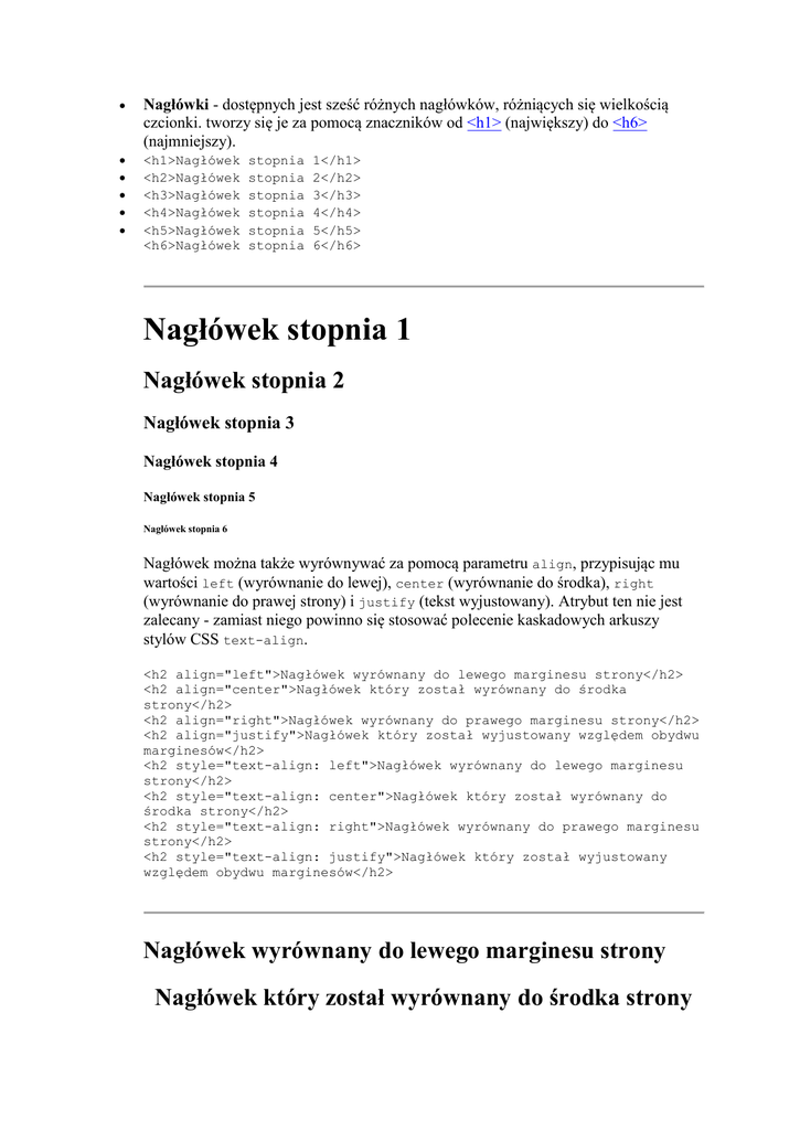 Nagłówki - dostępnych jest sześć różnych nagłówków, różniących się wielkością czcionki. tworzy się je za pomocą znaczników od <h1> (największy) do <h6> (najmniejszy). <h1>Nagłówek <h2>Nagłówek <h3>Nagłówek <h4>Nagłówek <h5>Nagłówek <h6>Nagłówek stopnia stopnia stopnia stopnia stopnia stopnia 1</h1> 2</h2> 3</h3> 4</h4> 5</h5> 6</h6> Nagłówek stopnia 1 Nagłówek stopnia 2 Nagłówek stopnia 3 Nagłówek stopnia 4 Nagłówek stopnia 5 Nagłówek stopnia 6 Nagłówek można także wyrównywać za pomocą parametru align, przypisując mu wartości left (wyrównanie do lewej), center (wyrównanie do środka), right (wyrównanie do prawej strony) i justify (tekst wyjustowany). Atrybut ten nie jest zalecany - zamiast niego powinno się stosować polecenie kaskadowych arkuszy stylów CSS text-align. <h2 align="left">Nagłówek wyrównany do lewego marginesu strony</h2> <h2 align="center">Nagłówek który został wyrównany do środka strony</h2> <h2 align="right">Nagłówek wyrównany do prawego marginesu strony</h2> <h2 align="justify">Nagłówek który został wyjustowany względem obydwu marginesów</h2> <h2 style="text-align: left">Nagłówek wyrównany do lewego marginesu strony</h2> <h2 style="text-align: center">Nagłówek który został wyrównany do środka strony</h2> <h2 style="text-align: right">Nagłówek wyrównany do prawego marginesu strony</h2> <h2 style="text-align: justify">Nagłówek który został wyjustowany względem obydwu marginesów</h2> Nagłówek wyrównany do lewego marginesu strony Nagłówek który został wyrównany do środka strony Nagłówek wyrównany do prawego marginesu strony Nagłówek który został obydwu marginesów wyjustowany względem Dla nagłówka (oraz także dla bardzo wielu innych znaczników) można także przypisać dodatkowy tekst, który zostanie przez przeglądarkę wyświetlony gdy kursor myszki na dłużej się nad nim zatrzyma (tzw. tooltip - tekst pomocniczy). Służy do tego parametr title <h3 title="To jest właśnie opis który może się pokazać jako dodatkowe wyjaśnienie">Zatrzymaj tu kursor myszki</h3> Zatrzymaj tu kursor myszki Paragrafy - definiuje się je za pomocą znacznika <p>. Znacznik ten posiada także parametry które zostały wymienione powyżej przy opisywaniu znaczników definiujących nagłówki, czyli align i title. Odnoszą się do nich także te same uwagi. <p>Paragraf pierwszy</p> <p title="Pomocniczy opis">Paragraf drugi, posiada opis pokazujący się gdy kursor myszki zatrzyma się nad nim</p> <p align="center">Paragraf trzeci, który jest wycentrowany</p> <p>Paragraf pierwszy</p> <p title="Pomocniczy opis">Paragraf drugi, posiada opis pokazujący się gdy kursor myszki zatrzyma się nad nim</p> <p style="text-align: center">Paragraf trzeci, który jest wycentrowany</p> Paragraf pierwszy Paragraf drugi, posiada opis pokazujący się gdy kursor myszki zatrzyma się nad nim Paragraf trzeci, który jest wycentrowany Wymuszenie przełamania wiersza (przejście do nowej linii) - służy do tego znacznik <br>. Jak to widać z powyższego przykładu, pomiędzy paragrafami wstawiana jest dodatkowa pusta linia rozdzielająca. Aby jej uniknąć, należy zastosować ten znacznik. Pamiętaj jednak że stosowanie tego znacznika do podziału tekstu na wiersze nie jest jego prawidłowym zastosowaniem - w tym celu należy stosować pokazany wcześniej znacznik <p> (no chyba że chcesz opublikować na swojej stronie internetowej wiersz - wtedy jego zastosowanie jest jak najbardziej uzasadnione). Znacznik ten jest też jednym ze znaczników które w HTML nie mają znacznika zamykającego, dlatego pisząc swoją stronę w XHTML musisz pamiętać o jego zamknięciu (pierwszy przykład w HTML, drugi w XHTML): <p>Paragraf, który tutaj<br>został przełamany po raz pierwszy, a tutaj<br>po raz kolejny</p> <p>Paragraf, który tutaj<br />został przełamany po raz pierwszy, a tutaj<br />po raz kolejny</p> Paragraf, który tutaj został przełamany po raz pierwszy, a tutaj po raz kolejny Centrowanie - można wykonać za pomocą znacznika <center>. Znacznik ten nie jest zalecany - zamiast niego powinno się stosować wymienione już wcześniej polecenie kaskadowych arkuszy stylów CSS text-align. <center>Ten tekst jest wycentrowany</center> Tekst preformatowany - uzyskuje się go za pomocą znacznika <pre>. W obrębie takiego bloku tekst pisany jest czcionką o stałej szerokości znaku, uwzględniane są także przy wyświetlaniu wszelkie spacje, tabulatory i znaki nowej linii. <pre>Tu wstawię cztery spacje, i Enter na końcu Tu jest tabulator A tu dwa tabulatory Poniżej jest prosta tabelka 1 2 3 11 22 33 1 23 4</pre> Tu wstawię cztery spacje, i Enter na końcu Tu jest tabulator A tu dwa tabulatory Poniżej jest prosta tabelka 1 2 3 11 22 33 1 23 4 Cytat - do stworzenia większego bloku zawierającego cytat, służy znacznik <blockquote>. Tak stworzony cytat jest odsunięty nieco od lewego brzegu dokumentu. Do rozdzielania kolejnych linii (np. w wierszu) należy stosować znacznik <br>. <blockquote><div>To jest fragment jakiegoś tekstu który jest tak długi że się nie zmieści w jednej linii i będzie musiał być kontynuowany w kolejnej, a tu<br>wstawiony zostanie znacznik przejścia do nowej linii</div></blockquote> To jest fragment jakiegoś tekstu który jest tak długi że się nie zmieści w jednej linii i będzie musiał być kontynuowany w kolejnej, a tu wstawiony zostanie znacznik przejścia do nowej linii Uwaga: Używanie tego znacznika wyłącznie do tworzenia wcięć nie jest zalecane. Zamiast niego wskazane jest ustawienie lewego marginesu za pomocą odpowiedniego polecenia kaskadowych arkuszy stylów CSS: <div style="margin-left: 30px">To jest fragment jakiegoś tekstu który jest tak długi że się nie zmieści w jednej linii i będzie musiał być kontynuowany w kolejnej, a tu<br>wstawiony zostanie znacznik przejścia do nowej linii</div> To jest fragment jakiegoś tekstu kt