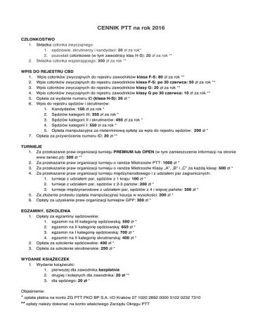 CENNIK PTT na rok 2016 CZŁONKOSTWO 1. Składka członka zwyczajnego: 1. sędziowie, skrutinerzy i kandydaci: 20 zł za rok* 2. pozostali członkowie (w tym zawodnicy klas H-S): 20 zł za rok ** 2. Składka członka wspierającego: 300 zł za rok ** WPIS DO REJESTRU CBD 1. Wpis członków zwyczajnych do rejestru zawodników klasa F-S: 80 zł za rok ** 2. Wpis członków zwyczajnych do rejestru zawodników klasa F-S: po 30 czerwca: 50 zł za rok ** 3. Wpis członków zwyczajnych do rejestru zawodników klasy G: 20 zł za rok ** 4. Wpis członków zwyczajnych do rejestru zawodników klasy G po 30 czerwca: 10 zł za rok ** 5. Opłata za wydanie numeru ID (klasa H-S): 20 zł * 6. Wpis do rejestru sędziów i skrutinerów: 1. Kandydatów: 150 zł za rok * 2. Sędziów kategorii III: 350 zł za rok * 3. Sędziów kategorii II i skrutinerów: 450 zł za rok * 4. Sędziów kategorii I: 550 zł za rok * 5. Opłata manipulacyjna za nieterminową opłatę za wpis do rejestru sędziów: 200 zł * 7. Opłata za przywrócenie numeru ID: 20 zł ** TURNIEJE 1. Za przekazanie praw organizacji turnieju PREMIUM lub OPEN (w tym zamieszczenie informacji na stronie www.taniec.pl): 300 zł ** 2. Za przekazanie praw organizacji turnieju o randze Mistrzostw PTT: 1000 zł * 3. Za przekazanie praw organizacji turnieju o randze Mistrzostw Klasy „A”, „B” i „C” za każdą klasę: 500 zł * 4. Za przekazanie praw organizacji turnieju międzynarodowego i z udziałem par zagranicznych: 1. turnieje z udziałem par, sędziów z 1 kraju: 100 zł * 2. turnieje z udziałem par, sędziów z 2-3 państw: 200 zł * 3. turnieje międzynarodowe z udziałem par, sędziów z 4 i więcej państw: 300 zł * 5. Za złożenie protestu (opłata manipulacyjna) kaucja w wysokości: 200 zł * 6. Opłaty za uzyskanie praw organizacji turniejów GPP: 300 zł * EGZAMINY, SZKOLENIA 1. Opłaty za egzaminy sędziowskie: 1. egzamin na III kategorię sędziowską: 500 zł * 2. egzamin na II kategorię sędziowską: 650 zł * 3. egzamin na I kategorię sędziowską: 700 zł * 4. egzamin na II kategorię skrutinerską: 400 zł * 2. Opłata za szkolenie sędziowskie: 400 zł * 3. Opłata za szkolenie skrutinerskie: 250 zł * WYDANIE KSIĄŻECZEK 1. Wydanie książeczki: 1. pierwszej dla zawodnika bezpłatnie 2. drugiej i kolejnych dla zawodnika: 20 zł ** 3. dla sędziego: 20 zł * Objaśnienie: * opłata płatna na konto ZG PTT PKO BP S.A. I/O Kraków 07 1020 2892 0000 5102 0232 7310 ** opłaty należy dokonać na konto właściwego Zarządu Okręgu PTT