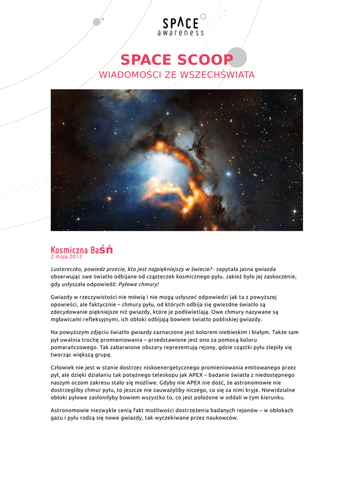 SPACE SCOOP WIADOMOŚCI ZE WSZECHŚWIATA Kosmiczna Baśń 2 maja 2012 Lustereczko, powiedz przecie, kto jest najpiękniejszy w świecie? - zapytała jasna gwiazda obserwując swe światło odbijane od cząsteczek kosmicznego pyłu. Jakież było jej zaskoczenie, gdy usłyszała odpowiedź: Pyłowe chmury! Gwiazdy w rzeczywistości nie mówią i nie mogą usłyszeć odpowiedzi jak ta z powyższej opowieści, ale faktycznie – chmury pyłu, od których odbija się gwiezdne światło są zdecydowanie piękniejsze niż gwiazdy, które je podświetlają. Owe chmury nazywane są mgławicami refleksyjnymi, ich obłoki odbijają bowiem światło pobliskiej gwiazdy. Na powyższym zdjęciu światło gwiazdy zaznaczone jest kolorem niebieskim i białym. Także sam pył uwalnia trochę promieniowania – przedstawione jest ono za pomocą koloru pomarańczowego. Tak zabarwione obszary reprezentują rejony, gdzie cząstki pyłu zlepiły się tworząc większą grupę. Człowiek nie jest w stanie dostrzec niskoenergetycznego promieniowania emitowanego przez pył, ale dzięki działaniu tak potężnego teleskopu jak APEX – badanie światła z niedostępnego naszym oczom zakresu stało się możliwe. Gdyby nie APEX nie dość, że astronomowie nie dostrzegliby chmur pyłu, to jeszcze nie zauważyliby niczego, co się za nimi kryje. Niewidzialne obłoki pyłowe zasłoniłyby bowiem wszystko to, co jest położone w oddali w tym kierunku. Astronomowie niezwykle cenią fakt możliwości dostrzeżenia badanych rejonów – w obłokach gazu i pyłu rodzą się nowe gwiazdy, tak wyczekiwane przez naukowców. COOL FACT! Teleskop APEX znajduje się na chilijskiej pustyni położonej na wysokości 5100 m n.p.m! www.space-awareness.org/scoops