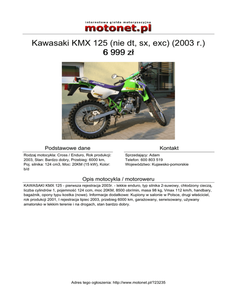 Kawasaki KMX 125 (nie dt, sx, exc) (2003 r.) 6 999 zł Podstawowe dane Rodzaj motocykla: Cross / Enduro, Rok produkcji: 2003, Stan: Bardzo dobry, Przebieg: 6000 km, Poj. silnika: 124 cm3, Moc: 20KM (15 kW), Kolor: b/d Kontakt Sprzedający: Adam Telefon: 600 803 519 Województwo: Kujawsko-pomorskie Opis motocykla / motoroweru KAWASAKI KMX 125 - pierwsza rejestracja 2003r. - lekkie enduro, typ silnika 2-suwowy, chłodzony cieczą, liczba cylindrów 1, pojemność 124 ccm, moc 20KM, 8500 obr/min, masa 98 kg, Vmax 112 km/h, handbary, bagażnik, opony typu kostka (nowe). Informacje dodatkowe: Kupiony w salonie w Polsce, drugi właściciel, rok produkcji 2001, I rejestracja lipiec 2003, przebieg 6000 km, garażowany, serwisowany, używany amatorsko w lekkim terenie i na drogach, stan bardzo dobry. Adres tego ogłoszenia: http://www.motonet.pl/?23235