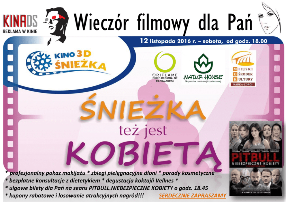 Wieczór filmowy dla Pań 12 listopada 2016 r. – sobota, * profesjonalny pokaz makijażu * zbiegi pielęgnacyjne dłoni * porady kosmetyczne * bezpłatne konsultacje z dietetykiem * degustacja koktajli Vellnes * * ulgowe bilety dla Pań na seans PITBULL.NIEBEZPIECZNE KOBIETY o godz. 18.45 * kupony rabatowe i losowanie atrakcyjnych nagród!!! SERDECZNIE ZAPRASZAMY od godz. 18.00