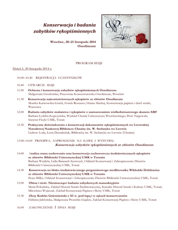 Konserwacja i badania zabytków rękopiśmiennych Wrocław, 20–21 listopada 2014 Ossolineum PROGRAM SESJI Dzień I, 20 listopada 2014 r. 10.00–10.40 REJESTRACJA UCZESTNIKÓW 10.40 OTWARCIE SESJI 11.00 Ochrona i konserwacja zabytków rękopiśmiennych Ossolineum Małgorzata Grocholska, Pracownia Konserwatorska Ossolineum, Wrocław 11.30 Konserwacja najwartościowszych rękopisów ze zbiorów Ossolineum Monika Karwowska-Gorek, Gorek Restauro; Hanna Machaj, Konserwacja papieru i dzieł sztuki, Warszawa 12.00 Badania zabytków malarstwa i rękopisów z zastosowaniem wielkoformatowego skanera XRF Barbara Łydżba-Kopczyńska, Wydział Chemii Uniwersytetu Wrocławskiego; Piotr Targowski, Instytut Fizyki UMK, Toruń 12.30 Praktyczne doświadczenia z konserwacji dokumentów rękopiśmiennych we Lwowskiej Narodowej Naukowej Bibliotece Ukrainy im. W. Stefanyka we Lwowie Liubow Loda, Łesia Dzendzeluk, Biblioteka im. W. Stefanyka we Lwowie (Ukraina) 13.00–14.00 PRZERWA, ZAPROSZENIE NA KAWĘ I WYSTAWĘ: Konserwacja zabytków rękopiśmiennych ze zbiorów Ossolineum 14.00 Analiza stanu zachowania oraz konserwacja zachowawcza średniowiecznych rękopisów ze zbiorów Biblioteki Uniwersyteckiej UMK w Toruniu Barbara Wojdyła, Lidia Bannach-Szewczyk, Oddział Konserwacji i Zabezpieczenia Zbiorów Biblioteki Uniwersyteckiej UMK, Toruń 14.30 Konserwacja na bloku średniowiecznego pergaminowego modlitewnika Wikbolda Dobilsteina ze zbiorów Biblioteki Uniwersyteckiej UMK w Toruniu Ilona Miller, Oddział Konserwacji i Zabezpieczenia Zbiorów Biblioteki Uniwersyteckiej UMK, Toruń 15.00 Obraz i treść. Nieniszczące badania zabytkowych manuskryptów Maria Poksińska, Zakład Historii Sztuki Średniowiecznej, Katedra Historii Sztuki i Kultury UMK, Toruń; Mirosława Wojtczak, Zakład Konserwacji Papieru i Skóry UMK, Toruń 15.30 Złoty Kodeks Gnieźnieński z XI w. pod lupą i w rękach konserwatorów Elżbieta Jabłońska, Małgorzata Pronobis-Gajdzis, Zakład Konserwacji Papieru i Skóry UMK, Toruń 16.00 ZAKOŃCZENIE I DNIA SESJI Dzień II, 21 listopada 2014 r. 9.00 Jak można badać wżery atramentowe i co z tych badań potem wynika? Barbara Wagner, Urszula Tomczuk, Wydział Chemii Uniwersytetu Warszawskiego; Anna Czajka, Centralne Laboratorium Konserwacji Archiwaliów, Archiwum Główne Akt Dawnych, Warszawa 9.30 Między statystyką a rzeczywistością – zagrożenie kolekcji archiwalnych przez korozję atramentów Anna Czajka, Iwona Kotala-Skiba, Centralne Laboratorium Konserwacji Archiwaliów, Archiwum Główne Akt Dawnych, Warszawa 10.00 Badania nad odkwaszaniem rękopisów Władysław Sobucki, Wydział Konserwacji i Restauracji Dzieł Sztuki ASP w Warszawie 10.30–11.00 PRZERWA 11.00 Analiza skutków ubocznych plazmowej dezynfekcji archiwaliów Tomasz Łojewski, Damian Chlebda, Wydział Chemii Uniwersytetu Jagiellońskiego, Kraków; Katarzyna Turnau, Instytut Nauk o Środowisku Uniwersytetu Jagiellońskiego, Kraków 11.30 Zastosowanie obrazowania hiperspektralnego do odczytu nieznanych fragmentów Archiwum Ringelbluma z kolekcji Żydowskiego Instytutu Historycznego w Warszawie Violetta Bachur, Żydowski Instytut Historyczny, Warszawa 12.00 Badania archeometryczne jako możliwość określania technik zdobienia skóry Beata Miazga, Instytut Archeologii Uniwersytetu Wrocławskiego 12.30–13.00 PRZERWA 13.00 Konserwacja Mappe-Monde Nouvelle Papistique 1566/1567 z kolekcji kartografików Biblioteki Uniwersyteckiej we Wrocławiu Katarzyna Łabuz, Biblioteka Uniwersytecka we Wrocławiu 13.30 Konserwacja projektów autorstwa Stanisława Witkiewicza i Jana Koszczyc Witkiewicza wykonanych na kalkach technicznych Justyna Karolewska, Biblioteka Śląska, Katowice 14.00 Świadectwa wielkie i małe. Rękopisy w zbiorach Biblioteki Elbląskiej – badania i konserwacja Dorota Jutrzenka-Supryn, Zakład Konserwacji Papieru i Skóry, Instytut Zabytkoznawstwa i Konserwatorstwa UMK, Toruń, Biblioteka Elbląska im. C. Norwida, Elbląg 14.30 ZAKOŃCZENIE SESJI TOWARZYSZĄCA SESJA POSTEROWA: Konserwacja rękopiśmiennego planu Wrocławia ze zbiorów Ossolineum Barbara Wojdyła, Lidia Bannach-Szewczyk, Oddział Konserwacji i Zabezpieczenia Zbiorów Biblioteki Uniwersyteckiej UMK, Toruń Henrich von Hesler, Apokalipse – konserwacja i restauracja średniowiecznego rękopisu ze zbiorów Biblioteki Uniwersyteckiej UMK w Toruniu Barbara Wojdyła, Lidia Bannach-Szewczyk, Oddział Konserwacji i Zabezpieczenia Zbiorów Biblioteki Uniwersyteckiej UMK, Toruń Praktyczne doświadczenia z konserwacji dokumentów rękopiśmiennych we Lwowskiej Narodowej Naukowej Bibliotece Ukrainy im. W. Stefanyka we Lwowie Liubow Loda, Łesia Dzendzeluk, Lwowska Narodowa Naukowa Biblioteka Ukrainy im. W. Stefanyka, Lwów (Ukraina) Na ratunek rękopisom. Zróżnicowanie form i konsekwencje w postępowaniu konserwatorskim Jolanta Czuczko, Zakład Konserwacji Papieru i Skóry UMK, Toruń Rękopis jako makulatura użyta w książce Monika Korsak-Truszczyńska, Katedra Konserwacji i Restauracji Starych Druków i Grafiki, Wydział Konserwacji i Restauracji Dzieł Sztuki ASP w Warszawie Destrukt a konserwacja zachowawcza Łucja Brzeżycka, Anna Fedrizzi-Szostok, Książnica Cieszyńska, Cieszyn Rękopis to nie tylko dokument Łucja Brzeżycka, Anna Fedrizzi-Szostok, Elżbieta Łęgowska, Książnica Cieszyńska, Cieszyn