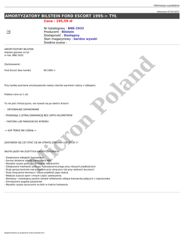 Informacje o produkcie Utworzono 07-03-2017 AMORTYZATORY BILSTEIN FORD ESCORT 1995-> TYŁ Cena : 195,59 zł Nr katalogowy : BNE-2933 Producent : Bilstein Dostępność : Dostępny Stan magazynowy : bardzo wysoki Średnia ocena : AMORTYZATORY BILSTEIN olejowo-gazowe na tył nr kat. BNE-2933 09.1995-> Przy każdej wymianie amortyzatorów należy również wymienić osłony z odbojami. To nie jest chińszczyzna, nie rozwali się po dwóch dniach! - ORYGINALNIE ZAPAKOWANE - POSIADAJĄ 2 LETNIĄ GWARANCJĘ BEZ LIMITU KILOMETRÓW Po Podana cena za 1 szt. la Ford Escort (bez kombi) nd Zastosowanie: ic ro n - FAKTURA LUB PARAGON DO WYBORU -= KUP TERAZ NIE CZEKAJ =- ZASTANÓW SIĘ CZY STAĆ CIĘ NA UTRATĘ ZDROWIA LUB ŻYCIA !!! SKUTKI JAZDY NA ZUŻYTYCH AMORTYZATORACH: M - Zwiększona odległość hamowania. - Gorsze działanie układu hamowania ABS. - Wysokie ryzyko poślizgu na mokrej nawierzchni. - Zwiększona możliwość poślizgu hydrodynamicznego przy niższych prędkościach. - Dużo gorsza kontrola nad pojazdem przy skręcaniu lub przy wiatrach bocznych. - Duże zmęczenie kierowcy i niższa prędkość jego reakcji. - Większe zużycie opon i innych części zawieszenia. - Nierówny i rozedrgany poziom świateł reflektorów oślepia kierowców jadących z naprzeciwka. - Zmniejszona wygoda pasażerów. - Wysokie ryzyko zarzucania na boki w trakcie holowania. Wygenerowano w programie www.oscGold.com