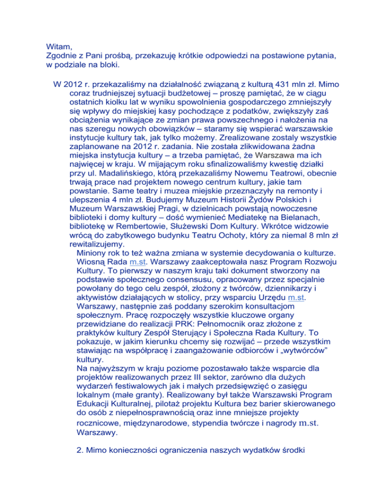 Witam, Zgodnie z Pani prośbą, przekazuję krótkie odpowiedzi na postawione pytania, w podziale na bloki. W 2012 r. przekazaliśmy na działalność związaną z kulturą 431 mln zł. Mimo coraz trudniejszej sytuacji budżetowej – proszę pamiętać, że w ciągu ostatnich kiolku lat w wyniku spowolnienia gospodarczego zmniejszyły się wpływy do miejskiej kasy pochodzące z podatków, zwiększyły zaś obciążenia wynikające ze zmian prawa powszechnego i nałożenia na nas szeregu nowych obowiązków – staramy się wspierać warszawskie instytucje kultury tak, jak tylko możemy. Zrealizowane zostaly wszystkie zaplanowane na 2012 r. zadania. Nie została zlikwidowana żadna miejska instytucja kultury – a trzeba pamiętać, że Warszawa ma ich najwięcej w kraju. W mijającym roku sfinalizowaliśmy kwestię działki przy ul. Madalińskiego, którą przekazaliśmy Nowemu Teatrowi, obecnie trwają prace nad projektem nowego centrum kultury, jakie tam powstanie. Same teatry i muzea miejskie przeznaczyły na remonty i ulepszenia 4 mln zł. Budujemy Muzeum Historii Żydów Polskich i Muzeum Warszawskiej Pragi, w dzielnicach powstają nowoczesne biblioteki i domy kultury – dość wymienieć Mediatekę na Bielanach, bibliotekę w Rembertowie, Służewski Dom Kultury. Wkrótce widzowie wrócą do zabytkowego budynku Teatru Ochoty, który za niemal 8 mln zł rewitalizujemy. Miniony rok to też ważna zmiana w systemie decydowania o kulturze. Wiosną Rada m.st. Warszawy zaakceptowała nasz Program Rozwoju Kultury. To pierwszy w naszym kraju taki dokument stworzony na podstawie społecznego consensusu, opracowany przez specjalnie powołany do tego celu zespół, złożony z twórców, dziennikarzy i aktywistów działających w stolicy, przy wsparciu Urzędu m.st. Warszawy, następnie zaś poddany szerokim konsultacjom społecznym. Pracę rozpoczęły wszystkie kluczowe organy przewidziane do realizacji PRK: Pełnomocnik oraz złożone z praktyków kultury Zespół Sterujący i Społeczna Rada Kultury. To pokazuje, w jakim kierunku chcemy się rozwijać – przede wszystkim stawiając na współpracę i zaangażowanie odbiorców i „wytwórców” kultury. Na najwyższym w kraju poziome pozostawało także wsparcie dla projektów realizowanych przez III sektor, zarówno dla dużych wydarzeń festiwalowych jak i małych przedsięwzięć o zasięgu lokalnym (małe granty). Realizowany był także Warszawski Program Edukacji Kulturalnej, pilotaż projektu Kultura bez barier skierowanego do osób z niepełnosprawnością oraz inne mniejsze projekty rocznicowe, międzynarodowe, stypendia twórcze i nagrody m.st. Warszawy. 2. Mimo konieczności ograniczenia naszych wydatków środki przeznaczone na kulturę pozostaną na wysokim poziomie – w 2013 r. będzie to niemal 390 mln zł. Mimo trudności zabezpieczyliśmy środki na funkcjonowanie miejskich instytucji kultury – dotacja dla stołecznych teatrów i muzeów będzie wyższa niż w roku ubiegłym. Najważniejszym zadaniem, jakie chcemy wykonać wspólnie z Zespołem Sterującym PRK i Społeczną Radą Kultury, jest opracowanie kompleksowej diagnozy – mapy stołecznej kultury. Przygotowanie mapy będzie wymagało kompleksowej kwerendy oraz dodatkowych badań i analiz obszarów wskazanych przez Zespół Sterujący. W budżecie Biura Kultury zostały zapisane środki na ten cel. Co roku miasto finansuje wiele inicjatyw realizowanych oddolnie, przez rozmaite organizacje pozarządowe – chcę dalej rozwijać tę formę ożywiania Warszawy i urozmaicania oferty kulturalnej stolicy. Bardzo ważne, byśmy nie tylko budowali muzea i teatry, ale też kształcili ich przyszłych widzów. Dlatego w 2013 r. już po raz czwarty zorganizujemy Warszawską Giełdę Programów Edukacji Kulturalnej, a kwota przeznaczona na realizację Warszawskiego Programu Edukacji Kulturalnej wzrośnie. Pozdrawiam, Monika Żukowska Wydział Prasowy Urząd m.st. Warszawy
