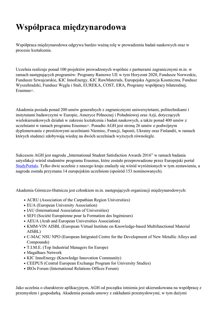 Współpraca międzynarodowa Współpraca międzynarodowa odgrywa bardzo ważną rolę w prowadzeniu badań naukowych oraz w procesie kształcenia. Uczelnia realizuje ponad 100 projektów prowadzonych wspólnie z partnerami zagranicznymi m.in. w ramach następujących programów: Programy Ramowe UE w tym Horyzont 2020, Fundusze Norweskie, Fundusze Szwajcarskie, KIC InnoEnergy, KIC RawMaterials, Europejska Agencja Kosmiczna, Fundusz Wyszehradzki, Fundusz Węgla i Stali, EUREKA, COST, ERA, Programy współpracy bilateralnej, Erasmus+. Akademia posiada ponad 200 umów generalnych z zagranicznymi uniwersytetami, politechnikami i instytutami badawczymi w Europie, Ameryce Północnej i Południowej oraz Azji, dotyczących wielokierunkowych działań w zakresie kształcenia i badań naukowych, a także ponad 400 umów z uczelniami w ramach programu Erasmus+. Ponadto AGH jest stroną 26 umów o podwójnym dyplomowaniu z prestiżowymi uczelniami Niemiec, Francji, Japonii, Ukrainy oraz Finlandii, w ramach których studenci zdobywają wiedzę na dwóch uczelniach wyższych równolegle. Sukcesem AGH jest nagroda „International Student Satisfaction Awards 2016” w ramach badania satysfakcji wśród studentów programu Erasmus, które zostało przeprowadzone przez Europejski portal StudyPortals. Tylko dwie uczelnie z naszego kraju znalazły się wśród wyróżnionych w tym zestawieniu, a nagroda została przyznana 14 europejskim uczelniom (spośród 153 nominowanych). Akademia Górniczo-Hutnicza jest członkiem m.in. następujących organizacji międzynarodowych: ACRU (Association of the Carpathian Region Universities) EUA (European University Association) IAU (International Association of Universities) SEFI (Société Européenne pour la Formation des Ingénieurs) AEUA (Arab and European Universities Association) KMM-VIN AISBL (European Virtual Institute on Knowledge-based Multifunctional Material AISBL) C-MAC NSU NPO (European Intigrated Centre for the Development of New Metallic Alloys and Compounds) T.I.M.E. (Top Industrial Managers for Europe) Magalhaes Network KIC InnoEnergy (Knowledge Innovation Community) CEEPUS (Central European Exchange Program for University Studies) IROs Forum (International Relations Offices Forum) Jako uczelnia o charakterze aplikacyjnym, AGH od początku istnienia jest ukierunkowana na współpracę z przemysłem i gospodarką. Akademia posiada umowy z zakładami przemysłowymi, w tym dużymi Jako uczelnia o charakterze aplikacyjnym, AGH od początku istnienia jest ukierunkowana na współpracę z przemysłem i gospodarką. Akademia posiada umowy z zakładami przemysłowymi, w tym dużymi międzynarodowymi korporacjami. Przedmiotem umów jest współpraca naukowa, badawcza i edukacyjna, a celem wszechstronne wykorzystanie wzajemnych możliwości partnerów. Dział Współpracy z Zagranicą