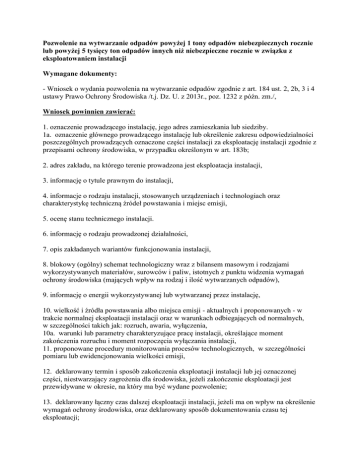 Pozwolenie na wytwarzanie odpadów powyżej 1 tony odpadów niebezpiecznych rocznie lub powyżej 5 tysięcy ton odpadów innych niż niebezpieczne rocznie w związku z eksploatowaniem instalacji Wymagane dokumenty: - Wniosek o wydania pozwolenia na wytwarzanie odpadów zgodnie z art. 184 ust. 2, 2b, 3 i 4 ustawy Prawo Ochrony Środowiska /t.j. Dz. U. z 2013r., poz. 1232 z późn. zm./, Wniosek powinnien zawierać: 1. oznaczenie prowadzącego instalację, jego adres zamieszkania lub siedziby. 1a. oznaczenie głównego prowadzącego instalację lub określenie zakresu odpowiedzialności poszczególnych prowadzących oznaczone części instalacji za eksploatację instalacji zgodnie z przepisami ochrony środowiska, w przypadku określonym w art. 183b; 2. adres zakładu, na którego terenie prowadzona jest eksploatacja instalacji, 3. informację o tytule prawnym do instalacji, 4. informacje o rodzaju instalacji, stosowanych urządzeniach i technologiach oraz charakterystykę techniczną źródeł powstawania i miejsc emisji, 5. ocenę stanu technicznego instalacji. 6. informację o rodzaju prowadzonej działalności, 7. opis zakładanych wariantów funkcjonowania instalacji, 8. blokowy (ogólny) schemat technologiczny wraz z bilansem masowym i rodzajami wykorzystywanych materiałów, surowców i paliw, istotnych z punktu widzenia wymagań ochrony środowiska (mających wpływ na rodzaj i ilość wytwarzanych odpadów), 9. informację o energii wykorzystywanej lub wytwarzanej przez instalację, 10. wielkość i źródła powstawania albo miejsca emisji - aktualnych i proponowanych - w trakcie normalnej eksploatacji instalacji oraz w warunkach odbiegających od normalnych, w szczególności takich jak: rozruch, awaria, wyłączenia, 10a. warunki lub parametry charakteryzujące pracę instalacji, określające moment zakończenia rozruchu i moment rozpoczęcia wyłączania instalacji, 11. proponowane procedury monitorowania procesów technologicznych, w szczególności pomiaru lub ewidencjonowania wielkości emisji, 12. deklarowany termin i sposób zakończenia eksploatacji instalacji lub jej oznaczonej części, niestwarzający zagrożenia dla środowiska, jeżeli zakończenie eksploatacji jest przewidywane w okresie, na który ma być wydane pozwolenie; 13. deklarowany łączny czas dalszej eksploatacji instalacji, jeżeli ma on wpływ na określenie wymagań ochrony środowiska, oraz deklarowany sposób dokumentowania czasu tej eksploatacji; 14. deklarowany termin oddania instalacji do eksploatacji w przypadku określonym w art. 191a; 15. czas, na jaki wydane ma być pozwolenie. Dodatkowo wniosek musi zawierać: 1. numer identyfikacji podatkowej (NIP) i numer REGON posiadacza odpadów, o ile został nadany. 2. wyszczególnienie rodzajów odpadów przewidzianych do wytwarzania, z uwzględnieniem ich podstawowego składu chemicznego i właściwości, 3. określenie ilości odpadów poszczególnych rodzajów przewidzianych do wytwarzania w ciągu roku, 4. wskazanie sposobów zapobiegania powstawaniu odpadów lub ograniczania ilości odpadów i ich negatywnego oddziaływania na środowisko, 5. opis dalszego sposobu gospodarowania odpadami, z uwzględnieniem zbierania, transportu, odzysku i unieszkodliwiania odpadów, 6. wskazanie miejsca i sposobu oraz rodzaju magazynowanych odpadów. Jeżeli wniosek o wydanie pozwolenia dotyczy instalacji nowo uruchamianej winien zawierać dodatkowo informację o spełnieniu następujących wymogów (art. 143 ww. ustawy): - Stosowanie substancji o małym potencjale zagrożeń. - Efektywne wytwarzanie oraz wykorzystanie energii. - Zapewnienie racjonalnego zużycia wody i innych surowców oraz materiałów i paliw. - Stosowanie technologii bezodpadowych i małoodpadowych oraz możliwości odzysku powstających odpadów. - Rodzaj, zasięg oraz wielkość emisji. - Wykorzystanie porównywalnych procesów i metod, które zostały skutecznie zastosowane w skali przemysłowej. - Wykorzystanie analizy cyklu życia produktów. - Postęp naukowo - techniczny. Do wniosku o wydanie pozwolenia należy dołączyć następujące dokumenty potwierdzone za zgodność z oryginałem: 1. dokument potwierdzający, że wnioskodawca jest uprawniony do występowania w obrocie prawnym jeżeli prowadzący instalację nie jest osobą fizyczną, 2. streszczenie wniosku sporządzone w języku niespecjalistycznym, 3. dokument potwierdzający prawo do terenu, na którym będą magazynowane odpady, 4. oświadczenie czy wnioskodawca jest mikro, małym, średnim czy dużym przedsiębiorcą w rozumieniu przepisów o swobodzie działalności gospodarczej, 5. kopię wniosku o wydanie decyzji o środowiskowych uwarunkowaniach, o której mowa w art. 71 ust. 1 ustawy z dnia 3 października 2008 r. o udostępnianiu informacji o środowisku i jego ochronie, udziale społeczeństwa w ochronie środowiska oraz o ocenach oddziaływania na środowisko, wraz z kopią załączników, o ile taka decyzja była wymagana, albo kopię takiej decyzji, jeżeli została wydana, w przypadku, o którym mowa w ust. 3, 6. potwierdzenie dokonania opłaty skarbowej. Opłaty skarbowe: Zgodnie z ustawą z dnia 16 listopada 2006 r. o opłacie skarbowej (tj. Dz. U. z 2015r. poz. 783 ze zm.) na podstawie cz. III, pkt 40 pobiera się opłatę skarbową za pozwolenie na wprowadzanie substancji i energii do środowiska wydawane na podstawie przepisów o ochronie środowiska i przepisów o odpadach: 1. W związku z działalnością gospodarczą prowadzoną przez podmioty prowadzące działalność wytwórczą w rolnictwie, mikroprzedsiębiorców oraz małych i średnich przedsiębiorców - 506,00 zł. 2. W związku z prowadzoną działalnością gospodarczą (przez pozostałych przedsiębiorców) - 2 011.00 zł 3. Pozostałe - 506.00 zł. Opłatę należy wpłacić na konto Urzędu Miasta w Lęborku: Bank Gospodarki Żywnościowej S.A. 82 2030 0045 1110 0000 0219 7910 Miejsce złożenia dokumentów: Wniosek wraz z załącznikami n