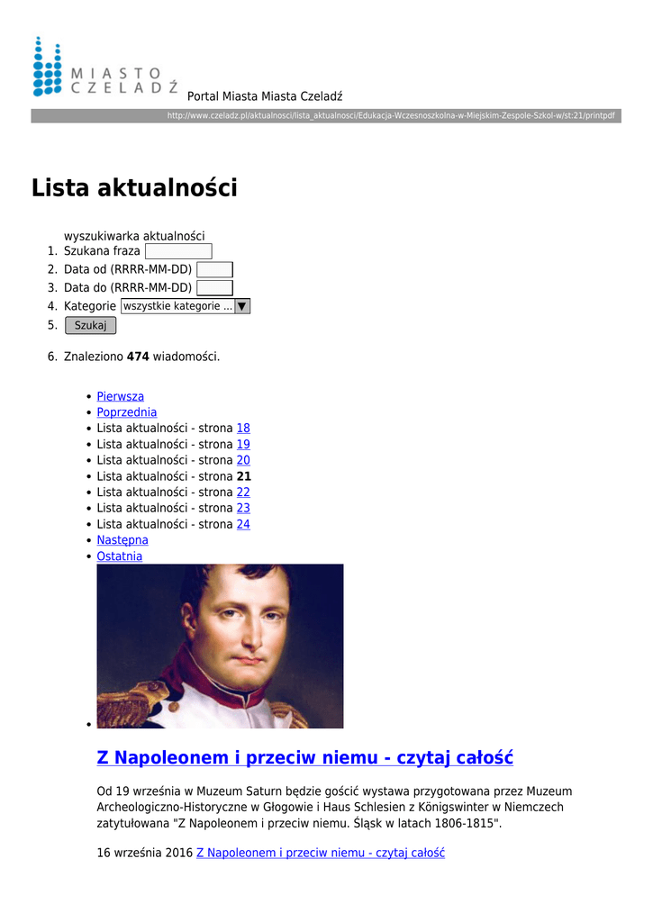 Portal Miasta Miasta Czeladź http://www.czeladz.pl/aktualnosci/lista_aktualnosci/Edukacja-Wczesnoszkolna-w-Miejskim-Zespole-Szkol-w/st:21/printpdf Lista aktualności wyszukiwarka aktualności 1. Szukana fraza 2. Data od (RRRR-MM-DD) 3. Data do (RRRR-MM-DD) 4. Kategorie wszystkie kategorie ... ▼ 5. Szukaj 6. Znaleziono 474 wiadomości. Pierwsza Poprzednia Lista aktualności - strona 18 Lista aktualności - strona 19 Lista aktualności - strona 20 Lista aktualności - strona 21 Lista aktualności - strona 22 Lista aktualności - strona 23 Lista aktualności - strona 24 Następna Ostatnia Z Napoleonem i przeciw niemu - czytaj całość Od 19 września w Muzeum Saturn będzie gościć wystawa przygotowana przez Muzeum Archeologiczno-Historyczne w Głogowie i Haus Schlesien z Königswinter w Niemczech zatytułowana "Z Napoleonem i przeciw niemu. Śląsk w latach 1806-1815". 16 września 2016 Z Napoleonem i przeciw niemu - czytaj całość Pokaz laserowy "Chrześcijańskie dzieje Polski" już w sobotę - czytaj całość W tym roku obchodzimy historyczny jubileusz 1050-lecia przyjęcia chrztu przez Mieszka I. Wydarzenie to jest jednym z najważniejszych w historii naszego kraju, od którego rozpoczął się proces chrystianizacji całej Polski. Z tej okazji pragniemy zaprosić na jedyny taki spektakl laserowy pt. „Chrześcijańskie dzieje Polski w laserach”. 16 września 2016 Pokaz laserowy "Chrześcijańskie dzieje Polski" już w sobotę - czytaj całość 13.09.2016 - czytaj całość Pies, mieszaniec, brązowo czarny, długi włos, siwa kufa, wiek 09/2006, znaleziony 13.09.2016 r. w Czeladzi, przy ulicy 21 Listopada 9. 14 września 2016 13.09.2016 - czytaj całość Urodziny Piasków za nami - czytaj całość Świetna muzyka, dobra zabawa i mnóstwo atrakcji - to wszystko działo się w Parku Prochownia podczas Urodzin Piasków. 12 września 2016 Urodziny Piasków za nami - czytaj całość Gdzie duch spotyka się z przestrzenią... - czytaj całość Muzeum Saturn serdecznie zachęca do uczestnictwa w lokalnej odsłonie Europejskich Dni Dziedzictwa 2016 - wydarzenia będącego doskonałą okazją do głębszego poznania naszej kultury i tradycji. 12 września 2016 Gdzie duch spotyka się z przestrzenią... - czytaj całość Urodziny Piasków - czytaj całość 10-ego września o godzinie 16.00 na Placu Viannay’a rozpoczną się Urodziny Piasków! 09 września 2016 Urodziny Piasków - czytaj całość Festyn Zdrowia - czytaj całość W środę 7 września na czeladzkim Rynku odbył się „Festyn Zdrowia”, tj. akcja bezpłatnych badań dla mieszkańców Czeladzi. 09 września 2016 Festyn Zdrowia - czytaj całość Kampania społeczna - A gdyby dzieci... - czytaj całość 1 września rozpoczęła się kampania medialna na terenie Miasta Czeladź. Odbywa się ona pod hasłem: „A gdyby dzieci mogły wybierać rodziców – czy ty byś nim został?”. 09 września 2016 Kampania społeczna - A gdyby dzieci... - czytaj całość "Czeladź za pół ceny" - czytaj całość Już w najbliższy piątek rusza druga edycja akcji "Czeladź za pół ceny" w ramach projektu "Zagłębie za pół ceny" 06 września 2016 "Czeladź za pół ceny" - czytaj całość Prosto z Iranu - czytaj całość MBP Filia nr 2 zaprasza we wrześniu do oglądania kolejnej ekspozycji fotografii podróżniczej. 06 września 2016 Prosto z Iranu - czytaj całość Pierwsza Poprzednia Lista aktualności - strona 18 Lista aktualności - strona 19 Lista aktualności - strona 20 Lista aktualności - strona 21 Lista aktualności - strona 22 Lista aktualności - strona 23 Lista aktualności - strona 24 Następna Ostatnia
