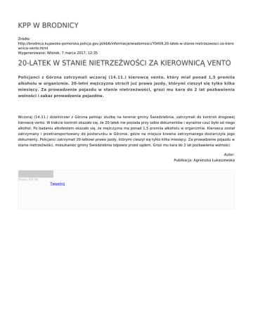 KPP W BRODNICY Źródło: http://brodnica.kujawsko-pomorska.policja.gov.pl/kb6/informacje/wiadomosci/70459,20-latek-w-stanie-nietrzezwosci-za-kiero wnica-vento.html Wygenerowano: Wtorek, 7 marca 2017, 12:35 20-LATEK W STANIE NIETRZEŹWOŚCI ZA KIEROWNICĄ VENTO Policjanci z Górzna zatrzymali wczoraj (14.11.) kierowcę vento, który miał ponad 1,5 promila alkoholu w organizmie. 20-letni mężczyzna stracił już prawo jazdy, którymi cieszył się tylko kilka miesięcy. Za prowadzenie pojazdu w stanie nietrzeźwości, grozi mu kara do 2 lat pozbawienia wolności i zakaz prowadzenia pojazdów. Wczoraj (14.11.) dzielnicowi z Górzna pełniąc służbę na terenie gminy Świedziebnia, zatrzymali do kontroli drogowej kierowcę vento. W trakcie kontroli okazało się, że 20-latek nie posiada przy sobie dokumentów i wyraźnie czuć było od niego alkohol. Po badaniu alkotestem okazało się, że mężczyzna ma ponad 1,5 promila alkoholu w organizmie. Kierowca został zatrzymany i przetransportowany do posterunku w Górznie, gdzie na miejsce krewna zatrzymanego dostarczyła jego dokumenty. Policjanci zatrzymali 20-latkowi prawo jazdy, którymi cieszył się tylko kilka miesięcy. Za prowadzenie pojazdu w stanie nietrzeźwości, mieszkaniec gminy Świedziebnia odpowie przed sądem. Grozi mu kara do 2 lat pozbawienia wolności. Autor: Publikacja: Agnieszka Łukaszewska Ocena: 0/5 (0) Tweetnij