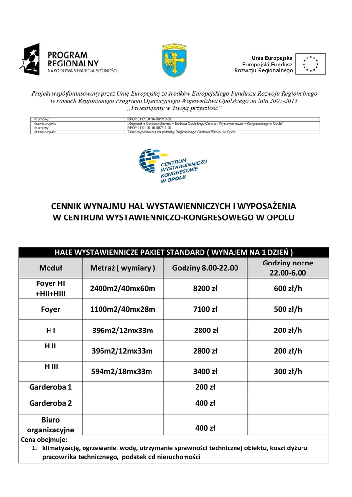 cennik wynajmu hal wystawienniczych i wyposażenia