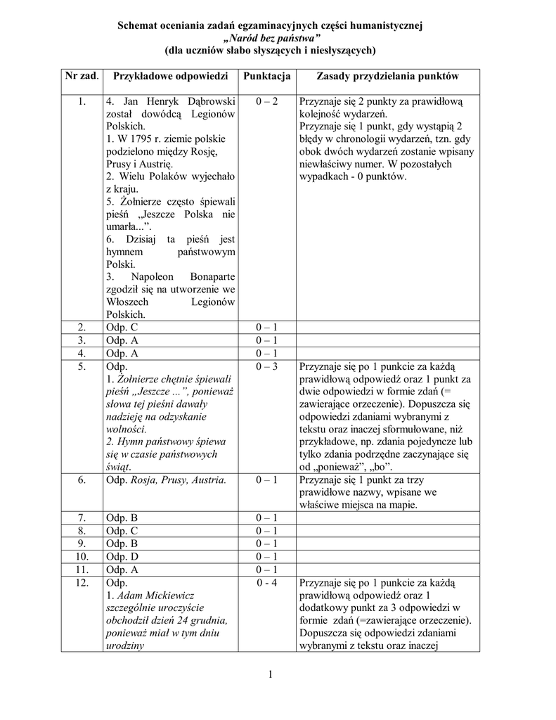 Schemat oceniania zadań egzaminacyjnych części humanistycznej „Naród bez państwa” (dla uczniów słabo słyszących i niesłyszących) Nr zad. Przykładowe odpowiedzi Punktacja Zasady przydzielania punktów 1. 4. Jan Henryk Dąbrowski został dowódcą Legionów Polskich. 1. W 1795 r. ziemie polskie podzielono między Rosję, Prusy i Austrię. 2. Wielu Polaków wyjechało z kraju. 5. Żołnierze często śpiewali pieśń „Jeszcze Polska nie umarła...”. 6. Dzisiaj ta pieśń jest hymnem państwowym Polski. 3. Napoleon Bonaparte zgodził się na utworzenie we Włoszech Legionów Polskich. Odp. C Odp. A Odp. A Odp. 1. Żołnierze chętnie śpiewali pieśń „Jeszcze ...”, ponieważ słowa tej pieśni dawały nadzieję na odzyskanie wolności. 2. Hymn państwowy śpiewa się w czasie państwowych świąt. Odp. Rosja, Prusy, Austria. 0–2 Przyznaje się 2 punkty za prawidłową kolejność wydarzeń. Przyznaje się 1 punkt, gdy wystąpią 2 błędy w chronologii wydarzeń, tzn. gdy obok dwóch wydarzeń zostanie wpisany niewłaściwy numer. W pozostałych wypadkach - 0 punktów. Odp. B Odp. C Odp. B Odp. D Odp. A Odp. 1. Adam Mickiewicz szczególnie uroczyście obchodził dzień 24 grudnia, ponieważ miał w tym dniu urodziny 0–1 0–1 0–1 0–1 0–1 0-4 2. 3. 4. 5. 6. 7. 8. 9. 10. 11. 12. 0–1 0–1 0–1 0–3 0–1 1 Przyznaje się po 1 punkcie za każdą prawidłową odpowiedź oraz 1 punkt za dwie odpowiedzi w formie zdań (= zawierające orzeczenie). Dopuszcza się odpowiedzi zdaniami wybranymi z tekstu oraz inaczej sformułowane, niż przykładowe, np. zdania pojedyncze lub tylko zdania podrzędne zaczynające się od „ponieważ”, „bo”. Przyznaje się 1 punkt za trzy prawidłowe nazwy, wpisane we właściwe miejsca na mapie. Przyznaje się po 1 punkcie za każdą prawidłową odpowiedź oraz 1 dodatkowy punkt za 3 odpowiedzi w formie zdań (=zawierające orzeczenie). Dopuszcza się odpowiedzi zdaniami wybranymi z tekstu oraz inaczej 13. 14. 15. 16. 17. 18. 19. 20. 21. 22. 23. 24. 25. 26. 27. Suma i imieniny. 2. Spędzał wigilię w więzieniu w 1823 roku. 3. Adam Mickiewicz napisał „Pana Tadeusza”, ponieważ tęsknił za ojczyzną. odp. A odp. D odp. Było to powstanie listopadowe . W 1863 r. zaczęło się powstanie styczniowe. Nie udało się odzyskać wolności (lub niepodległości). odp. Joachim Lelewel - historyk Adam Mickiewicz - poeta Fryderyk Chopin kompozytor Juliusz Słowacki - poeta odp. B odp. D odp. D odp. A odp. Sytuacja polskich uczniów była trudna. - TAK Za mówienie na lekcjach po polsku były nagrody. - NIE W domach Polacy potajemnie czytali polskie książki. -TAK W polskich domach śpiewano niemieckie pieśni. - NIE Uczniowie z Wrześni byli dobrymi Polakami. - TAK odp. C odp. C odp. D odp. B odp. A sformułowane, niż przykładowe, np. zdania pojedyncze lub tylko zdania podrzędne zaczynające się od „ponieważ”, „bo”. 0–1 0–1 0–2 0–2 0–1 0–1 0–1 0–1 0–5 0–1 0–1 0–1 0–1 0–1 0 - 12 50 2 Przyznaje się 2 punkty za trzy prawidłowe uzupełnienia zdań. 1 punkt za dwa prawidłowe uzupełnienia. Przyznaje się 2 punkty za cztery prawidłowe połączenia. Przyznaje się 1 punkt za dwa prawidłowe połączenia. Przyznaje się po 1 punkcie za każdą prawidłową odpowiedź. Kryteria oceny zadania RO Kryteria oceny opisu własnego wyglądu – zadanie 27. Realizacja tematu Poprawność języka Ortografia Interpunkcja Kryteria oceny Punktacja Za każde wypowiedzenie stanowiące odpowiedź na pytanie 1 punkt. Przykład odpowiedzi: Nazywam się ... . Mam ... lat. Jestem średniego wzrostu. (Mam .... cm wzrostu.) Mam okrągłą twarz (pociągłą, szczupłą). Oczy mam koloru ... . Moje włosy są... . Jestem ubrany w ... . (Mam na sobie ... .) 0-7 Poprawnie dobiera wyrazy, odmienia je oraz łączy je w wypowiedzenia. Przyznaje się: 3 punkty, gdy wystąpi 0 - 3 bł. 2 punkty, gdy wystąpią 4 - 6 bł. 1 punkt, gdy wystąpi 7 - 9 bł. 0 punktów - powyżej 9 bł. 0-3 Dopuszczalne 3 błędy ortograficzne. 0-1 Dopuszczalne 3 błędy interpunkcyjne. 0-1 Suma 12 3