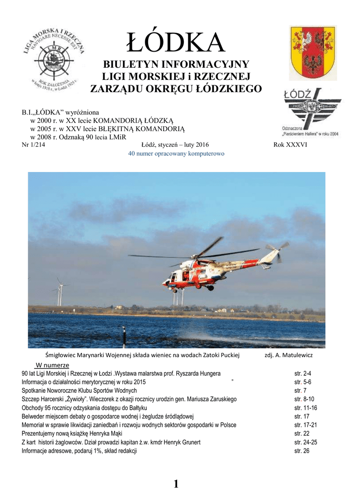 ŁÓDKA BIULETYN INFORMACYJNY LIGI MORSKIEJ i RZECZNEJ ZARZĄDU OKRĘGU ŁÓDZKIEGO B.I.„ŁÓDKA” wyróżniona w 2000 r. w XX lecie KOMANDORIĄ ŁÓDZKĄ w 2005 r. w XXV lecie BŁĘKITNĄ KOMANDORIĄ w 2008 r. Odznaką 90 lecia LMiR Nr 1/214 Łódź, styczeń – luty 2016 40 numer opracowany komputerowo Śmigłowiec Marynarki Wojennej składa wieniec na wodach Zatoki Puckiej Ro” W numerze 90 lat Ligi Morskiej i Rzecznej w Łodzi .Wystawa malarstwa prof. Ryszarda Hungera Informacja o działalności merytorycznej w roku 2015 ” Spotkanie Noworoczne Klubu Sportów Wodnych Szczep Harcerski „Żywioły”. Wieczorek z okazji rocznicy urodzin gen. Mariusza Zaruskiego Obchody 95 rocznicy odzyskania dostępu do Bałtyku Belweder miejscem debaty o gospodarce wodnej i żegludze śródlądowej Memoriał w sprawie likwidacji zaniedbań i rozwoju wodnych sektorów gospodarki w Polsce Prezentujemy nową książkę Henryka Mąki Z kart historii żaglowców. Dział prowadzi kapitan ż.w. kmdr Henryk Grunert Informacje adresowe, podaruj 1%, skład redakcji 1 Rok XXXVI zdj. A. Matulewiczego str. 2-4 str. 5-6 str. 7 str. 8-10 str. 11-16 str. 17 str. 17-21 str. 22 str. 24-25 str. 26 LIGA MORSKA I RZECZNA 90 lat w Łodzi PŁYNIEMY NA PEŁNYCH ŻAGLACH W PIERWSZE 100 LECIE Z WIELKIMI GROTMASZTAMI Aleksy Rżewski pierwszy prezydent niepodległej Łodzi 1919 – 1923 Hanna Zdanowska pierwsza kobieta prezydent Łodzi 2010 - Ten wielki Jubileusz obchodzony w Łodzi w 2015 roku zakończony został udziałem w wielkiej wystawie malarstwa sztuki współczesnej prof. Ryszarda Hungera – honorowego członka i artystycznego opiekuna łódzkiego, bratniego Lidze, Stowarzyszenia Plastyków Amatorów ze szczególnie cieszącą nas orientacją marynistyczną. Wernisaż WYSTAWY odbył się 15 grudnia 2015 w głównym, historycznym budynku Miejskiej Galerii Sztuki*) w Parku Sienkiewicza. Miejska Galeria Sztuki powołana została w 1924 roku dzięki staraniom Oddziału Sztuki i Kultury Województwa Łódzkiego oraz ławników z Wydziału Oświaty i Kultury łódzkiego Magistratu. Inicjatywę tę poparli prezydenci miasta Aleksy Rżewski i Marian Cynarski. *) Prof. Ryszard Hunger malarz, grafik, pedagog ASP i PWSFTviT w Łodzi 2 Na siedzibę Galerii przeznaczono pawilon kawiarni, położony w parku im. Henryka Sienkiewicza, który zaadoptowano na potrzeby wystawiennicze. Prowadzenie instytucji powierzono Marianowi Dienstl – Dabrowie, historykowi sztuki i publicyście. Konkurował on z Towarzystwem Przyjaciół Sztuk Pięknych „Zachęta” o prowadzenie łódzkiej galerii. W zamian za dotację w wysokości 8 tys. złotych rocznie Dienstl – Dabrowa zobowiązał się do organizowania wystaw plastycznych, ze szczegól- nym uwzględnieniem artystów łódzkich oraz do stworzenia kolekcji dzieł sztuki i propagowaniu szeroko pojętej kultury plastycznej. . Od wielu lat Miejska Galeria Sztuki kierowana jest przez współpracująca z nami Panią Dyrektor Elżbietę Fuchs. Elżbieta Fuchs dyrektor Miejskiej Galerii Sztuki Pierwszym dyrektorem Miejskiej Galerii Sztuki w latach 1924 – 1930 był ppłk. Marian Dienstl – Dabrowa. Urodził się 1 marca 1882 r. w Przemyślu. Studiował historię sztuki i malarstwo. W 1910 r. założył pierwszy artystyczny teatr lalek (Teatr Kukiełek), scenograf i reżyser operowy (dyrektor teatru W.A.Mozarta). Od 1917 r. w armii gen. Józefa Hallera, najpierw we Francji, potem we Włoszech. Publicysta, krytyk artystyczny. Założyciel i pierwszy prezes Ligi Morskiej i Rzecznej Okręgu Łódzkiego w latach 1925 – 1930. Zmarł 30 stycznia 1957 roku w Warszawie Na głazie o wymiarach 2x2x1,5 m w Parku Sienkiewicza znajduje się tablica pamiątkowa ufundowana przez Ligę Morską i Rzeczną z napisem: MARIANOWI DIENSTL – DĄBROWIE TWÓRCY I PIERWSZEMU DYREKTOROWI (1924) MIEJSKIEJ GALERII SZTUKI W ŁODZI, TWÓRCY ORAZ PIERWSZEMU PREZESOWI (1925) Popiersie Mariana Dienstl – Dabrowy LIGI MORSKIEJ I RZECZNEJ OKRĘGU ŁÓDZKIEGO dłuta artysty rzeźbiarza Apolinarego Z POKŁONEM W 80 ROCZNICĘ POWSTANIA MGS i LMiR Głowińskiego LUDZIE MORZA zdjęcie Narodowe Archiwum Cyfrowe Łódź 2004/2005 Replika tablicy znajduje się w Muzeum Morskiem w VI Liceum Ogólnokształcącym im. Joachima Lelewela w Łodzi. 3 Obrazy Profesora wypożyczone z Muzeów w Kraju na ścianach Łódzkiej Galerii Sztuki Od lewej: Dyrektor E. Fuchs z Zastępcą, prof. R. Hunger w rozmowie z Prezydent Łodzi Hanną Zdanowską Od lewej: Prezes Marynistów Polskich w Łodzi. W środku obrócony Profesor w czasie rozmowy z Gośćmi Wystawy odnotowanej w prasie jako wydarzenie kulturalne roku 2015 Na zdjęciu: Autor obrazów Wystawy prof. Ryszard Hunger przyjmuje gratulacje od swoich wieloletnich słuchaczy wykładów Hanny i Feliksa Zamelskich – kierowników malarskich plenerów morskich oraz prezesowania Stowarzyszeniu Plastyków Amatorów w Łodzi Na zdjęciu jeszcze raz Hanna Zamelska i Profesor ukontentowany ilością przybyłych na Wystawę gości – znawców sztuki współczesnej i fanów jej Autora Jedne z obrazów profesora Inny obraz 4 Zdjęcia i tekst Stanisław Kobyliński Honorowy Prezes ZOŁ LMiR Informacja o działalności merytorycznej w roku 2015 Szczegółowe zestawienie wydarzeń i przedsięwzięć wodniacko-morskich zrealizowanych w Łodzi i w Polsce, w których brali udział działacze Łódzkiego Okręgu LMiR w roku 2015 Lp 1 2 Realizacja przedsięwzięcia Organizator, wykonawca, Uroczyste rozpoczęcie obchodów 65 lecia Klubu Sportów Wodnych LMiR w Łodzi Posiedzenie Zarządu Głównego. Okręg Łódzki reprezentował honorowy prezes Zarządu Stefan Wasiljew 3 Obchody 95 rocznicy odzyskania dostępu do morza 4 Ppor. mar. Stanisław Pacho nie żyje. Pochowany na cmentarzu w Brzezinach 5 Wydanie BI „ŁÓDKA” nr 1/209 z „Informacją o działalności merytorycznej w roku 2013” i opisem wydarzeń listopad - grudzień 2014 r. 6 7 8 9 10 11 Uroczyste Zebranie Zarządu Okręgu Łódzkiego LMiR pośw