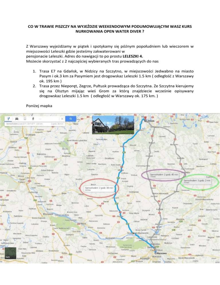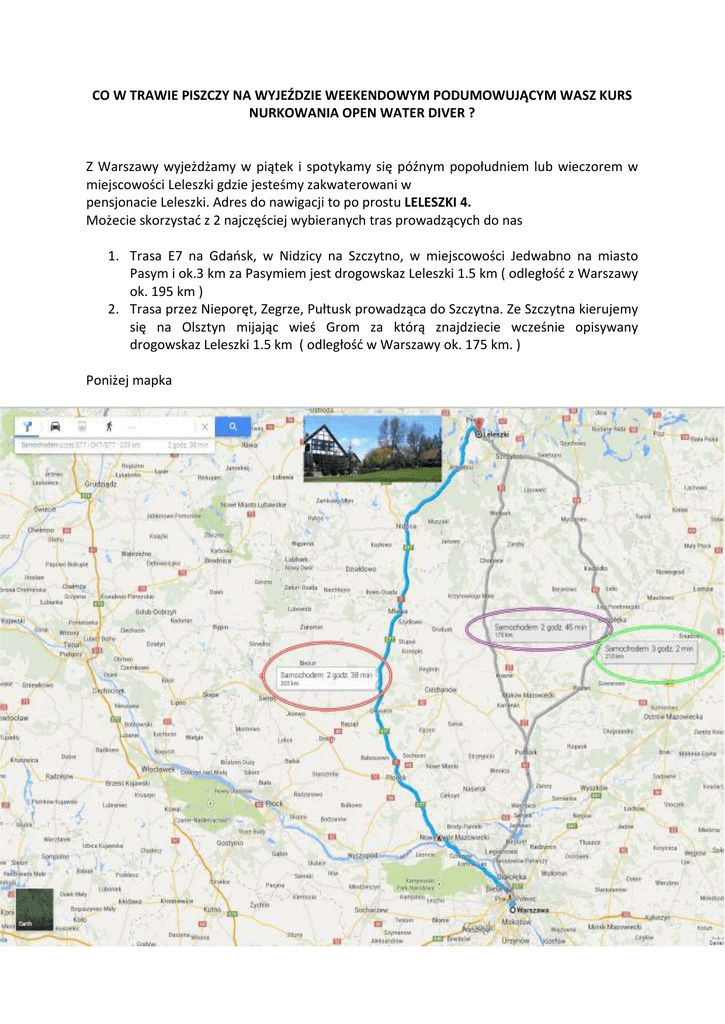 CO W TRAWIE PISZCZY NA WYJEŹDZIE WEEKENDOWYM PODUMOWUJĄCYM WASZ KURS NURKOWANIA OPEN WATER DIVER ? Z Warszawy wyjeżdżamy w piątek i spotykamy się późnym popołudniem lub wieczorem w miejscowości Leleszki gdzie jesteśmy zakwaterowani w pensjonacie Leleszki. Adres do nawigacji to po prostu LELESZKI 4. Możecie skorzystać z 2 najczęściej wybieranych tras prowadzących do nas 1. Trasa E7 na Gdańsk, w Nidzicy na Szczytno, w miejscowości Jedwabno na miasto Pasym i ok.3 km za Pasymiem jest drogowskaz Leleszki 1.5 km ( odległość z Warszawy ok. 195 km ) 2. Trasa przez Nieporęt, Zegrze, Pułtusk prowadząca do Szczytna. Ze Szczytna kierujemy się na Olsztyn mijając wieś Grom za którą znajdziecie wcześnie opisywany drogowskaz Leleszki 1.5 km ( odległość w Warszawy ok. 175 km. ) Poniżej mapka Agenda wyjazdu Piątek 1. Przyjazd i zakwaterowanie od godziny 18.00 do 24.00 2. Drobny poczęstunek Sobota 1. 2. 3. 4. 5. 6. 7. Śniadanie 9.30 Zbiórka w patio i odprawa przed zajęciami 11.00 Dwa nurkowania szkoleniowe trwające do godziny 15.30 Obiad godzina 16.00 Czas wolny Rozwiązywania testów kontrolnych od godziny 18.00 do 20.00 Kolacja i czas wolny przy grillu z ogniskiem ☺ Niedziela 1. 2. 3. 4. 5. 6. Śniadanie 9.30 Zbiórka w patio i odprawa przed zajęciami 11.00 Dwa nurkowania szkoleniowe trwające do godziny 14.30 Obiad godzina 15.00 Uroczyste zakończenie kursu i mianowanie na nurka Czas wolny Informacje dodatkowe Prosimy o przygotowanie 2 zdjęć do licencji nurka i ewentualnie nie przekazane jeszcze dokumenty kursu. Proszę zabrać ze sobą jedynie rzeczy osobiste ze wskazaniem na jakieś nakrycie głowy które ochroni nas przed słońcem lub wiatrem. Zakwaterowanie Na naszych gości czekają wygodnie urządzone pokoje 2, 3 i 4 osobowe. Wszystkie posiadają łazienkę, telewizor i zestaw audio. Pastelowe, drewniane wykończenie i kolorowa pościel sprawią, że dobry humor będziesz miał nawet w nocy. Zapraszamy tez na słynące z obfitości i pysznego smaku śniadania, obiady i kolacje, które dla prawdziwych smakoszy są najmilszym wspomnieniem i zachętą do powrotu. Z naszego polskiego stołu wybierzesz sobie to na co masz ochotę. Grzeczne zwierzęta mile widziane. Opłaty za pobyt dokonujemy na miejscu. Niestety nie można płacić kartami. Jezioro Jezioro Leleskie słynie w całej Polsce ze swojej czystości. Jego niepowtarzalna linia brzegowa, łagodne piaszczyste dno i dobre podejście z brzegów przyciąga zarówno amatorów kąpieli jak i miłośników nurkowania. Leleskie jest też rajem dla wędkarzy - przybrzeżne szuwary, podwodne górki i brzegi wysepek kryją nieprzebrane ilości szczupaków, okoni, sielawy, płoci, leszczy i węgorzy. Jezioro wraz z sąsiednim jeziorem Kalwa tworzy niezwykle urokliwy szlak kajakowy, a strefa ciszy jest najlepszą gwarancją dobrych warunków dla żeglarzy. Całkowita powierzchnia jeziora Leleskiego wynosi 429 ka, długość 4.1 km i szerokość 1.4 km. Zarośnięty półwysep dzieli jezioro na dwie części - wieś Leleszki usytuowana jest nad węższą z nich na południowym brzegu. Leleskie ma też 8 wysp o łącznej powierzchni 5.5 ha, które są znakomitym celem wypraw w poszukiwaniu skarbów. Głębokość wynosi nawet do 50 m, a piaszczyste bardzo urozmaicone dno oraz znakomita przejrzystość wody doceniają regularnie zjawiające się tu grupy nurkowe z całej Polski. Specjalnie dla naszych gości zbudowaliśmy pomost, przy którym można zacumować wypożyczone łodzie, kajaki i rowery wodne. Bardzo łagodny spadek przypadnie do gustu przede wszystkim dzieciom, które mogą się pluskać i bawić w wodzie przez cały dzień Jesteśmy pewni że spędzicie z nami wspaniały weekend który będzie początkiem nowej przygody ☺ Do zobaczenia w Leleszkach Z pozdrowieniami Kadra Warszawskiego Centrum Nurkowego
