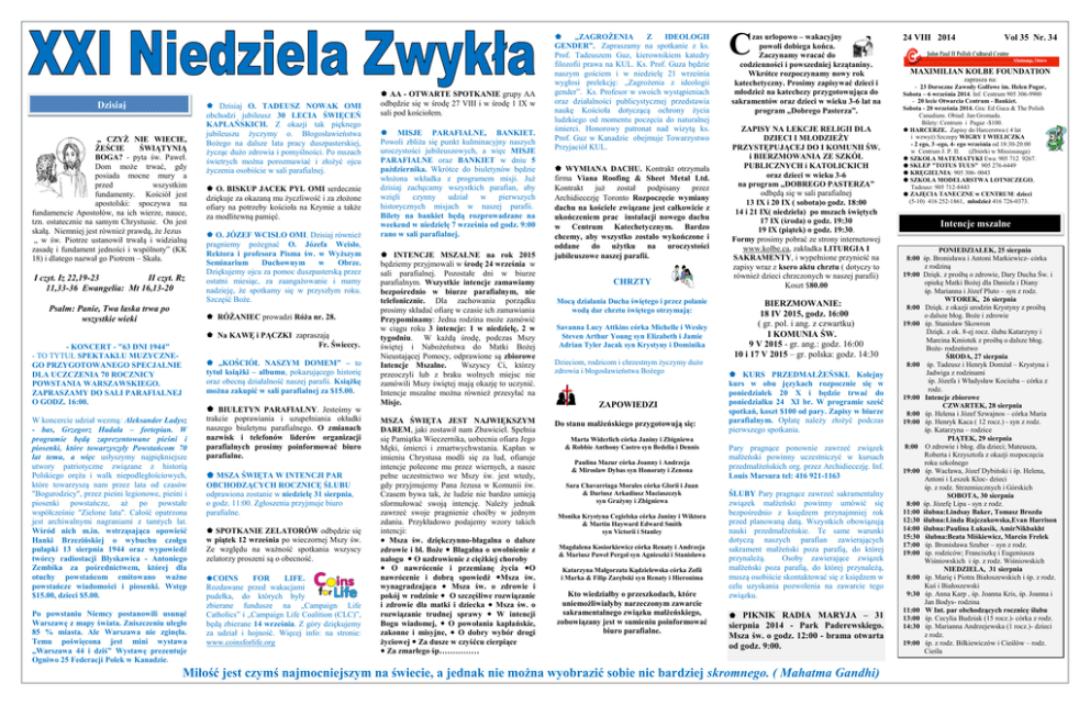 . Dzisiaj „ CZYŻ NIE WIECIE, ŻEŚCIE ŚWIĄTYNIĄ BOGA? - pyta św. Paweł. Dom może trwać, gdy posiada mocne mury a przed wszystkim fundamenty. Kościół jest apostolski: spoczywa na fundamencie Apostołów, na ich wierze, nauce, tzn. ostatecznie na samym Chrystusie. On jest skałą. Niemniej jest również prawdą, że Jezus „ w św. Piotrze ustanowił trwałą i widzialną zasadę i fundament jedności i wspólnoty” (KK 18) i dlatego nazwał go Piotrem – Skała. I czyt. Iz 22,19-23 II czyt. Rz 11,33-36 Ewangelia: Mt 16,13-20 Psalm: Panie, Twa łaska trwa po wszystkie wieki Dzisiaj O. TADEUSZ NOWAK OMI obchodzi jubileusz 30 LECIA ŚWIĘCEŃ KAPŁAŃSKICH. Z okazji tak pięknego jubileuszu życzymy o. Błogosławieństwa Bożego na dalsze lata pracy duszpasterskiej, życząc dużo zdrowia i pomyślności. Po mszach świetrych można porozmawiać i złożyć ojcu życzenia osobiście w sali parafialnej. O. BISKUP JACEK PYL OMI serdecznie dziękuje za okazaną mu życzliwość i za złożone ofiary na potrzeby kościoła na Krymie a także za modlitewną pamięć. O. JÓZEF WCISŁO OMI. Dzisiaj również pragniemy pożegnać O. Józefa Wcisło, Rektora i profesora Pisma św. w Wyższym Seminarium Duchownym w Obrze. Dziękujemy ojcu za pomoc duszpasterską przez ostatni miesiąc, za zaangażowanie i mamy nadzieję, że spotkamy się w przyszłym roku. Szczęść Boże. RÓŻANIEC prowadzi Róża nr. 28. Na KAWĘ i PĄCZKI zapraszają Fr. Świeccy. - KONCERT - "63 DNI 1944" - TO TYTUŁ SPEKTAKLU MUZYCZNEGO PRZYGOTOWANEGO SPECJALNIE DLA UCZCZENIA 70 ROCZNICY POWSTANIA WARSZAWSKIEGO. ZAPRASZAMY DO SALI PARAFIALNEJ O GODZ. 16:00. „KOŚCIÓŁ NASZYM DOMEM” – to tytuł książki – albumu, pokazującego historię oraz obecną działalność naszej parafii. Książkę można zakupić w sali parafialnej za $15.00. BIULETYN PARAFIALNY. Jesteśmy w W koncercie udział wezmą: Aleksander Ładysz - bas, Grzegorz Hadała – fortepian. W programie będą zaprezentowane pieśni i piosenki, które towarzyszyły Powstańcom 70 lat temu, a więc usłyszymy najpiękniejsze utwory patriotyczne związane z historią Polskiego oręża i walk niepodległościowych, które towarzyszą nam przez lata od czasów "Bogurodzicy", przez pieśni legionowe, pieśni i piosenki powstańcze, aż po powstałe współcześnie "Zielone lata". Całość opatrzona jest archiwalnymi nagraniami z tamtych lat. Wśród nich m.in. wstrząsająca opowieść Hanki Brzezińskiej o wybuchu czołgu pułapki 13 sierpnia 1944 oraz wypowiedź twórcy radiostacji Błyskawica - Antoniego Zembika za pośrednictwem, której dla otuchy powstańcom emitowano ważne powstańcze wiadomości i piosenki. Wstęp $15.00, dzieci $5.00. Po powstaniu Niemcy postanowili usunąć Warszawę z mapy świata. Zniszczeniu uległo 85 % miasta. Ale Warszawa nie zginęła. Temu poświęcona jest mini wystawa „Warszawa 44 i dziś” Wystawę prezentuje Ogniwo 25 Federacji Polek w Kanadzie. trakcie poprawiania i uzupełniania okładki naszego biuletynu parafialnego. O zmianach nazwisk i telefonów liderów organizacji parafialnych prosimy poinformować biuro parafialne. MSZA ŚWIĘTA W INTENCJI PAR OBCHODZĄCYCH ROCZNICĘ ŚLUBU odprawiona zostanie w niedzielę 31 sierpnia, o godz. 11:00. Zgłoszenia przyjmuje biuro parafialne. SPOTKANIE ZELATORÓW odbędzie się w piątek 12 września po wieczornej Mszy św. Ze względu na ważność spotkania wszyscy zelatorzy proszeni są o obecność. COINS FOR LIFE. Rozdawane przed wakacjami pudełka, do których były zbierane fundusze na „Campaign Life Catholics” i „Campaign Life Coalition (CLC)”, będą zbierane 14 września. Z góry dziękujemy za udział i hojność. Więcej info: na stronie: www.coinsforlife.org AA - OTWARTE SPOTKANIE grupy AA odbędzie się w środę 27 VIII i w środę 1 IX w sali pod kościołem. MISJE PARAFIALNE, BANKIET. Powoli zbliża się punkt kulminacyjny naszych uroczystości jubileuszowych, a więc MISJE PARAFIALNE oraz BANKIET w dniu 5 października. Wkrótce do biuletynów będzie włożona wkładka z programem misji. Już dzisiaj zachęcamy wszystkich parafian, aby wzięli czynny udział w pierwszych historycznych misjach w naszej parafii. Bilety na bankiet będą rozprowadzane na weekend w niedzielę 7 września od godz. 9:00 rano w sali parafialnej. INTENCJE MSZALNE na rok 2015 będziemy przyjmowali w środę 24 września w sali parafialnej. Pozostałe dni w biurze parafialnym. Wszystkie intencje zamawiamy bezpośrednio w biurze parafialnym, nie telefonicznie. Dla zachowania porządku prosimy składać ofiarę w czasie ich zamawiania Przypominamy: Jedna rodzina może zamówić w ciągu roku 3 intencje: 1 w niedzielę, 2 w tygodniu. W każdą środę, podczas Mszy świętej i Nabożeństwa do Matki Bożej Nieustającej Pomocy, odprawione są zbiorowe Intencje Mszalne. Wszyscy Ci, którzy przeoczyli lub z braku wolnych miejsc nie zamówili Mszy świętej mają okazję to uczynić. Intencje mszalne można również przesyłać na Misje. MSZA ŚWIĘTA JEST NAJWIĘKSZYM DAREM, jaki zostawił nam Zbawiciel. Spełnia się Pamiątka Wieczernika, uobecnia ofiara Jego Męki, śmierci i zmartwychwstania. Kapłan w imieniu Chrystusa modli się za lud, ofiaruje intencje polecone mu przez wiernych, a nasze pełne uczestnictwo we Mszy św. jest wtedy, gdy przyjmujemy Pana Jezusa w Komunii św. Czasem bywa tak, że ludzie nie bardzo umieją sformułować swoją intencję. Należy jednak zawrzeć swoje pragnienie choćby w jednym zdaniu. Przykładowo podajemy wzory takich intencji: Msza św. dziękczynno-błagalna o dalsze zdrowie i bł. Boże Błagalna o uwolnienie z nałogu O uzdrowienie z ciężkiej choroby O nawrócenie i przemianę życia O nawrócenie i dobrą spowiedź Msza św. wynagradzająca Msza św. o zdrowie i pokój w rodzinie O szczęśliwe rozwiązanie i zdrowie dla matki i dziecka Msza św. o rozwiązanie trudnej sprawy W intencji Bogu wiadomej, O powołania ka
