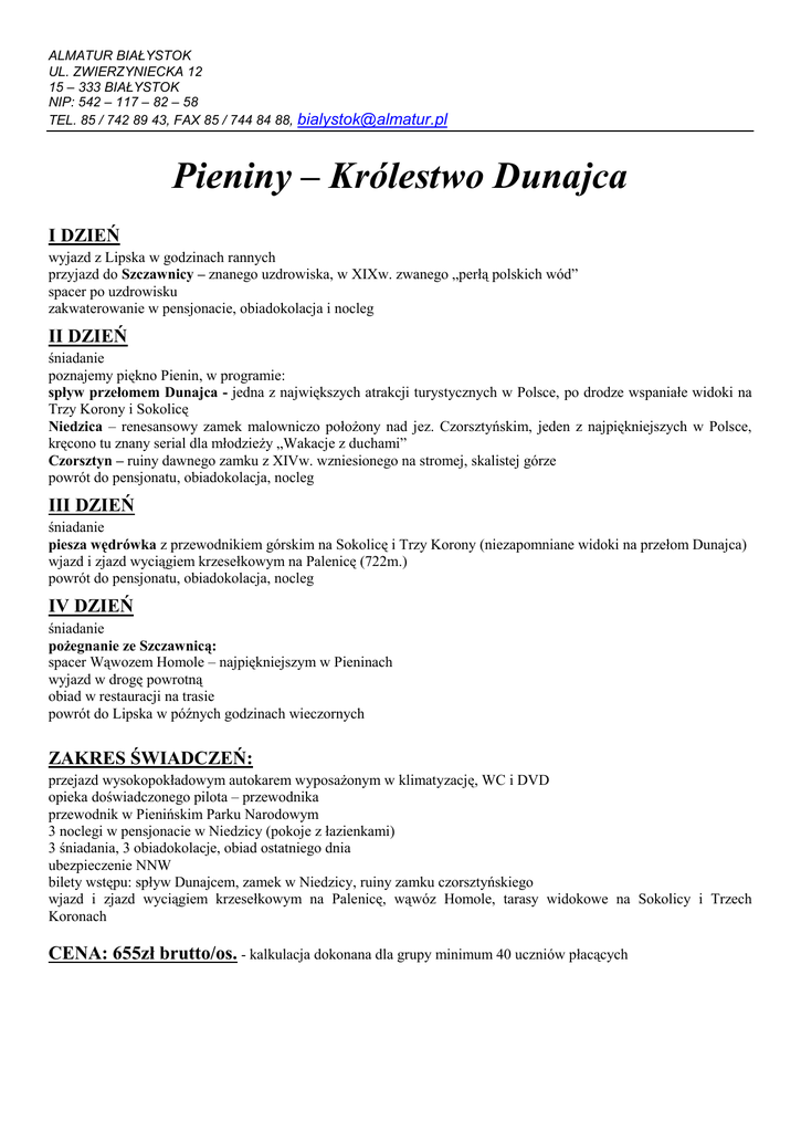 ALMATUR BIAŁYSTOK UL. ZWIERZYNIECKA 12 15 – 333 BIAŁYSTOK NIP: 542 – 117 – 82 – 58 TEL. 85 / 742 89 43, FAX 85 / 744 84 88, [email protected] Pieniny – Królestwo Dunajca I DZIEŃ wyjazd z Lipska w godzinach rannych przyjazd do Szczawnicy – znanego uzdrowiska, w XIXw. zwanego „perłą polskich wód” spacer po uzdrowisku zakwaterowanie w pensjonacie, obiadokolacja i nocleg II DZIEŃ śniadanie poznajemy piękno Pienin, w programie: spływ przełomem Dunajca - jedna z największych atrakcji turystycznych w Polsce, po drodze wspaniałe widoki na Trzy Korony i Sokolicę Niedzica – renesansowy zamek malowniczo położony nad jez. Czorsztyńskim, jeden z najpiękniejszych w Polsce, kręcono tu znany serial dla młodzieży „Wakacje z duchami” Czorsztyn – ruiny dawnego zamku z XIVw. wzniesionego na stromej, skalistej górze powrót do pensjonatu, obiadokolacja, nocleg III DZIEŃ śniadanie piesza wędrówka z przewodnikiem górskim na Sokolicę i Trzy Korony (niezapomniane widoki na przełom Dunajca) wjazd i zjazd wyciągiem krzesełkowym na Palenicę (722m.) powrót do pensjonatu, obiadokolacja, nocleg IV DZIEŃ śniadanie pożegnanie ze Szczawnicą: spacer Wąwozem Homole – najpiękniejszym w Pieninach wyjazd w drogę powrotną obiad w restauracji na trasie powrót do Lipska w późnych godzinach wieczornych ZAKRES ŚWIADCZEŃ: przejazd wysokopokładowym autokarem wyposażonym w klimatyzację, WC i DVD opieka doświadczonego pilota – przewodnika przewodnik w Pienińskim Parku Narodowym 3 noclegi w pensjonacie w Niedzicy (pokoje z łazienkami) 3 śniadania, 3 obiadokolacje, obiad ostatniego dnia ubezpieczenie NNW bilety wstępu: spływ Dunajcem, zamek w Niedzicy, ruiny zamku czorsztyńskiego wjazd i zjazd wyciągiem krzesełkowym na Palenicę, wąwóz Homole, tarasy widokowe na Sokolicy i Trzech Koronach CENA: 655zł brutto/os. - kalkulacja dokonana dla grupy minimum 40 uczniów płacących