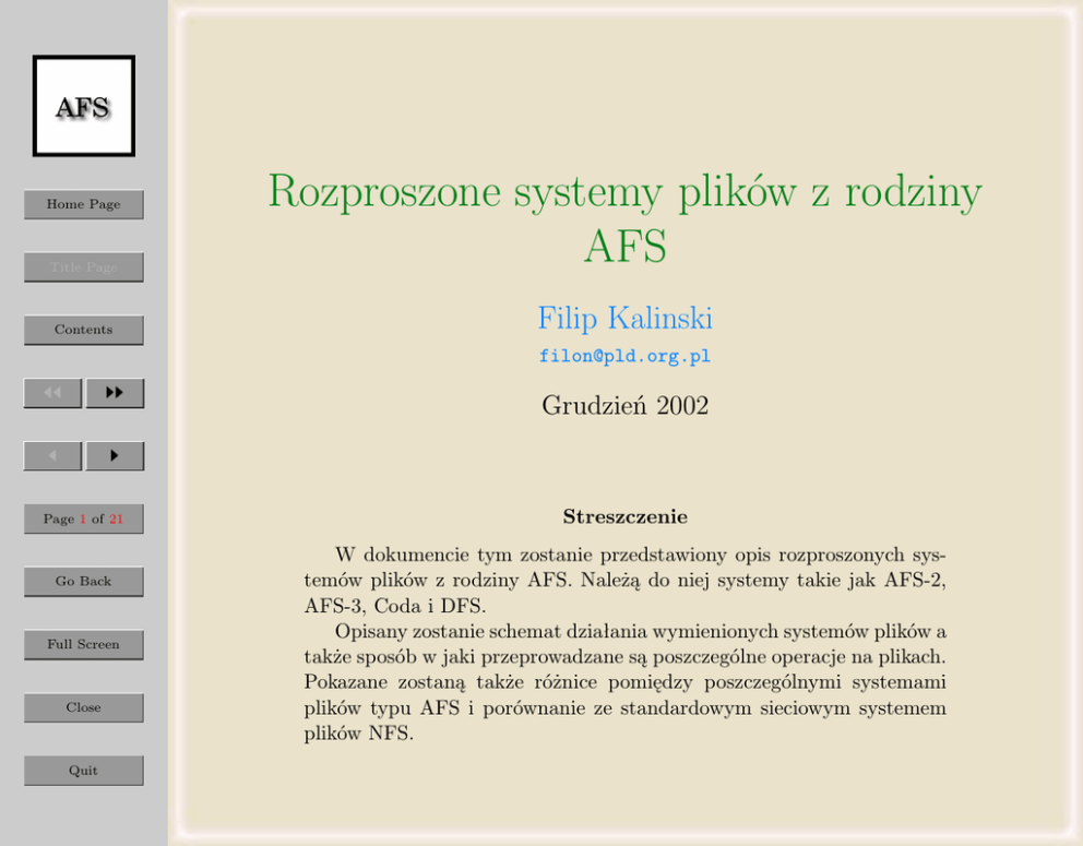 Title Page Rozproszone systemy plików z rodziny AFS Contents Filip Kalinski Home Page [email protected] JJ II J I Page 1 of 21 Go Back Full Screen Close Quit Grudzień 2002 Streszczenie W dokumencie tym zostanie przedstawiony opis rozproszonych systemów plików z rodziny AFS. Należą do niej systemy takie jak AFS-2, AFS-3, Coda i DFS. Opisany zostanie schemat działania wymienionych systemów plików a także sposób w jaki przeprowadzane są poszczególne operacje na plikach. Pokazane zostaną także różnice pomiędzy poszczególnymi systemami plików typu AFS i porównanie ze standardowym sieciowym systemem plików NFS. Spis treści Home Page Title Page Contents JJ II J I Page 2 of 21 Go Back 1 Historia 3 2 Założenia i konsekwencje 2.1 Cele i założenia . . . . . . . . . . . . . . . . . . . . . . . . . . . 2.2 Konsekwencje . . . . . . . . . . . . . . . . . . . . . . . . . . . . 5 5 6 3 Implementacja 3.1 Serwer . . . . . . . . . . . . . . 3.1.1 BOS . . . . . . . . . . . 3.1.2 Ubik . . . . . . . . . . . 3.1.3 Zarządzanie wolumenami 3.1.4 Autoryzacja . . . . . . . 3.1.5 Serwowanie plików . . . 3.1.6 Pozostałe . . . . . . . . 3.2 Klient . . . . . . . . . . . . . . . . . . . . . . . . . . . . . . . . . . . . . . . . . . . . . . . . . . . . . . . . . . . . . . . . . . . . . . . . . . . . . . . . . . . . . . . . . . . . . . . . . . . . . . . . . . . . . . . . . . . . . . . . . . . . . . . . . . . . . . . . . . . . . . . . . . . . . . . . . . . . . . 9 12 13 13 13 13 14 14 15 4 Pozostałe systemy 18 4.1 Coda . . . . . . . . . . . . . . . . . . . . . . . . . . . . . . . . . 18 4.2 DFS . . . . . . . . . . . . . . . . . . . . . . . . . . . . . . . . . 20 Full Screen 5 AFS a NFS Close Quit 21 1. Home Page Title Page Contents JJ II J I Page 3 of 21 Go Back Historia W roku 1983 w Carnegie Mellon University (CMU) w ramach projektu „Andrew” rozpoczęto pracę nad nowoczesnym rozproszonym systemem plików. Od nazwy projektu badawczego wywodzi się rozwinięcie skrótu AFS – „Andrew FileSystem”. Początkowo rozwijany system AFS-1, który został wydany po roku od rozpoczęcia prac W CMU, był jedynie przymiarką przed zaprojektowaniem systemu nadającego się do użycia w praktyce. Zatem, w roku 1986 powstał będący rozwinięciem początkowego projektu – AFS-2. Niedługo po nim zapoczątkowano w CMU pracę nad systemem Coda, który bazując na AFS-2 wprowadził swoje rozszerzenia funkcjonalności. Z AFS-2 wywodził się także jego następca, system AFS-3, który w 1989 został skomercjalizowany przez założoną w tym celu firmę „Transarc Corporation”. Transarc w roku 1998 wykupiony został przez IBM, który dwa lata później wydał AFS-3 z nazwą zmianioną na OpenAFS dostępny „OpenSource”. W chwili dzisiejszej dostępne i aktywnie rozwijane implementacje AFS to IBM OpenAFS (serwer oraz klient), Arla (implementacje klienta AFS rozwijana w Kungla Tekniska Högskolan) oraz RedHat AFS (klient AFS w jądrze Linuksa, włączony do gałęzi 2.5, na razie nie obsługuje operacji zapisu, etc. . . ). Full Screen Następujące rysunki ilustrują historię systemów z rodziny AFS i zależności między nimi: Close Quit Home Page Title Page Contents Rysunek 1: Historia JJ II J I AFS-1 Page 4 of 21 AFS-2 Go Back AFS-3 Coda Full Screen DFS Close Rysunek 2: Zależności Quit 2. Założenia i konsekwencje 2.1. Home Page Cele i założenia Przy projektowaniu systemu AFS skorzystano ze spostrzeżeń dotyczących najczęstszych schematów użycia plików (badania M. Satyanarayanana z CMU). Wynikało z nich, że: Title Page • większość plików jest mała i wczytywana w całości Contents JJ II J I Page 5 of 21 Go Back • większość plików używana jest przez tylko jednego użytkownika • operacje odczytu są znacznie częstsze niż operacje zapisu (średnio w proporcjach 6:1) • najczęściej dostęp do plików jest seryjny, tzn. w krótkim przeciągu czasu ten sam plik jest używany wielokrotnie Jako główne cele postawiono sobie: • wyskoką niezawodość • bezpieczeństwo systemu Full Screen • szybkość działania Close Quit • obsługę bardzo dużej liczby użytkowników (przynajmniej 5000) • przezroczystość dla użytkownika 2.2. Konsekwencje Z powyższych założeń wynikają podstawowe cechy systemu AFS: Home Page Title Page Contents JJ II J I Page 6 of 21 Go Back Full Screen • Serwowanie plików w całości Zmniejsza liczbę odwołań do serwera, a także umożliwia lepsze wykorzystanie łącz. W AFS-3 zmieniono podejście na serwowanie plików w dużych kawałkach (and. chunk ). Domyślną wielkością kawałka jest 64KB a możliwe jest skonfigurowanie tej wartości aż do 256KB. Katalogi nadal serwowane są w całości. • Buforowanie Wszystkie otwierane pliki i katalogi są przechowywane u klienta na dysku. Kolejne operacje odczytu nie wymagają ponownego pobierania pliku z serwera, wykonywany jest jedynie szybki odczyt z lokalnego systemu plików. Jedyną stuacją w której konieczne jest ponowne pobranie pliku jest informacja z serwera o jego modyfikacji. Operacje zapisu także nie przesyłają danych na serwer, dopiero zamknięcie pliku powoduje wysłanie go z powrotem (z wyjątkiem zmian w katalogach, które są przysłane natychmiast). Dzięki temu oszczędzany jest nie tylko serwer (co umożliwia mu przyłączenie większej ilości klientów) ale także łącza sieciowe. Jest to kluczowa cecha AFS zapewniająca wysoką skalowalność sytemu. Close Katalogi oraz pliki są buforowane tak jak pobierane – w całości w AFS-2 i Coda a w dużych kwałkach w AFS-3 i DFS. Quit • Mechanizm zapewnienia spójności Serwer plików AFS pliku pamięta listę plików otwartych u każdego z klientów. Umożliwia to stosowanie mechanizmu callbacków. Home Page Title Page Contents Polega to na tym, że w razie modyfikacji pliku serwer informuje klienta o zmianie, po czym klient pobiera zmodyfikowany plik i uaktualnia go buforze. Zapewnienie spójności dany