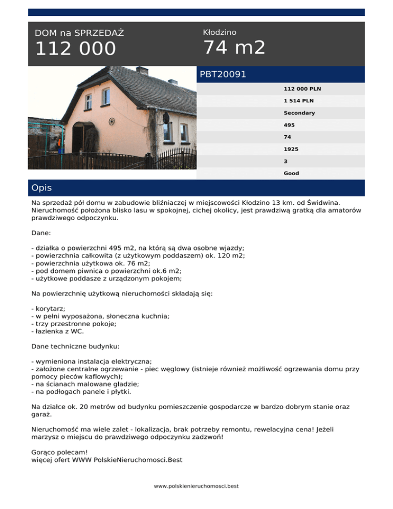 Kłodzino DOM na SPRZEDAŻ 74 m2 112 000 PBT20091 112 000 PLN 1 514 PLN Secondary 495 74 1925 3 Good Opis Na sprzedaż pół domu w zabudowie bliźniaczej w miejscowości Kłodzino 13 km. od Świdwina. Nieruchomość położona blisko lasu w spokojnej, cichej okolicy, jest prawdziwą gratką dla amatorów prawdziwego odpoczynku. Dane: - działka o powierzchni 495 m2, na którą są dwa osobne wjazdy; powierzchnia całkowita (z użytkowym poddaszem) ok. 120 m2; powierzchnia użytkowa ok. 76 m2; pod domem piwnica o powierzchni ok.6 m2; użytkowe poddasze z urządzonym pokojem; Na powierzchnię użytkową nieruchomości składają się: - korytarz; w pełni wyposażona, słoneczna kuchnia; trzy przestronne pokoje; łazienka z WC. Dane techniczne budynku: - wymieniona instalacja elektryczna; - założone centralne ogrzewanie - piec węglowy (istnieje również możliwość ogrzewania domu przy pomocy pieców kaflowych); - na ścianach malowane gładzie; - na podłogach panele i płytki. Na działce ok. 20 metrów od budynku pomieszczenie gospodarcze w bardzo dobrym stanie oraz garaż. Nieruchomość ma wiele zalet - lokalizacja, brak potrzeby remontu, rewelacyjna cena! Jeżeli marzysz o miejscu do prawdziwego odpoczynku zadzwoń! Gorąco polecam! więcej ofert WWW PolskieNieruchomosci.Best www.polskienieruchomosci.best +48 94 307 04 51 / +48 537 773 089 [email protected] WWW GrupaBestPartner.Pl Kamil Jakszuk tel. +48 531 773 088 email: [email protected] www.polskienieruchomosci.best Powered by TCPDF (www.tcpdf.org)