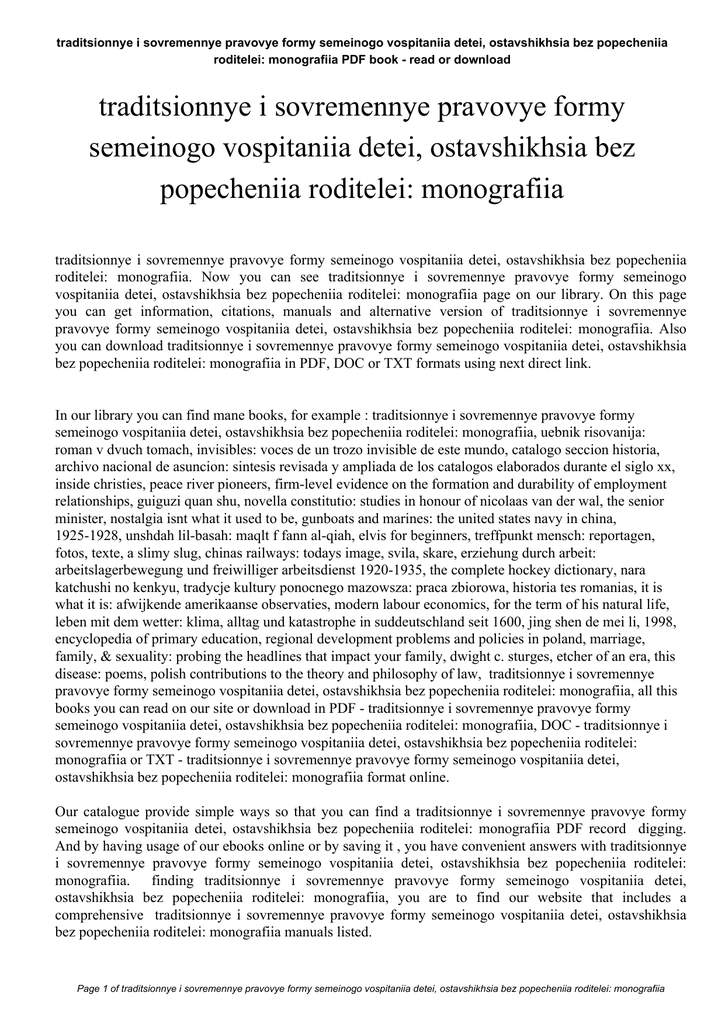 traditsionnye i sovremennye pravovye formy semeinogo vospitaniia detei, ostavshikhsia bez popecheniia roditelei: monografiia PDF book - read or download traditsionnye i sovremennye pravovye formy semeinogo vospitaniia detei, ostavshikhsia bez popecheniia roditelei: monografiia traditsionnye i sovremennye pravovye formy semeinogo vospitaniia detei, ostavshikhsia bez popecheniia roditelei: monografiia. Now you can see traditsionnye i sovremennye pravovye formy semeinogo vospitaniia detei, ostavshikhsia bez popecheniia roditelei: monografiia page on our library. On this page you can get information, citations, manuals and alternative version of traditsionnye i sovremennye pravovye formy semeinogo vospitaniia detei, ostavshikhsia bez popecheniia roditelei: monografiia. Also you can download traditsionnye i sovremennye pravovye formy semeinogo vospitaniia detei, ostavshikhsia bez popecheniia roditelei: monografiia in PDF, DOC or TXT formats using next direct link. In our library you can find mane books, for example : traditsionnye i sovremennye pravovye formy semeinogo vospitaniia detei, ostavshikhsia bez popecheniia roditelei: monografiia, uebnik risovanija: roman v dvuch tomach, invisibles: voces de un trozo invisible de este mundo, catalogo seccion historia, archivo nacional de asuncion: sintesis revisada y ampliada de los catalogos elaborados durante el siglo xx, inside christies, peace river pioneers, firm-level evidence on the formation and durability of employment relationships, guiguzi quan shu, novella constitutio: studies in honour of nicolaas van der wal, the senior minister, nostalgia isnt what it used to be, gunboats and marines: the united states navy in china, 1925-1928, unshdah lil-basah: maqlt f fann al-qiah, elvis for beginners, treffpunkt mensch: reportagen, fotos, texte, a slimy slug, chinas railways: todays image, svila, skare, erziehung durch arbeit: arbeitslagerbewegung und freiwilliger arbeitsdienst 1920-1935, the complete hockey dictionary, nara katchushi no kenkyu, tradycje kultury ponocnego mazowsza: praca zbiorowa, historia tes romanias, it is what it is: afwijkende amerikaanse observaties, modern labour economics, for the term of his natural life, leben mit dem wetter: klima, alltag und katastrophe in suddeutschland seit 1600, jing shen de mei li, 1998, encyclopedia of primary education, regional development problems and policies in poland, marriage, family, & sexuality: probing the headlines that impact your family, dwight c. sturges, etcher of an era, this disease: poems, polish contributions to the theory and philosophy of law, traditsionnye i sovremennye pravovye formy semeinogo vospitaniia detei, ostavshikhsia bez popecheniia roditelei: monografiia, all this books you can read on our site or download in PDF - traditsionnye i sovremennye pravovye formy semeinogo vospitaniia detei, ostavshikhsia bez popecheniia roditelei: monografiia, DOC - traditsionnye i sovremennye pravovye formy semeinogo vospitaniia detei, ostavshikhsia bez popecheniia roditelei: monografiia or TXT - traditsionnye i sovremennye pravovye formy semeinogo vospitaniia detei, ostavshikhsia bez popecheniia roditelei: monografiia format online. Our catalogue provide simple ways so that you can find a traditsionnye i sovremennye pravovye formy semeinogo vospitaniia detei, ostavshikhsia bez popecheniia roditelei: monografiia PDF record digging. And by having usage of our ebooks online or by saving it , you have convenient answers with traditsionnye i sovremennye pravovye formy semeinogo vospitaniia detei, ostavshikhsia bez popecheniia roditelei: monografiia. finding traditsionnye i sovremennye pravovye formy semeinogo vospitaniia detei, ostavshikhsia bez popecheniia roditelei: monografiia, you are to find our website that includes a comprehensive traditsionnye i sovremennye pravovye formy semeinogo vospitaniia detei, ostavshikhsia bez popecheniia roditelei: monografiia manuals listed. Page 1 of traditsionnye i sovremennye pravovye formy semeinogo vospitaniia detei, ostavshikhsia bez popecheniia roditelei: monografiia traditsionnye i sovremennye pravovye formy semeinogo vospitaniia detei, ostavshikhsia bez popecheniia roditelei: monografiia PDF book - read or download These review site is the biggest of these that contain hundreds of thousands of different literally products represented. You will see that there are particular sites catered to different product also categories or types, brands or niche categories related with traditsionnye i sovremennye pravovye formy semeinogo vospitaniia detei, ostavshikhsia bez popecheniia roditelei: monografiia. So depending on just what you are searching, you will be able to choose ebooks traditsionnye i sovremennye pravovye formy semeinogo vospitaniia detei, ostavshikhsia bez popecheniia roditelei: monografiia to suit your own needs, traditsionnye i sovremennye pravovye formy semeinogo vospitaniia detei, ostavshikhsia bez popecheniia roditelei: monografiia. Page 2 of traditsionnye i sovremennye pravovye formy semeinogo vospitaniia detei, ostavshikhsia bez popecheniia roditelei: monografiia