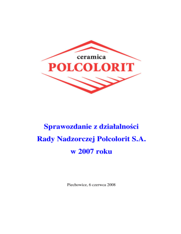 Sprawozdanie z działalności Rady Nadzorczej Polcolorit S.A. w 2007 roku Piechowice, 6 czerwca 2008 Sprawozdanie z działalności Rady Nadzorczej spółki pod firmą Polcolorit S.A. z siedzibą w Piechowicach za okres od 1 stycznia 2007 roku do 31 grudnia 2007 roku I. INFORMACJE OGÓLNE. Rada Nadzorcza od dnia 1 stycznia 2007 r. do 31 grudnia 2007 r. funkcjonowała w następującym składzie; - Janusz Grodziński – przewodniczący od dnia 1 stycznia 2007 r. do 28 czerwca 2007 r. oraz od 27 lipca 2007 r. do 31 grudnia 2007 r.; - Marek Zuber – wiceprzewodniczący; - Jacek Welc – sekretarz; - Barbara Urbaniak Marconi – członek; - Zbigniew Panasiewicz – członek. W okresie sprawozdawczym Rada Nadzorcza obradowała 8 razy na posiedzeniach w dniach: 19 lutego, 6 marca, 27 kwietnia , 20 czerwca, 27 lipca, 5 września, 16 października oraz 18 grudnia 2007 r. Na posiedzeniach Rady Nadzorczej w 2007 roku wiele miejsca poświęcono omawianiu i analizie sytuacji finansowej Polcolorit S.A. i Grupy Kapitałowej Polcolorit oraz ocenie działań Zarządu. Już na pierwszym posiedzeniu w lutym zwrócono uwagę na fakt, że nastąpił wyraźny wzrost zapasów i szybko postępuje wzrost zadłużenia, chociaż wskaźniki płynności finansowej Grupy na początku 2007 roku pozostawały na bezpiecznym poziomie. Zapoznano się także z oceną Zarządu, dotyczącą aktualnej sytuacji w Grupie i sformułowanymi na tym tle założeniami strategii restrukturyzacyjnej. Pozytywnie oceniono założenia strategii. Na kolejnym posiedzeniu zaakceptowano program działań restrukturyzacyjnych i kierunków rozwoju, zwracając przy tym uwagę, że przeniesienie linii produkcyjnej monoporozy wiąże się z wysokim ryzykiem i wymaga sporządzenia szczegółowej ekspertyzy technicznej i oceny kosztów tego przedsięwzięcia. Wyrażono także opinię, że Rada Nadzorcza powinna mieć wpływ na wybór firmy, która przeprowadzi audyt oraz due diligence spółki ukraińskiej, która ma być przedmiotem przejęcia. Na posiedzeniu w kwietniu Rada Nadzorcza zatwierdziła budżet Grupy Kapitałowej Polcolorit na 2007 rok, który zakładał ponad 98,0 mln zł przychodów ze sprzedaży, zysk operacyjny na poziomie prawie 2,3 mln zł i stratę netto ponad 1,9 mln zł. Budżet ten został zrealizowany z nadwyżką tylko w zakresie przychodów ze sprzedaży. Natomiast wynik finansowy znacznie odbiegał od zakładanego w budżecie: na poziomie operacyjnym skonsolidowana strata za cały 2007 rok wyniosła prawie 1,9 mln zł, na poziomie netto skonsolidowana strata wyniosła 5,6 mln zł. W tej sytuacji Rada Nadzorcza negatywnie ocenia realizację budżetu za 2007 rok. 1 W I kwartale 2007 roku Zarząd rozpoczął działania związane z projektem wprowadzenia nowej marki pozycjonowanej w segmencie premium pod nazwą Ceramika Marconi Gold. Projekt zakończył się niepowodzeniem i Rada Nadzorcza negatywnie ocenia przebieg jego realizacji. Na posiedzeniu w dniu 27 lipca 2007 roku poinformowano Radę Nadzorczą, że w Grupie pojawił się problem braku odpowiedniej ilości dekoracji i jest to jedną z przyczyn narastania poziomu zapasów i jednocześnie przyczyną niepełnego wykorzystania możliwości zwiększenia sprzedaży w warunkach dużego popytu na produkty Grupy. Spółka wprawdzie ulokowała zamówienia dekoracji u wykonawcy zewnętrznego, który jednak nie był w stanie sprostać wymaganiom w zakresie terminów, ilości i jakości. Świadczy to o niewłaściwym rozpoznaniu i wyborze kontrahenta, a działania zmierzające do pozyskania nowego producenta dekoracji były w tej sytuacji spóźnione. W przeprowadzonej w końcu września analizie Rada Nadzorcza ustaliła wspólnie z Działem Handlowym, że wartość utraconej sprzedaży wyniosła 18-20 mln zł. W związku z niezadowalającymi wynikami finansowymi Grupy za I półrocze i pismem audytora do Rady Nadzorczej, wskazującym na problemy we współpracy przy przeglądzie sprawozdania finansowego za I półrocze 2007 roku, Rada Nadzorcza uznała, że zachodzi konieczność wzmocnienia czynności nadzorczych, realizowanych przez Radę. Powołano Komitet Audytu oraz Wynagrodzeń. Ponieważ powołanie Komitetu musi być zatwierdzone przez Walne Zgromadzenie akcjonariuszy, uznano za konieczne – zanim to nie nastąpi – oddelegowanie dwóch członków Rady Nadzorczej do wykonywania indywidualnego nadzoru nad działalnością Spółki, w tym w szczególności w zakresie sprawozdawczości finansowej. Na kolejnym posiedzeniu Rady Nadzorczej członkowie oddelegowani do wykonywania indywidualnego nadzoru nad działalnością Spółki przedstawili ogólną ocenę sytuacji finansowej, zwracając przede wszystkim uwagę na: bardzo złą sytuację w zakresie płynności finansowej, bardzo wysoki i wciąż rosnący poziom zapasów i należności. Na posiedzeniu w dniu 5 września 2007 roku Rada Nadzorcza nie wyraziła zgody na zawarcie przez Zarząd umowy z firmą doradczą na obsługę projektu inwestycyjnego na Ukrainie. Wysokość wynagrodzenia dla doradcy w kwocie około 4,5 mln zł oraz niekorzystne dla Polcolorit S.A. zapisy odnośnie praw i obowiązków stron spowodowały w efekcie podjęcie przez Radę Nadzorczą uchwały o nie zatwierdzeniu tej umowy. W III kwartale Grupa Kapitałowa Polcolorit wygenerowała zysk netto. Mogło to wskazywać na fakt, że program restrukturyzacji wdrożony w I kwartale zakończył się powodzeniem. Mimo to Rada Nadzorcza wyraziła zaniepokojenie brakiem poprawy płynności finansowej, a w szczególności rosnącymi zapasami. Stwierdzono ponadto, że zgodnie z wcześniejszymi informacjami Zarządu, popyt na wyroby Grupy jest wyjątkowo duży, a mimo to okazuje się, iż Spółka boryka się z nadmiarem zapasów wyrobów gotowych. Zarząd zadeklarował, że do końca roku zapasy zostaną zmniejszone o ok. 10-15 mln zł. Zobowiązano Zarząd do opracowania programu działań zmierzających do poprawy płynności finansowej. Przedstawiony Radzie 