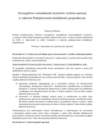 Szczegółowe uzasadnienie kryteriów wyboru operacji w zakresie Podejmowania działalności gospodarczej. Szanowni Państwo Poniżej przedstawiamy Państwu szczegółowe uzasadnienie poszczególnych kryteriów, w oparciu o które Rada Programowa będzie dokonywała oceny i wyboru operacji składanych do LGD, w odpowiedzi na nabór wniosków w zakresie podejmowania działalności gospodarczej. Prosimy o zapoznanie się z poniższymi zapisami. Kryterium nr 1. Liczba nowych miejsc pracy utworzonych w wyniku realizacji projektu. Preferencje dla projektów tworzących więcej niż 1 miejsce pracy w przeliczeniu na pełne etaty średnioroczne, oprócz samozatrudnienia. Samozatrudnienie liczone jest jako utworzenie 1 miejsca pracy (1 pełnoskładkowy etat). W przypadku zatrudnienia pracownika formą zatrudnienia musi być umowa o pracę lub spółdzielcza umowa o pracę. Zgodnie z Rozporządzeniem dot. Wdrażania LSR operacja zakłada podjęcie we własnym imieniu działalności gospodarczej i jej wykonywanie do dnia, w którym upłynie 2 lata od dnia wypłaty płatności końcowej oraz: a) zgłoszenie podmiotu ubiegającego się o przyznanie pomocy do ubezpieczenia emerytalnego, ubezpieczeń rentowych i ubezpieczenia wypadkowego na podstawie przepisów o systemie ubezpieczeń społecznych z tytułu wykonywania tej działalności i podleganie tym ubezpieczeniom do dnia, w którym upłynie 2 lata od dnia wypłaty płatności końcowej, lub b) utworzenie co najmniej jednego miejsca pracy w przeliczeniu na pełne etaty średnioroczne, gdy jest to uzasadnione zakresem realizacji operacji, zatrudnienie osoby, dla której zostanie utworzone to miejsce pracy, na podstawie umowy o pracę, a także utrzymanie utworzonych miejsc pracy do dnia, w którym upłynie 2 lata od dnia wypłaty płatności końcowej. Wnioskodawca jest zobowiązany złożyć Oświadczenie o zobowiązaniu do utworzenia i utrzymania miejsca pracy przez okres związania z celem jeśli zatrudni dodatkowych pracowników za których uzyska w kryterium punkty lub Oświadczenie o utrzymaniu podjętej działalności przez min. 2 lata od otrzymania płatności końcowej. Kryterium nr 2. Innowacyjność operacji. Preferencje dla projektów innowacyjnych w skali gminy oraz wykorzystujących poszczególne dziedziny. Jako innowacyjność rozumie się wdrożenie nowego na danym obszarze lub znacząco udoskonalonego produktu, usługi, procesu, organizacji lub nowego sposobu wykorzystania lub zmodernizowania istniejących lokalnych zasobów przyrodniczych, historycznych, kulturowych czy społecznych. Innowacyjna może być operacja nowatorska, niestandardowa, o eksperymentalnym charakterze, w nietypowy sposób podchodząca do lokalnych zasobów, tradycji, przyczyniających się do pozytywnych zmian na obszarze. Innowacyjne mogą być również operacje w obszarze ochrony środowiska czy przeciwdziałania zmianom klimatycznym a także związanych ze zwalczaniem ubóstwa czy włączeniem społecznym. „Podobny charakter operacji” definiuje się zgodnie ze słownikiem języka polskiego PWN tj. zespół cech właściwych danemu przedmiotowi lub zjawisku, odróżniających je od innych przedmiotów i zjawisk tego samego rodzaju. W sytuacji gdyby choć jedna cecha operacji była odmienna operacja rozumiana będzie jako innowacyjna. Wnioskodawca jest zobowiązany złożyć Oświadczenie, że operacja ma charakter innowacyjny na terenie danej gminy. Kryterium nr 3. Wykorzystanie technologii teleinformatycznych lub związanych z ochroną środowiska czy przeciwdziałania zmianom klimatu. Preferencje dla wnioskodawców wykorzystujących technologie teleinformatyczne lub związane z ochroną środowiska lub przeciwdziałaniem zmianom klimatu. Poprzez technologie teleinformatyczne rozumie się m.in. powstawanie sklepów internetowych lub rozwiązań sprzedaży usług turystycznych przez internet. Wskazanie zakupu wyłącznie sprzętu komputerowego nie jest wykorzystaniem technologii teleinformatycznej. Przez technologie związane z ochroną środowiska lub przeciwdziałanie zmianom klimatu rozumie się m.in. OZE lub technologie przyjazne środowisku. Wnioskodawca jest zobowiązany złożyć Oświadczenie, świadczące o tym, że operacja wykorzystuje technologie teleinformatyczne lub związane z ochroną środowiska czy przeciwdziałaniem zmianom klimatu. Kryterium 4. Zasięg projektu pod względem grupy odbiorców. Preferencje dla operacji uwzględniających zatrudnienie osób z grup defaworyzowanych, zdiagnozowanych w oparciu o konsultacje społeczne. Punkty sumuje się w przypadku zatrudnienia min. 1 osoby z spośród określonych kategorii grup defaworyzowanych. Uszczegółowiono: Warunkiem uzyskania punktów jest zatrudnienie danej osoby na co najmniej ½ etatu. Łączna liczba etatów musi zgadzać się z liczbą etatów określonych w Kryterium nr 1. Bezrobotny rozumiany jest jako osoba długotrwale bezrobotna, której status jest potwierdzony przez Powiatowy Urząd Pracy. Młodzież rozumiana jest jako osoby od 18-35 r. życia ( ukończony rok życia). Osoby w wieku 50+ to mieszkańcy, którzy ukończyli w dniu udziału w operacji 50 lat. (podpisania umowy o pracę). Wnioskodawca jest zobowiązany złożyć Oświadczenie o planowanym zatrudnieniu osób z grupy defaworyzowanych w związku z realizacją operacji. Kryterium 5. Rodzaj beneficjenta. Preferencje dla osób długotrwale bezrobotnych (poświadczenie z PUP) lub młodzieży w wieku 18-35 -ukończony r. życia lub osób o ukończonym 50 r. życia (na podstawie dokumentu tożsamości). Wnioskodawca jest zobowiązany złożyć Oświadczenie z PUP w Zawierciu o posiadaniu statusu długotrwale bezrobotnego lub kopia dowodu osobistego określająca wiek Beneficjenta. Kryterium nr 6. Korzystanie z doradztwa w biurze LGD. Preferencje dla Wnioskodawców korzystających z doradztwa w biurze LGD, co będzie miało przełożenie na wartość merytoryczną wniosku. Ocena dokonywana w oparciu o listy z do