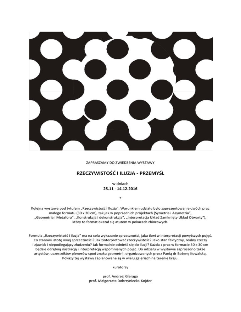 ZAPRASZAMY DO ZWIEDZENIA WYSTAWY RZECZYWISTOŚĆ I ILUZJA - PRZEMYŚL w dniach 25.11 - 14.12.2016 * Kolejna wystawa pod tytułem „Rzeczywistość i Iluzja”. Warunkiem udziału było zaprezentowanie dwóch prac małego formatu (30 x 30 cm), tak jak w poprzednich projektach (Symetria i Asymetria”, „Geometria i Metafora”, „Konstrukcja i dekonstrukcja”, „Interpretacja Układ Zamknięty Układ Otwarty”), który to format okazał się atutem w pokazach zbiorowych. Formuła „Rzeczywistość i iluzja” ma na celu wykazanie sprzeczności, jaka tkwi w interpretacji powyższych pojęć. Co stanowi istotę owej sprzeczności? Jak zinterpretować rzeczywistość? Jako stan faktyczny, realny rzeczy i zjawisk i niepodlegający złudzeniu? Jak formalnie odnieść się do iluzji? Każda z prac w formacie 30 x 30 cm będzie odrębną ilustracją i interpretacją wspomnianych pojęć. Do udziału w wystawie zaproszono także artystów, uczestników plenerów spod znaku geometrii, organizowanych przez Panią dr Bożenę Kowalską. Pokazy tej wystawy zaplanowane są w wielu galeriach na terenie kraju. kuratorzy prof. Andrzej Gieraga prof. Małgorzata Dobrzyniecka-Kojder w wystawie udział biorą ANDRZEJ BANACHOWICZ / ANDRZEJ BATOR / HELLMUT BRUCH / DOMINQE CHAPUIS / LIDIA CHOCZAJ JANUSZ J. CYWICKI / MARIUSZ DAŃSKI / MAŁGORZATA DOBRZYNIECKA-KOJDER ELŻBIETA GAWLIKOWSKA-ŁABĘDZKA / ANDRZEJ GIERAGA / ISTVAN HAASZ / ALEKSANDER HAŁAT ZOLTAN HERMANN / ALEKSANDRA JADCZAK / MICHAŁ KACPERCZYK / MAGDALENA KACPERSKA MIECZYSŁAW KNUT / PIOTR KWAŚNY / ŁUKASZ LESZCZYŃSKI / STANISŁAW ŁABĘDZKI / WIESŁAW ŁUCZAJ MICHAŁ MISIAK / ALEKSANDER OLSZEWSKI / JAN PAMUŁA / MAREK RADKE / ZBIGNIEW ROMAŃCZUK REINHARD ROY / JOLANTA RUDZKA-HABISIAK / ANDRZEJ SŁOWIK / WŁODZIMIERZ STELMASZCZYK KATARZYNA SUCHOCKA / JERZY TRELIŃSKI / BARBARA WARZEŃSKA AGNIESZKA WASIAK / JOANNA ZAK / ERNEST ZAWADA * ZAPRASZAMY www.bwaprzemysl.pl