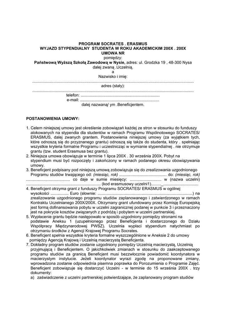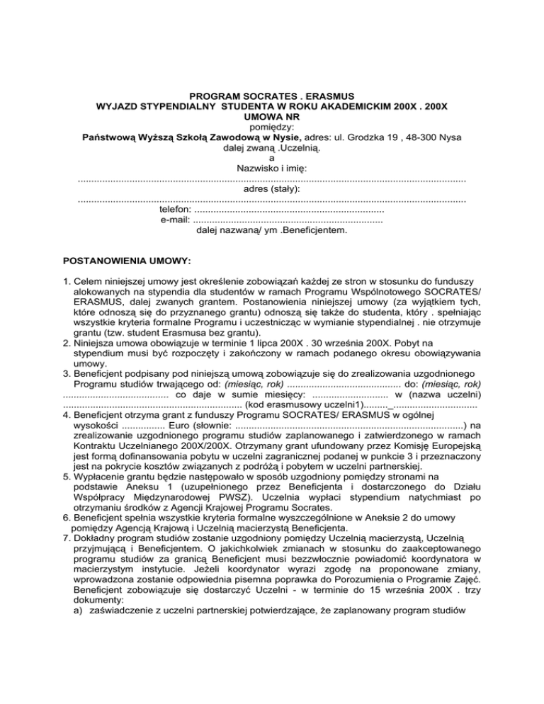 PROGRAM SOCRATES . ERASMUS WYJAZD STYPENDIALNY STUDENTA W ROKU AKADEMICKIM 200X . 200X UMOWA NR pomiędzy: Państwową Wyższą Szkołą Zawodową w Nysie, adres: ul. Grodzka 19 , 48-300 Nysa dalej zwaną .Uczelnią. a Nazwisko i imię: ............................................................................................................................................... adres (stały): ............................................................................................................................................... telefon: ...................................................................... e-mail: ...................................................................... dalej nazwaną/ ym .Beneficjentem. POSTANOWIENIA UMOWY: 1. Celem niniejszej umowy jest określenie zobowiązań każdej ze stron w stosunku do funduszy alokowanych na stypendia dla studentów w ramach Programu Wspólnotowego SOCRATES/ ERASMUS, dalej zwanych grantem. Postanowienia niniejszej umowy (za wyjątkiem tych, które odnoszą się do przyznanego grantu) odnoszą się także do studenta, który . spełniając wszystkie kryteria formalne Programu i uczestnicząc w wymianie stypendialnej . nie otrzymuje grantu (tzw. student Erasmusa bez grantu). 2. Niniejsza umowa obowiązuje w terminie 1 lipca 200X . 30 września 200X. Pobyt na stypendium musi być rozpoczęty i zakończony w ramach podanego okresu obowiązywania umowy. 3. Beneficjent podpisany pod niniejszą umową zobowiązuje się do zrealizowania uzgodnionego Programu studiów trwającego od: (miesiąc, rok) .......................................... do: (miesiąc, rok) ....................................... co daje w sumie miesięcy: ............................ w (nazwa uczelni) .................................................................. (kod erasmusowy uczelni1)........._............................... 4. Beneficjent otrzyma grant z funduszy Programu SOCRATES/ ERASMUS w ogólnej wysokości ................ Euro (słownie: ....................................................................................) na zrealizowanie uzgodnionego programu studiów zaplanowanego i zatwierdzonego w ramach Kontraktu Uczelnianego 200X/200X. Otrzymany grant ufundowany przez Komisję Europejską jest formą dofinansowania pobytu w uczelni zagranicznej podanej w punkcie 3 i przeznaczony jest na pokrycie kosztów związanych z podróżą i pobytem w uczelni partnerskiej. 5. Wypłacenie grantu będzie następowało w sposób uzgodniony pomiędzy stronami na podstawie Aneksu 1 (uzupełnionego przez Beneficjenta i dostarczonego do Działu Współpracy Międzynarodowej PWSZ). Uczelnia wypłaci stypendium natychmiast po otrzymaniu środków z Agencji Krajowej Programu Socrates. 6. Beneficjent spełnia wszystkie kryteria formalne wyszczególnione w Aneksie 2 do umowy pomiędzy Agencją Krajową i Uczelnią macierzystą Beneficjenta. 7. Dokładny program studiów zostanie uzgodniony pomiędzy Uczelnią macierzystą, Uczelnią przyjmującą i Beneficjentem. O jakichkolwiek zmianach w stosunku do zaakceptowanego programu studiów za granicą Beneficjent musi bezzwłocznie powiadomić koordynatora w macierzystym instytucie. Jeżeli koordynator wyrazi zgodę na proponowane zmiany, wprowadzona zostanie odpowiednia pisemna poprawka do Porozumienia o Programie Zajęć. Beneficjent zobowiązuje się dostarczyć Uczelni - w terminie do 15 września 200X . trzy dokumenty: a) zaświadczenie z uczelni partnerskiej potwierdzające, że zaplanowany program studiów został zrealizowany w okresie określonym w punkcie 3 wraz z informacją o uzyskanych zaliczeniach i zdanych egzaminach b) porozumienie o programie zajęć (Learning Agreement) zawarte w Aneksie 4 do niniejszej umowy, potwierdzone przez koordynatora, c) wypełnioną ankietę - sprawozdanie według wzoru zawartego w Aneksie 5 do niniejszej umowy,. 8. W przypadku opóźnienia w dostarczeniu lub nie dostarczenia wymaganych dokumentów, o których mowa powyżej lub w przypadku nie spełniana innych postanowień niniejszej umowy przez Beneficienta, Uczelnia ma prawo do anulowania umowy. Na podstawie Porozumienia o Programie Zajęć oraz dostarczonego wykazu zaliczeń Uczelnia uznaje Beneficjentowi całość bądź część odbytych studiów za granicą. Uczelnia może odmówić zaliczenia w przypadku, kiedy Beneficjent osiągnie niezadowalające wyniki lub nie spełni warunków określonych pomiędzy stronami, jako niezbędne do otrzymania zaliczenia. Niezadowalające osiągnięcia Beneficjenta mogą stanowić podstawę żądania przez Uczelnię części lub całości otrzymanego grantu. Żądanie zwrotu grantu nie będzie miało zastosowania w przypadku zaistnienia przyczyn niezależnych od Beneficjenta, potwierdzonych w formie pisemnej przez Uczelnianego Koordynatora i uznanych za słuszne przez Agencję Krajową Programu SOCRATES/ ERASMUS. 9. Beneficjent oświadcza, że nie otrzymał żadnego innego stypendium lub dofinansowania na pokrycie identycznych kosztów związanych z wyjazdem określonym w pkt. 3 w ramach innych Programów Wspólnotowych (np. Leonardo da Vinci, V Program Ramowy), w ramach innych inicjatyw Komisji Europejskiej lub w ramach innej umowy międzyrządowej. 10. Beneficjent zobowiązuje się (za wyjątkiem przypadku zaistnienia przyczyn niezależnych od Beneficjenta, o których mowa w pkt.7) do: - bezzwłocznego zwrotu na żądanie Uczelni części lub całości otrzymanego grantu w przypadku niewypełnienia jakiegokolwiek zobowiązania wynikającego z niniejszej umowy, - bezzwłocznego zwrotu na żądanie Uczelni części lub całości otrzymanego grantu w przypadku anulowania umowy przez Uczelnię. Wysokość ewentualnego zwrotu określa Uczelnia. 11. Wprowadzenie jakichkolwiek zmian do niniejszej umowy wymaga formy pisemnej. 12. Wszelkie sprawy sporne związane z niniejszą umową będą rozstrzygane zgodnie z prawodawstwem polskim. 13. Beneficjent oświadcza, że nie studiował za granic