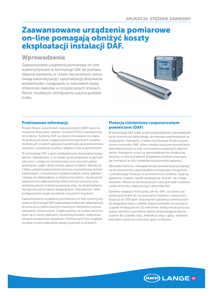 APLIKACJA: STĘŻENIE ZAWIESINY Zaawansowane urządzenia pomiarowe on-line pomagają obniżyć koszty eksploatacji instalacji DAF. Wprowadzenie Zaawansowane urządzenia pomiarowe on-line wykorzystywane w technologii DAF do pomiaru stężenia zawiesiny w czasie rzeczywistym umożliwiają automatyzację i optymalizację dozowania polielektrolitu i koagulantu w warunkach dużej zmienności ładunku w oczyszczanych ściekach. Wynik: możliwość zmniejszenia zużycia polielektrolitu. Podstawowe informacje Proces flotacji powietrzem rozpuszczonym (DAF) służy do usuwania tłuszczów, olejów i smarów (FOG) orazzawiesiny ze ścieków. Systemy DAF są często stosowane na etapie do podczyszczania i zagęszczania biologicznych osadów ściekowych w takich gałęziach przemysłu jak przetwórstwo żywności, produkcja celulozy i papieru oraz w petrochemii. W technologii DAF często niezbędne jest stosowanie koagulantów i flokulantów, a ich dawki są utrzymywane w górnym zakresie z uwagi na charakterystyczne dla tych gałęzi przemysłu, nagłe i duże zmiany jakości ścieków. Wynika to z faktu ustalania parametrów procesu na podstawie testów zlewkowych z chwilowych próbek ścieków, które odzwierciedlają ich skład jedynie w momencie poboru. Konieczność zapewnienia odpowiedniej efektywności procesu przy zmiennej jakości ścieków powoduje więc, że eksploatatorzy stosują zawyżone dawki koagulantów i flokulantów. Takie postępowanie wiąże się jednak z wysokimi kosztami. Zaawansowane urządzenia pomiarowe on-line wykorzystywane w technologii DAF zapewniają możliwość optymalizacji procesu przy jednoczesnym znacznym obniżeniu zużycia substancji chemicznych. Ciągłe pomiary w czasie rzeczywistym są w stanie zapewnić zautomatyzowane i zoptymalizowane podawanie związków chemicznych bez względu na duże zmiany ładunków zanieczyszczeń w ściekach. Flotacja ciśnieniowa rozpuszczonym powietrzem (DAF) W technologii DAF ścieki w pierwszej kolejności wprowadzane są do mieszacza statycznego, do którego wprowadzane są koagulanty i flokulanty, a także recyrkulacja (ścieki oczyszczone na drodze DAF, które zostały nasycone powietrzem atmosferycznym) w celu wytworzenia większych aglomeratów. Następnie ścieki są wprowadzane do podłużnej komory, w której prędkość przepływu ścieków znacząco się zmniejsza w celu zwiększenia potencjału separacji. Wewnątrz komory, mikropęcherzyki powietrza przyczepiają się do powierzchni aglomeratów zmniejszając ich gęstość i umożliwiając flotację na powierzchnię ścieków, skąd są zgarniane. Ciężkie cząstki osadzają się na dnie i są z niego usuwane. Wolna od zanieczyszczeń ciecz jest stale usuwana z kilku króćców odpływowych zbiornika DAF. Systemy separacji flotacyjnej, jak np. DAF, są zazwyczaj wykorzystywane do oczyszczania ścieków o zawartości tłuszczu do 300 ppm. Dozowanie substancji chemicznych do koagulacji oleju i cząstek stałych pozwala na usunięcie cząstek mniejszych niż 10 mikronów. Efektywność procesu zależy od wielu czynników, takich jak przyleganie pęcherzyków do cząstek oleju, interakcja oleju i gazu, wielkość kłaczków zawiesiny oraz ilość gazu w kłaczku. APLIKACJA: STĘŻENIE ZAWIESINY Eksploatatorzy podejmują wiele działań w celu optymalizacji procesu DAF, a zwłaszcza zmniejszenia zużycia polimerów z uwagi na ich duży koszt. Stężenie wykorzystywanych flokulantów zwykle wynosi od 100 do 500 mg/L. Przykładowo jeżeli przepływ dobowy jest równy 4.000 m3, to przy stężeniu środków chemicznych w dopływie na poziomie 40 ppm, dobowe ich zużycie wynosi 160 kg. Zakładając koszt środków chemicznych na poziomie 3 €/kg, koszt procesu oczyszczania wynosi 175.500 € rocznie. Zmniejszenie zużycia tylko o kilka punktów procentowych może przyczynić się do znacznego obniżenia kosztów. Automatyczne precyzyjne dozowanie środków chemicznych może być trudne Powszechnie stosowane są systemy pomiaru wartości pH i automatycznej jej korekty poprzez sterowanie pompami dozującymi kwas lub zasadę. Dozowanie polimerów i koagulantów natomiast zwykle bazuje na ręcznych nastawach dawki, na podstawie wyników okresowo wykonywanych testów zlewkowych. Znalezienie niezawodnych systemów automatycznego dozowania koagulantów i flokulantów do instalacji DAF nastręczało wielu problemów z uwagi na gwałtowne zmiany ładunku dopływających zanieczyszczeń w czasie kilku minut. Dawki są więc znacząco zawyżane, by w przypadku dopływu dużego ładunku zanieczyszczeń zapewnić wymaganą efektywność procesu. Gdy ładunek związków organicznych w dopływających ściekach jest niski, stosowanie zbyt wysokiej dawki chemikaliów skutkuje marnotrawstwem pieniędzy. Automatyczne dawkowanie Dotychczas w przypadku technologii DAF polegano głównie na wynikach uzyskiwanych z próbek chwilowych, w których określano stężenie zawiesiny. Obecnie nowe urządzenia pomiarowe on-line zapewniają dokładne pomiary w czasie rzeczywistym, eliminując w ten sposób potrzebę stosowania sporadycznej i czasochłonnej analizy. Obecnie operatorzy instalacji DAF mogą wykorzystywać urządzenia mierzące stężenie zawiesiny SOLITAX sc lub TSS sc z przetwornikami SC 200, w celu dokładnego i bieżącego pomiaru stężenia zawiesiny w ściekach wprowadzanych do instalacji DAF i wykorzystania tych danych do automatycznego dozowania środków chemicznych. Sygnał z czujnika jest przesyłany do systemu DCS lub SCADA z wykorzystaniem sygnału wyjściowego 4–20 mA z przetwornika lub komunikacji Profibus. System DCS/SCADA na podstawie natężenia przepływu mierzonego w czasie rzeczywistym, odczytów czujnika oraz przepływu i stężenia polimeru oblicza i reguluje natężenie przepływu polimeru lub koagulantu, aby stale osiągana była założona wartość zadana w kg polimeru na tonę suchej masy osadu. Cel: obniżenie zużycia środków chemicznych W większości i
