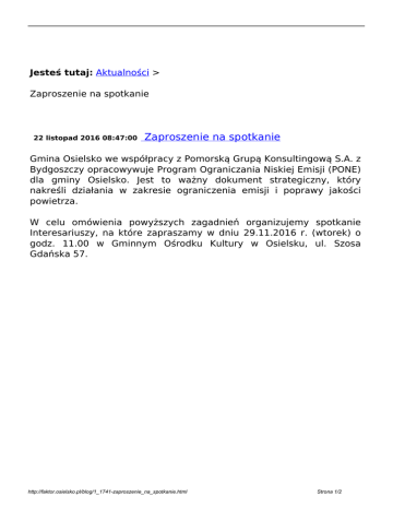 Jesteś tutaj: Aktualności > Zaproszenie na spotkanie 22 listopad 2016 08:47:00 Zaproszenie na spotkanie Gmina Osielsko we współpracy z Pomorską Grupą Konsultingową S.A. z Bydgoszczy opracowywuje Program Ograniczania Niskiej Emisji (PONE) dla gminy Osielsko. Jest to ważny dokument strategiczny, który nakreśli działania w zakresie ograniczenia emisji i poprawy jakości powietrza. W celu omówienia powyższych zagadnień organizujemy spotkanie Interesariuszy, na które zapraszamy w dniu 29.11.2016 r. (wtorek) o godz. 11.00 w Gminnym Ośrodku Kultury w Osielsku, ul. Szosa Gdańska 57. http://faktor.osielsko.pl/blog/1_1741-zaproszenie_na_spotkanie.html Strona 1/2 drukuj Wróć http://faktor.osielsko.pl/blog/1_1741-zaproszenie_na_spotkanie.html Powered by TCPDF (www.tcpdf.org) Strona 2/2
