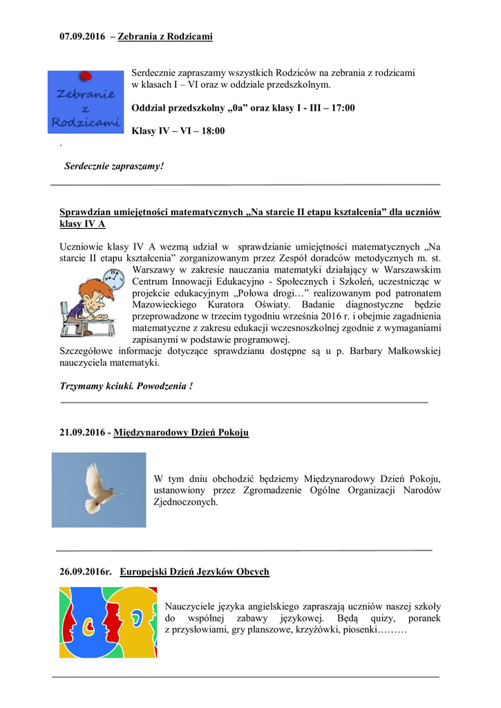 07.09.2016 – Zebrania z Rodzicami Serdecznie zapraszamy wszystkich Rodziców na zebrania z rodzicami w klasach I – VI oraz w oddziale przedszkolnym. Oddział przedszkolny „0a” oraz klasy I - III – 17:00 Klasy IV – VI – 18:00 . Serdecznie zapraszamy! Sprawdzian umiejętności matematycznych „Na starcie II etapu kształcenia” dla uczniów klasy IV A Uczniowie klasy IV A wezmą udział w sprawdzianie umiejętności matematycznych „Na starcie II etapu kształcenia” zorganizowanym przez Zespół doradców metodycznych m. st. Warszawy w zakresie nauczania matematyki działający w Warszawskim Centrum Innowacji Edukacyjno - Społecznych i Szkoleń, uczestnicząc w projekcie edukacyjnym „Połowa drogi…” realizowanym pod patronatem Mazowieckiego Kuratora Oświaty. Badanie diagnostyczne będzie przeprowadzone w trzecim tygodniu września 2016 r. i obejmie zagadnienia matematyczne z zakresu edukacji wczesnoszkolnej zgodnie z wymaganiami zapisanymi w podstawie programowej. Szczegółowe informacje dotyczące sprawdzianu dostępne są u p. Barbary Małkowskiej nauczyciela matematyki. Trzymamy kciuki. Powodzenia ! 21.09.2016 - Międzynarodowy Dzień Pokoju W tym dniu obchodzić będziemy Międzynarodowy Dzień Pokoju, ustanowiony przez Zgromadzenie Ogólne Organizacji Narodów Zjednoczonych. 26.09.2016r. Europejski Dzień Języków Obcych Nauczyciele języka angielskiego zapraszają uczniów naszej szkoły do wspólnej zabawy językowej. Będą quizy, poranek z przysłowiami, gry planszowe, krzyżówki, piosenki………