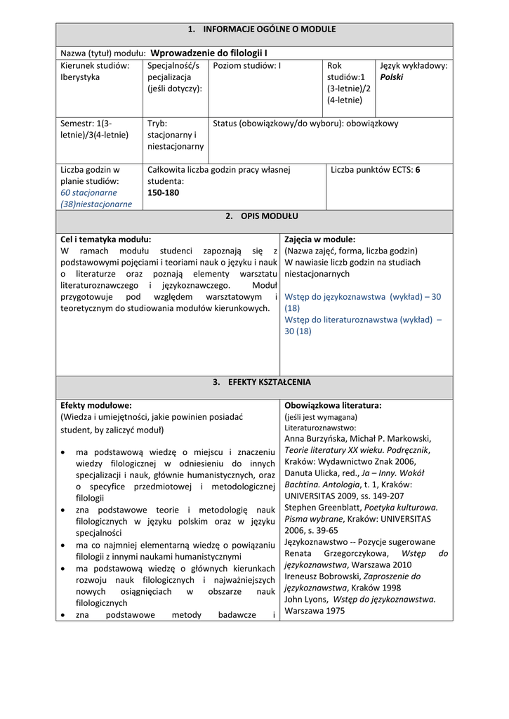 1. INFORMACJE OGÓLNE O MODULE Nazwa (tytuł) modułu: Wprowadzenie do filologii I Kierunek studiów: Specjalność/s Poziom studiów: I Iberystyka pecjalizacja (jeśli dotyczy): Rok studiów:1 (3-letnie)/2 (4-letnie) Język wykładowy: Polski Semestr: 1(3letnie)/3(4-letnie) Tryb: Status (obowiązkowy/do wyboru): obowiązkowy stacjonarny i niestacjonarny Liczba godzin w planie studiów: 60 stacjonarne (38)niestacjonarne Całkowita liczba godzin pracy własnej studenta: 150-180 Liczba punktów ECTS: 6 2. OPIS MODUŁU Cel i tematyka modułu: W ramach modułu studenci zapoznają się z podstawowymi pojęciami i teoriami nauk o języku i nauk o literaturze oraz poznają elementy warsztatu literaturoznawczego i językoznawczego. Moduł przygotowuje pod względem warsztatowym i teoretycznym do studiowania modułów kierunkowych. Zajęcia w module: (Nazwa zajęć, forma, liczba godzin) W nawiasie liczb godzin na studiach niestacjonarnych Wstęp do językoznawstwa (wykład) – 30 (18) Wstęp do literaturoznawstwa (wykład) – 30 (18) 3. EFEKTY KSZTAŁCENIA Efekty modułowe: (Wiedza i umiejętności, jakie powinien posiadać student, by zaliczyć moduł) ma podstawową wiedzę o miejscu i znaczeniu wiedzy filologicznej w odniesieniu do innych specjalizacji i nauk, głównie humanistycznych, oraz o specyfice przedmiotowej i metodologicznej filologii zna podstawowe teorie i metodologię nauk filologicznych w języku polskim oraz w języku specjalności ma co najmniej elementarną wiedzę o powiązaniu filologii z innymi naukami humanistycznymi ma podstawową wiedzę o głównych kierunkach rozwoju nauk filologicznych i najważniejszych nowych osiągnięciach w obszarze nauk filologicznych zna podstawowe metody badawcze i Obowiązkowa literatura: (jeśli jest wymagana) Literaturoznawstwo: Anna Burzyńska, Michał P. Markowski, Teorie literatury XX wieku. Podręcznik, Kraków: Wydawnictwo Znak 2006, Danuta Ulicka, red., Ja – Inny. Wokół Bachtina. Antologia, t. 1, Kraków: UNIVERSITAS 2009, ss. 149-207 Stephen Greenblatt, Poetyka kulturowa. Pisma wybrane, Kraków: UNIVERSITAS 2006, s. 39-65 Językoznawstwo -- Pozycje sugerowane Renata Grzegorczykowa, Wstęp do językoznawstwa, Warszawa 2010 Ireneusz Bobrowski, Zaproszenie do językoznawstwa, Kraków 1998 John Lyons, Wstęp do językoznawstwa. Warszawa 1975 interpretacyjne, mające zastosowanie do tekstów użytkowych, literackich i naukowych studiowanego języka umie samodzielnie zdobywać wiedzę z wykorzystaniem słowników, leksykonów oraz innych tradycyjnych i multimedialnych źródeł informacji potrafi wyszukiwać, analizować, oceniać i selekcjonować informacje z różnych źródeł (U3) potrafi właściwie korzystać ze zdobytej wiedzy przedmiotowej w celu formułowania i analizy problemów badawczych oraz w celu uzasadniania swoich wyborów potrafi rozpoznawać i oceniać procesy i zjawiska językowe, literackie i kulturowe na podstawie uzyskanej wiedzy i z wykorzystaniem standardowych metod i narzędzi wykorzystywanych w badaniach filologicznych potrafi skutecznie posługiwać się poznanymi metodami i narzędziami właściwymi dla kierunku filologicznego potrafi właściwie analizować przyczyny i przebieg konkretnych zjawisk językowych, literackich i kulturowych posługuje się głównymi teoriami z zakresu języka, literatury i kultury, paradygmatami badawczymi studiowanej specjalności w typowych sytuacjach społecznych potrafi samodzielnie, analitycznie i krytycznie interpretować językowe i literackie teksty i zjawiska kulturowe Witold. Maciejewski,. Świat języków. Wielka Encyklopedia Geografii Świata t. XIV. Poznań1999 Majewicz, Alfred. Języki świata i ich klasyfikowanie. Warszawa1989. Tadeusz Milewski, Językoznawstwo. Warszawa, 2004 [1965] Kazimierz Polański, (red.).. Encyklopedia językoznawstwa ogólnego Wrocław 1995 Adam Weinsberg, Językoznawstwo ogólne. Warszawa 1983.