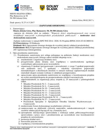 MISTO JELENIA GÓRA Plac Ratuszowy nr 58 58-500 Jelenia Góra Jelenia Góra, 09.02.2017 r. Znak sprawy: E.271.4.3.2017 ZAPYTANIE OFERTOWE 1. Zamawiający: Miasto Jelenia Góra, Plac Ratuszowy 58, 58-500 Jelenia Góra zaprasza do złożenia ofert na zadanie: "Wsparcie dzieci niepełnosprawnych oraz wzrost kwalifikacji nauczycieli w jeleniogórskich przedszkolach publicznych” - moderator sieci doskonalenia nauczycieli. Zadanie realizowane w ramach RPO WD 2014- 2020, Nr Projektu RPDS.10.01.03-02-0005/16 Oś Priorytetowa: 10 Edukacja Działanie 10.1 Zapewnienie równego dostępu do wysokiej jakości edukacji przedszkolnej Poddziałanie 10.1.3 Zapewnienie równego dostępu do wysokiej jakości edukacji przedszkolnej ZIT Aglomeracji Jeleniogórskiej. 2. Opis przedmiotu zamówienia: 2.1. Przedmiotem zamówienia jest usługa polegająca na pełnieniu funkcji moderatora sieci doskonalenia nauczycieli, którego zakres działań obejmuje m.in.: a) uruchomienie i organizację działania sieci; b) przygotowanie planu dziania sieci współpracy i samokształcenia zgodnego z potrzebami zgłoszonymi przez uczestników; c) organizację 8 spotkań (przygotowanie i prowadzenie), z czego 5 spotkań poprowadzi sam moderator sieci, 3 spotkania – szkolenia warsztatowe poprowadzi metodyk/ekspert z określonych dziedzin w ramach realizacji zaplanowanych działań (metodyk/ ekspert zostanie wybrany w odrębnym postępowaniu); d) opracowanie opisu przedmiotu zamówienia we współpracy z koordynatorem projektu na wybór metodyka/eksperta do przeprowadzenia szkoleń warsztatowych; e) odpowiedzialność za organizację pracy zespołu tj. 25 nauczycieli z jeleniogórskich OWP: Miejskie Przedszkole Nr 2 – 2 nauczycieli; Miejskie Przedszkole Nr 4 – 2 nauczycieli; Miejskie Przedszkole Nr 10 – 3 nauczycieli Miejskie Przedszkole Nr 11 – 2 nauczycieli; Miejskie Przedszkole Nr 13 – 2 nauczycieli; Miejskie Przedszkole Nr 19 – 3 nauczycieli; Miejskie Integracyjne Przedszkole Nr 14 – 5 nauczycieli; Miejskie Przedszkole Nr 27 – 2 nauczycieli; Przedszkole Specjalne w Specjalnym Ośrodku Szkolno Wychowawczym – 4 nauczycieli. f) moderowanie forum dyskusyjnego na platformie cyfrowej; g) zamieszczanie na platformie cyfrowej materiałów samokształceniowych i innych zasobów edukacyjnych łączących się z tematyką sieci; h) sporządzenie miesięcznego sprawozdania z realizacji zadań, półrocznego/rocznego sprawozdania z pracy sieci i przedstawienia go uczestnikom oraz koordynatorowi projektu do zatwierdzenia; i) promocję działań sieci; j) kierowanie pracami sieci; k) współpracę z koordynatorem projektu; ____________________________________________________________________________________________________________ "Wsparcie dzieci niepełnosprawnych oraz wzrost kwalifikacji nauczycieli w jeleniogórskich przedszkolach publicznych” – moderator sieci doskonalenia nauczycieli 1 l) zapewnienie optymalnych warunków dla uczenia się i wymiany doświadczeń uczestników sieci – nauczycieli przedszkoli biorących udział w projekcie; m) zapewnienie przestrzeni na aktywność uczestników odpowiednią do ich potrzeb i potencjału; n) stosowanie w dokumentacji wytycznych objętych projektem RPO WD, w tym właściwych oznaczeń i logotypów Projektu. 2.2. Planowana ilość godzin pracy moderatora sieci współpracy i samokształcenia wynosi średniomiesięcznie 40 godz. (w projekcie godzin do wykonania jest 580h) w tym: spotkania uczestników sieci (planowanych jest 5 spotkań każde po 2 godziny), które poprowadzi moderator sieci. Z każdego ze spotkań moderator sieci jest zobowiązany przygotować informację dotyczącą ich przebiegu i rezultatów, która to informacja, po zatwierdzeniu przez koordynatora projektu, zostanie zamieszczona na platformie cyfrowej. 2.3. Spotkania będą się odbywać w przedszkolach lub sali konferencyjnej Urzędu Miasta Jeleniej Góry. 2.4 Współpraca w ramach sieci będzie odbywać się także za pomocą forów wymiany doświadczeń. 2.5 Źródłem weryfikacji wskaźnika będzie raport własny sporządzony przez moderatora sieci z przebiegu realizacji działań zaplanowanych w ramach sieci pn.: "Specjalne potrzeby edukacyjne" i wypracowanych rezultatów. Raport zostanie umieszczony na platformie internetowej. 2.6 Opis przedmiotu zamówienia został szczegółowo opisany w załączniku nr 3 do zapytania ofertowego. 3. Termin realizacji zamówienia: od dnia podpisania umowy do 13.04.2018 r. (w tym przerwa w miesiącu sierpniu 2017 r.) Wykonawca w terminie nie dłuższym niż 14 dni od podpisania umowy, zobowiązany jest przedłożyć i uzgodnić z Zamawiającym harmonogram, który w szczególności ma obejmować plan przeprowadzenia spotkań). 4. Miejsce i termin złożenia oferty: Urząd Miasta Jelenia Góra – Wydział Inwestycji Zamówień Publicznych, ul. Sudecka 29, 58-500 Jelenia Góra, pokój 25 w terminie do 15.02.2017 r. do godz. 10:00. 5. Termin otwarcia ofert: 15.02.2017 r. godz. 10:30. 6. Warunki udziału w postępowaniu: Zamawiający wymaga, aby osoba pełniąca funkcję moderatora sieci posiadała: a) co najmniej 6 miesięczne doświadczenie w pracy z radami pedagogicznymi; b) doświadczenie w wdrożeniu co najmniej jednej (1) innowacji pedagogicznej; [Przez „innowacje pedagogiczne” rozumie się m.in. wprowadzenie nowych rozwiązań w dziedzinie pedagogicznej, zmian struktury systemu szkolnego (dydaktycznego, wychowawczego) – które wpływają na polepszenie wyników działalności]. c) znajomość technologii IT w zakresie umożliwiającym realizację przedmiotowego zamówienia, w szczególności umiejętność pracy na platformie cyfrowej. Na potwierdzenie spełnienia przedmiotowego warunku udziału w postępowaniu Wykonawca złoży oświadczenie na formularzu oferty. ____________________________________________________________________________________________________________ "Wsparcie dzieci niepełnosprawnych oraz wzrost kwalifikacji nauczycieli w je