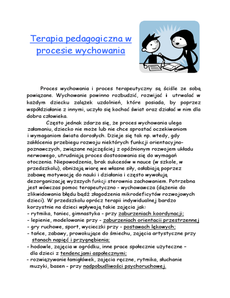 Terapia pedagogiczna w procesie wychowania Proces wychowania i proces terapeutyczny są ściśle ze sobą powiązane. Wychowanie powinno rozbudzić, rozwijać i utrwalać w kaŜdym dziecku zaląŜek uzdolnień, które posiada, by poprzez współdziałanie z innymi, uczyło się kochać świat oraz działać w nim dla dobra człowieka. Często jednak zdarza się, Ŝe proces wychowania ulega załamaniu, dziecko nie moŜe lub nie chce sprostać oczekiwaniom i wymaganiom świata dorosłych. Dzieje się tak np. wtedy, gdy zakłócenia przebiegu rozwoju niektórych funkcji orientacyjnopoznawczych, związane najczęściej z opóźnionym rozwojem układu nerwowego, utrudniają proces dostosowania się do wymagań otoczenia. Niepowodzenia, brak sukcesów w nauce (w szkole, w przedszkolu), obniŜają wiarę we własne siły, osłabiają poprzez zabawę motywację do nauki i działania i często wywołują dezorganizację wyŜszych funkcji sterownia zachowaniem. Potrzebna jest wówczas pomoc terapeutyczno - wychowawcza (dąŜenie do zlikwidowania błędu bądź złagodzenia mikrodeficytów rozwojowych dzieci). W przedszkolu oprócz terapii indywidualnej bardzo korzystnie na dzieci wpływają takie zajęcia jak: - rytmika, taniec, gimnastyka - przy zaburzeniach koordynacji; - lepienie, modelowanie przy - zaburzeniach orientacii przestrzennej - gry ruchowe, sport, wycieczki przy - postawach lękowych; - tańce, zabawy, prowokujące do śmiechu, zajęcia artystyczne przy stanach napięć i przygnębienia; - hodowle, zajęcia w ogródku, inne prace społecznie uŜyteczne – dla dzieci z tendencjami aspołecznymi; - rozwiązywanie łamigłówek, zajęcia ręczne, rytmika, słuchanie muzyki, basen - przy nadpobudliwości psychoruchowej.