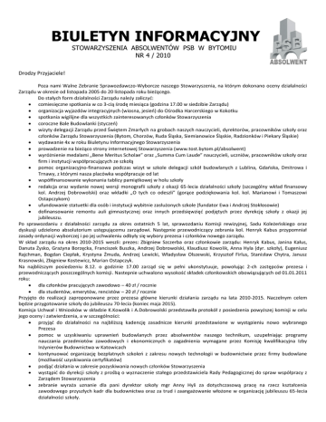 BIULETYN INFORMACYJNY STOWARZYSZENIA ABSOLWENTÓW PSB W BYTOMIU NR 4 / 2010 Drodzy Przyjaciele! Poza nami Walne Zebranie Sprawozdawczo-Wyborcze naszego Stowarzyszenia, na którym dokonano oceny działalności Zarządu w okresie od listopada 2005 do 20 listopada roku bieżącego. Do stałych form działalności Zarządu należy zaliczyd: comiesięczne spotkania w co 3-cią środę miesiąca (godzina 17.00 w siedzibie Zarządu) organizacja wyjazdów integracyjnych (wiosna, jesieo) do Ośrodka Harcerskiego w Kokotku spotkania wigilijne dla wszystkich zainteresowanych członków Stowarzyszenia coroczne Bale Budowlanki (styczeo) wizyty delegacji Zarządu przed Świętem Zmarłych na grobach naszych nauczycieli, dyrektorów, pracowników szkoły oraz członków Zarządu Stowarzyszenia (Bytom, Chorzów, Ruda Śląska, Siemianowice Śląskie, Radzionków i Piekary Śląskie) wydawanie 4x w roku Biuletynu Informacyjnego Stowarzyszenia prowadzenie na bieżąco strony internetowej Stowarzyszenia (www.tost.bytom.pl/absolwent) wyróżnienie medalami „Bene Meritus Scholae” oraz „Summa Cum Laude” nauczycieli, uczniów, pracowników szkoły oraz firm i instytucji współpracujących ze szkołą pomoc organizacyjno-finansowa podczas wizyt w szkole delegacji szkół budowlanych z Lublina, Gdaoska, Dmitrowa i Trnawy, z którymi nasza placówka współpracuje od lat współfinansowanie wykonania tablicy pamiątkowej w holu szkoły redakcja oraz wydanie nowej wersji monografii szkoły z okazji 65-lecia działalności szkoły (szczególny wkład finansowy kol. Andrzej Dobrowolski) oraz wkładki „O tych co odeszli” (gorące podziękowania kol. kol. Marianowi i Tomaszowi Ostapczykom) ufundowanie statuetki dla osób i instytucji wybitnie zasłużonych szkole (fundator Ewa i Andrzej Stokłosowie) dofinansowanie remontu auli gimnastycznej oraz innych przedsięwzięd podjętych przez dyrekcję szkoły z okazji jej jubileuszu. Po sprawozdaniu z działalności zarządu za okres ostatnich 5 lat, sprawozdaniu Komisji rewizyjnej, Sadu Koleżeoskiego oraz dyskusji udzielono absolutorium ustępującemu zarządowi. Następnie przewodniczący zebrania kol. Henryk Kabus przypomniał zasady ordynacji wyborczej i po jej uchwaleniu odbyły się wybory prezesa i członków nowego zarządu. W skład zarządu na okres 2010-2015 weszli: prezes: Zbigniew Szczerba oraz członkowie zarządu: Henryk Kabus, Janina Kałus, Danuta Żysko, Grażyna Borzęcka, Franciszek Buszka, Andrzej Dobrowolski, Klaudiusz Kowolik, Anna Hyla (dyr. szkoły), Eugeniusz Rajchman, Bogdan Ciepłak, Krystyna Żmuda, Andrzej Lewicki, Władysław Olszewski, Krzysztof Firlus, Stanisław Chytra, Janusz Krasnowski, Zbigniew Kostewicz, Marian Ostapczyk. Na najbliższym posiedzeniu 8.12. o godzinie 17.00 zarząd się w pełni ukonstytuuje, powołując 2-ch zastępców prezesa i przewodniczących poszczególnych komisji. Nastepnie uchwalono wysokośd składek członkowskich obowiązujących od 01.01.2011 roku: dla członków pracujących zawodowo – 40 zł / rocznie dla studentów, emerytów, rencistów – 20 zł / rocznie Przyjęto do realizacji zaproponowane przez prezesa główne kierunki działania zarządu na lata 2010-2015. Naczelnym celem będzie przygotowanie szkoły do jubileuszu 70-lecia (koniec maja 2015). Komisja Uchwał i Wniosków w składzie K.Kowolik i A.Dobrowolski przedstawiła protokół z posiedzenia powyższej komisji w celu jego oceny i zatwierdzenia, a w szczególności: przyjąd do działalności na najbliższą kadencję zasadnicze kierunki przedstawione w wystąpieniu nowo wybranego Prezesa pomoc w uzyskiwaniu uprawnieo budowlanych przez absolwentów naszego technikum, uzupełniając programy nauczania przedmiotów zawodowych i ekonomicznych o zagadnienia wymagane przez Komisję kwalifikacyjna Izby Inżynierów Budownictwa w Katowicach kontynuowad organizację bezpłatnych szkoleo z zakresu nowych technologii w budownictwie przez firmy budowlane (możliwośd uzyskiwania certyfikatów) podjąd działania w zakresie pozyskiwania nowych członków Stowarzyszenia wystąpid do dyrekcji szkoły z prośbą o wyznaczenie stałego przedstawiciela Rady Pedagogicznej do spraw współpracy z Zarządem Stowarzyszenia zebranie wyraża uznanie dla pani dyrektor szkoły mgr Anny Hyli za dotychczasową pracę na rzecz kształcenia zawodowego przyszłych kadr dla budownictwa oraz za trud i zaangażowanie włożone w organizację jubileuszu 65-lecia działalności szkoły. Ostatnim akcentem posiedzenia był wspólny obiad uczestników w restauracji „U Młynarza”. Powoli zbliża się zakooczenie roku kalendarzowego i stąd moje zaproszenie skierowane do wszystkich zainteresowanych abyśmy spotkali się jak najliczniej na naszej absolwenckiej kolacji wigilijnej, która została zaplanowana na 20 grudnia na godzinę 17.00. Zainteresowani winni swój zamiar zgłosid w sekretariacie szkoły u kol. Danuty Żyśko najpóźniej do godziny 12.00 w dniu spotkania. Koszt kolacji wigilijnej skalkulowano na 35zł. 15 stycznia już 2011 roku odbędzie się kolejny jubileuszowy Bal Budowlanki – o godzinie 20.00 w auli szkolnej Program Balu jak zawsze bardzo atrakcyjny, a w szczególności: 5 osobowy zespół muzyczny złożony z profesjonalnych muzyków konkursy i loteria – prowadzone przez wodzireja smaczne i obfite jedzenie wyjątkowy nastrój pokazy taneczne Koszt uczestnictwa 125 zł od osoby – niezmiennie od 5-ciu lat. podobnie jak w przypadku spotkania wigilijnego, zainteresowani udziałem w Balu winni jak najszybciej zgłosid się u koleżanki D. Żyśko w sekretariacie szkoły. Zbliżają się Święta Bożego Narodzenia i chciałbym z tej wyjątkowej okazji życzyd aby były one zdrowe, radosne, pogodne oraz mile spędzone w gronie rodziny. Życzę aby Nowy Rok przyniósł Wam wiele szczęścia i satysfakcji w pracy zawodowej i społecznej. Zbigniew Szczerba prezes Bytom 01.12.2010. KONTO STOWARZYSZENIA ABSOLWENTÓW PSB W BYTOMIU PKO BP ODDZIA