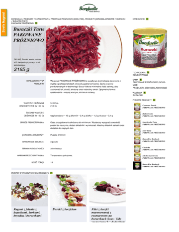 BONDUELLE / PRODUKTY / KONSERWOWE / PAKOWANE PRÓŻNIOWO (SOUS-VIDE), PRODUKTY JEDNOSKŁADNIKOWE / BURACZKI / BURACZKI TARTE PAKOWANE PRÓŻNIOWO OPAKOWANIE Buraczki Tarte PAKOWANE PRÓŻNIOWO SKŁAD: Buraki, woda, cukier, sól, kwasek cytrynowy, ocet spirytusowy. 2185 g TECHNOLOGIA KONSERWOWE CHARAKTERYSTYKA PRODUKTU: Warzywa PAKOWANE PRÓŻNIOWO to wyjątkowa technologia stworzona z myślą o profesjonalistach z branży gastronomicznej. Gama warzyw produkowanych w technologii Sous-Vide to minimalna ilość zalewy, aby zachować ich jakość, teksturę oraz naturalny smak. Optymalny format opakowania – więcej warzyw, minimum zalewy. GAMA PAKOWANE PRÓŻNIOWO (SOUSVIDE) PRODUKTY JEDNOSKŁADNIKOWE WARZYWA BURACZKI PODOBNE PRODUKTY WARTOŚCI ODŻYWCZE I ENERGETYCZNE (W 100 G): ŚREDNIE WARTOŚCI ODŻYWCZE (W 100 G): SPOSÓB PRZYGOTOWANIA: 51 KCAL 213 KJ węglowodany – 10 g; błonnik – 2,4 g; białko – 1,2 g; tłuszcz – 0,1 g Czas przygotowania skrócony do minimum. Wystarczy wysypać zawartość puszki do naczynia, dodać składniki i wymieszać. Idealny składnik sałatek oraz dodatek do ciepłych dań. JEDNOSTKA SPRZEDAŻY: Puszka 3100 ml OPAKOWANIE ZBIORCZE: 3 puszki TERMIN PRZYDATNOŚCI: 30 miesięcy WARUNKI PRZECHOWYWANIA: ILOŚĆ PORCJI: Czerwona Fasola PAKOWANA PRÓŻNIOWO Buraczki w Kostkach PAKOWANE PRÓŻNIOWO Cieciorka PAKOWANA PRÓŻNIOWO Temperatura pokojowa. Młoda Marchewka PAKOWANA PRÓŻNIOWO 18 Buraki z boczkiem Marchewka Tarta PAKOWANA PRÓŻNIOWO Seler Tarty PAKOWANY PRÓŻNIOWO Buraczki w Kostkach PAKOWANE PRÓŻNIOWO PRZEPISY Z WYKORZYSTANIEM PRODUKTU Ragout z jelenia z kopytkami, kurkami, bryndzą i buraczkami Biała Fasola PAKOWANA PRÓŻNIOWO Filet z kaczki marynowanej z rozmarynem na buraczkach Sous- Vide zasmażanych z dodatkiem All rights reserved projekt i realizacja Copyright © 2012-2015 Bonduelle Agencja Reklamowa 4 ALL